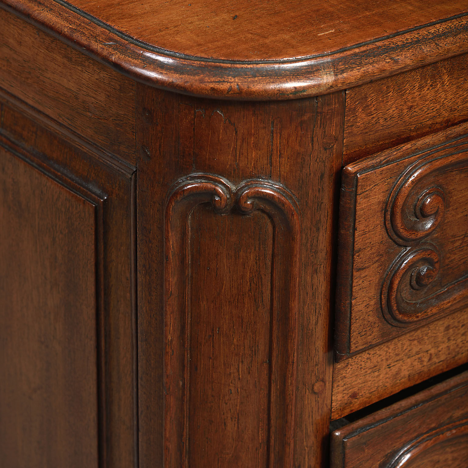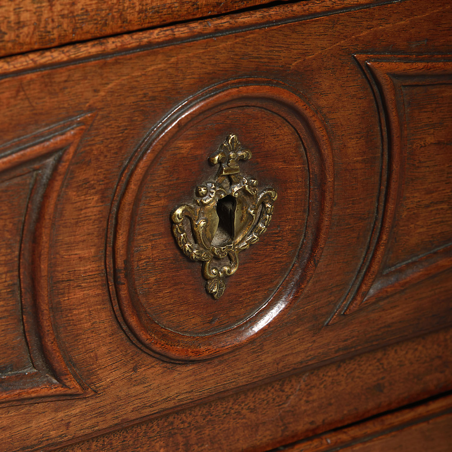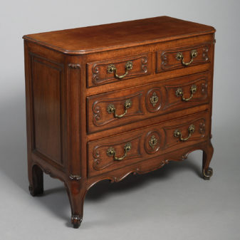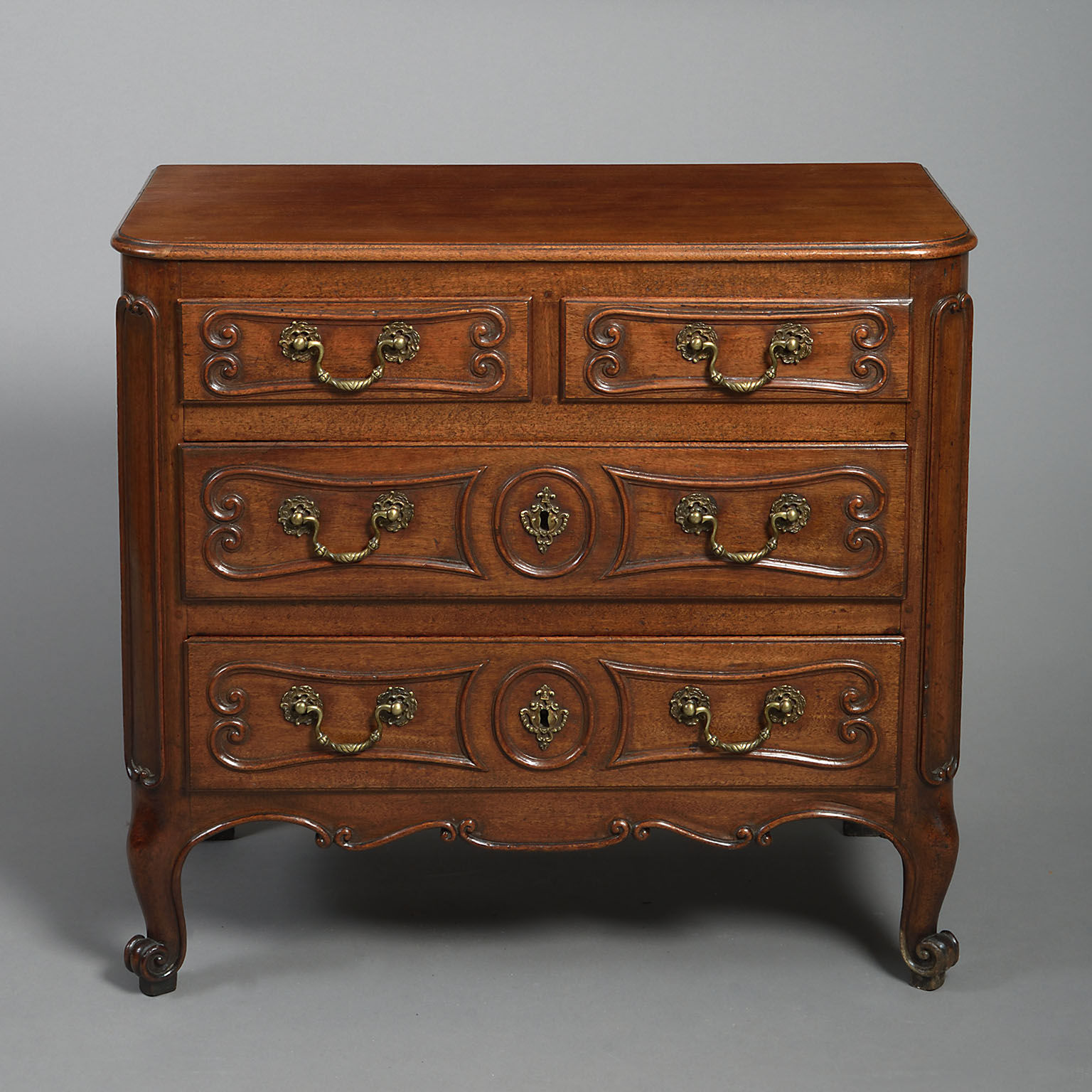 A Louis XV Walnut commode of small scale. The two short above two long drawers with shaped mouldings and with panelled sides raised on cabriole legs.
