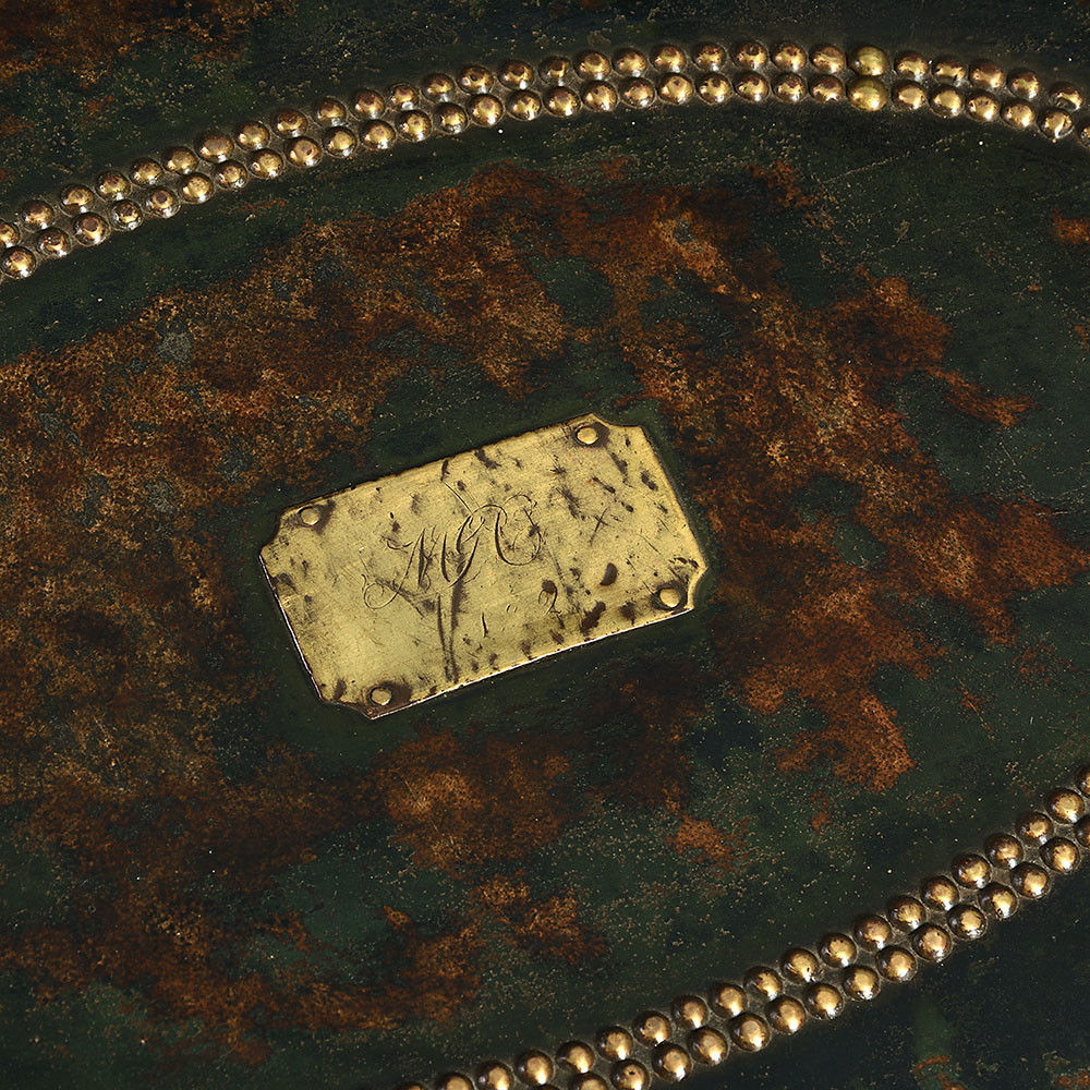 A fine early 19th century brass bound dark green leather trunk, with carrying handles at either end and decorated throughout with brass nailing in the Regency manner; the interior retaining the original paper lining.