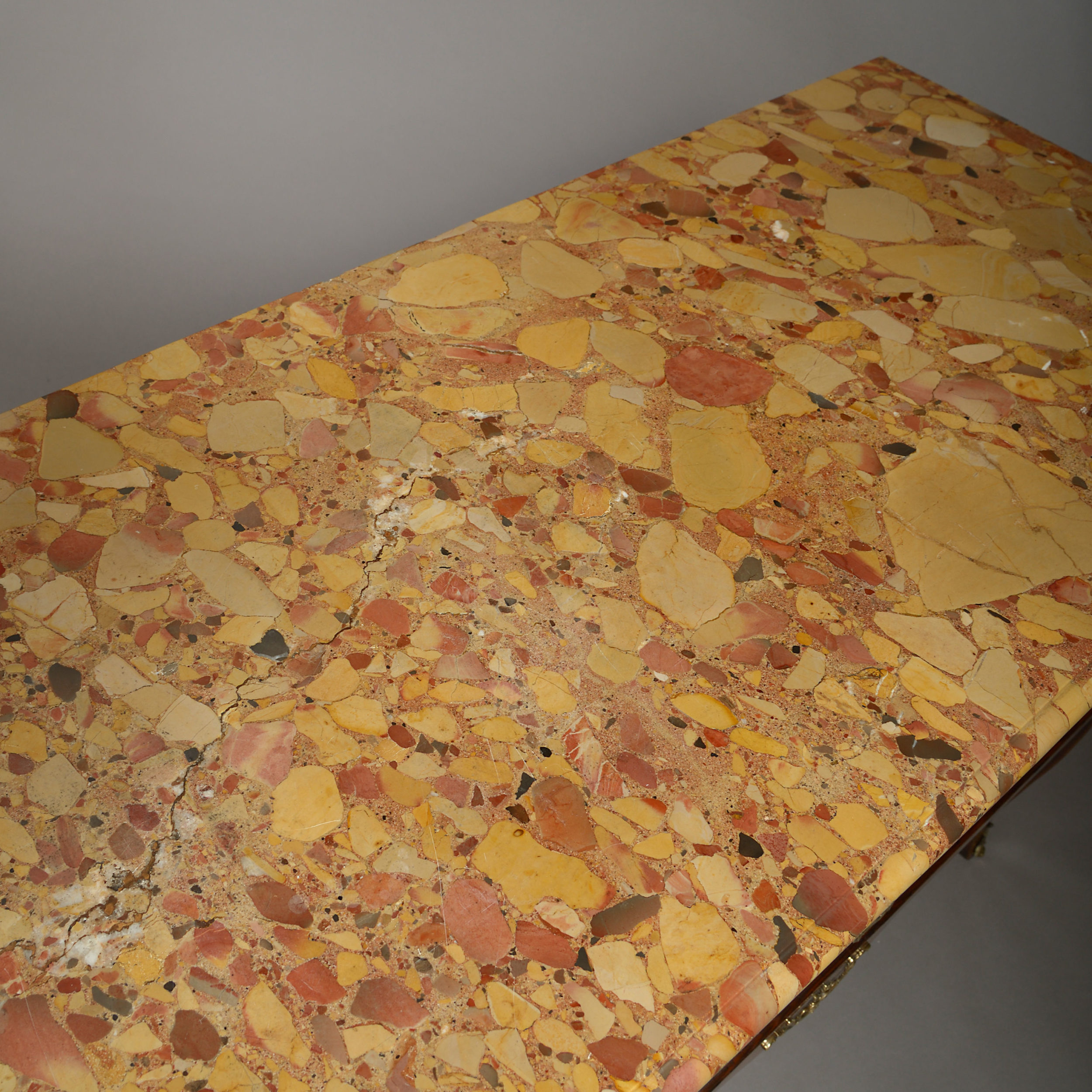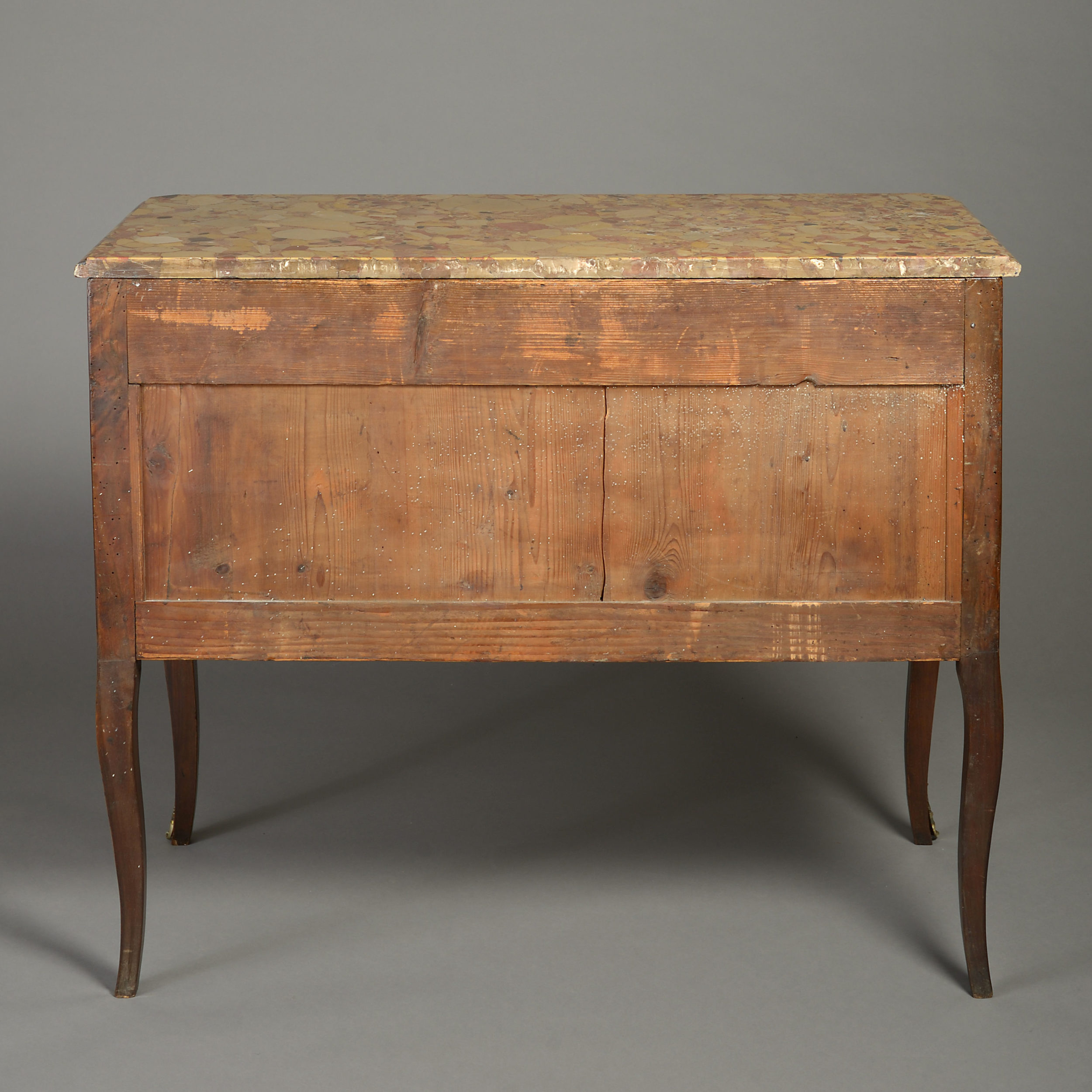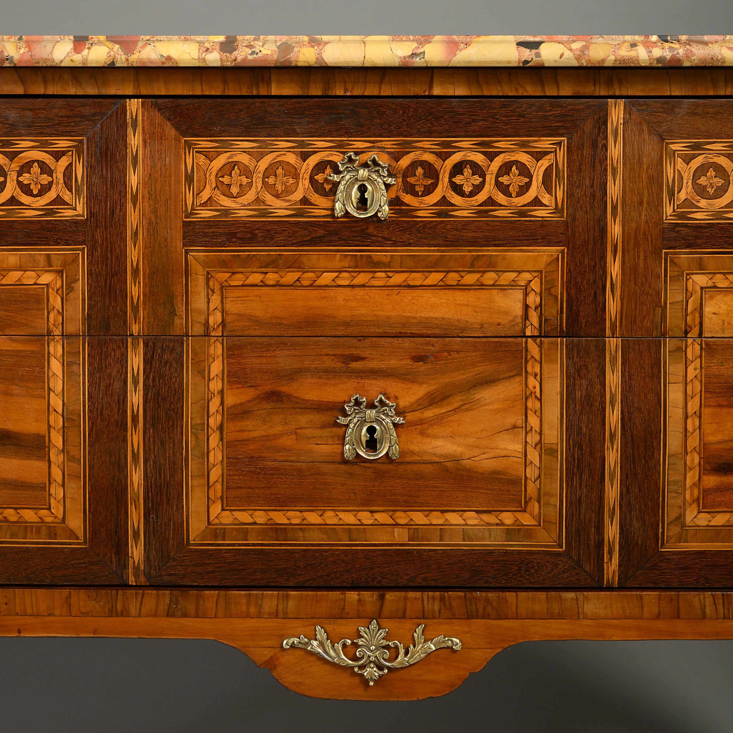 A fine late 18th century Louis XVI Period commode, having a marble top above two long drawers with gilt brass escutcheons and foliate ring handles and decorated throughout with panels of guilloches and ribbon banding in olivewood, tulipwood and walnut, the sides of the same, the front apron with applied scrolling mount, the whole raised on cabriole legs with brass mounts to the feet.