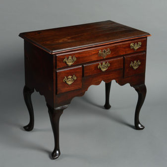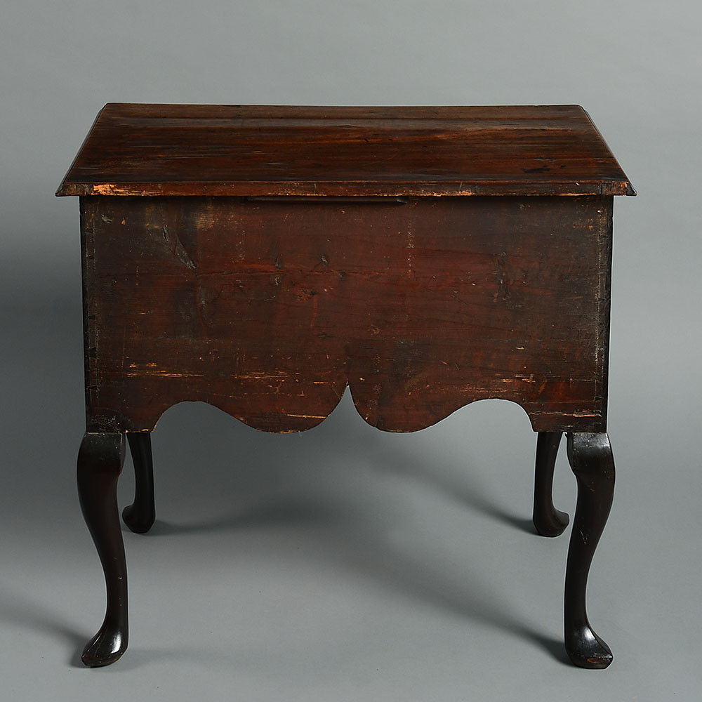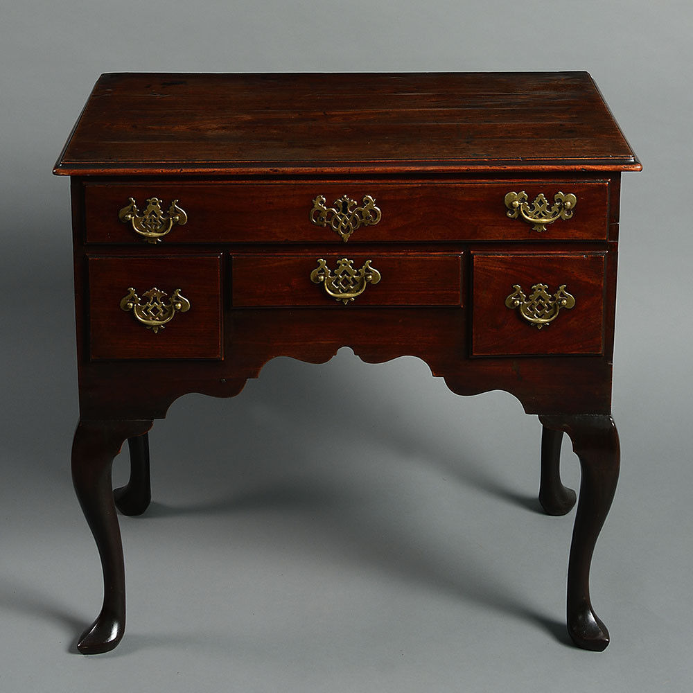 This lowboy is unusual in that it is constructed from mahogany. Stylistically the form is most closely associated with the age of walnut and is first recorded circa 1710. It is likely that this piece was made by a provincial yet highly skilled cabinetmaker, as earlier designs continued to be produced for the country market, some years after newer designs had taken hold in fashionable cities throughout Great Britain and Ireland.