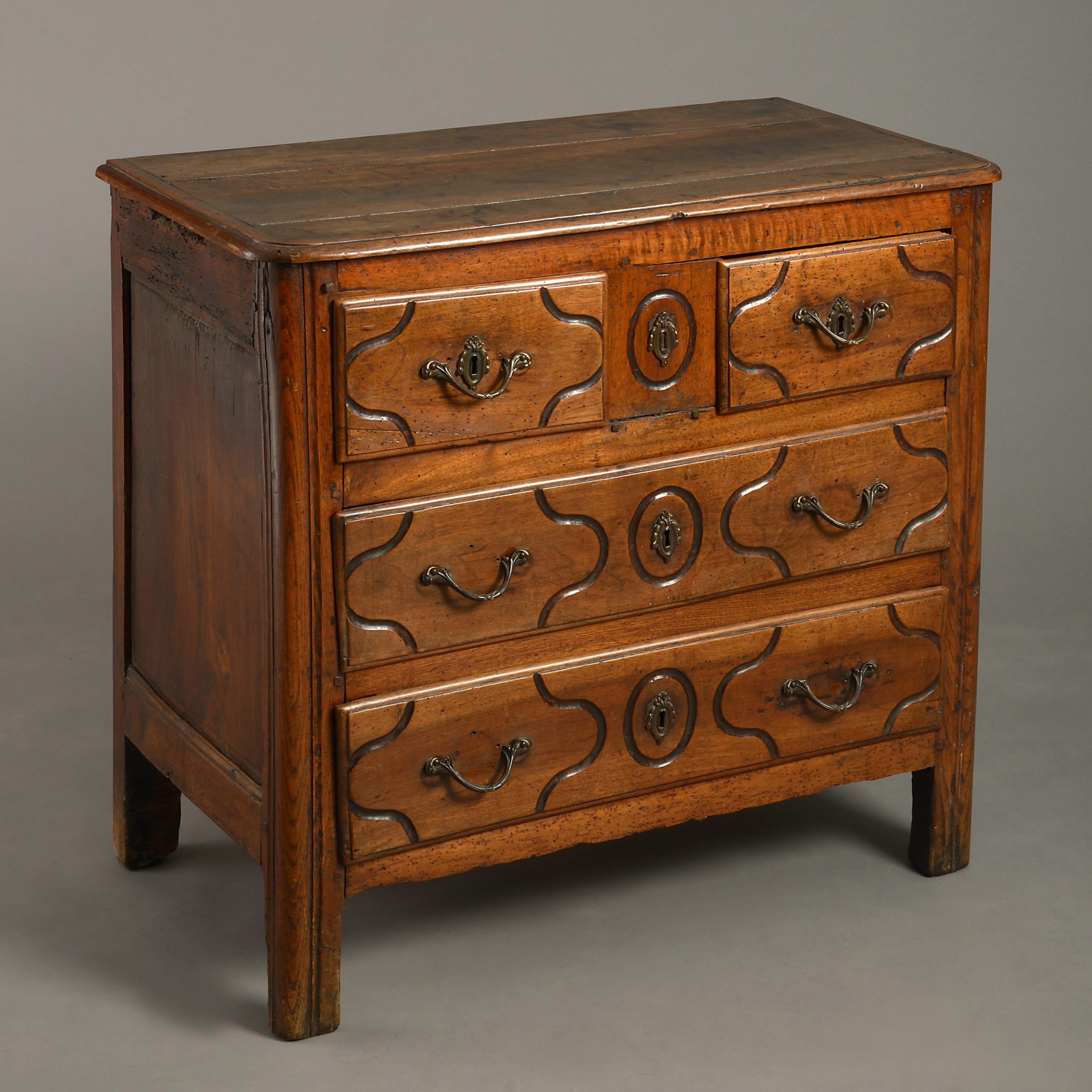 An 18th century Louis XV Period walnut commode, the overhanging top above two short and two long drawers with panelled fronts and brass handles and all raised on stile feet.