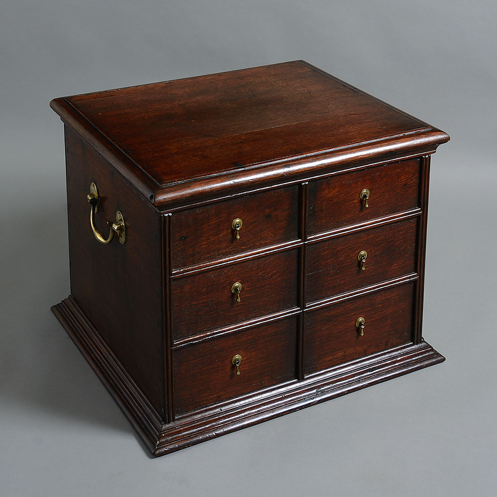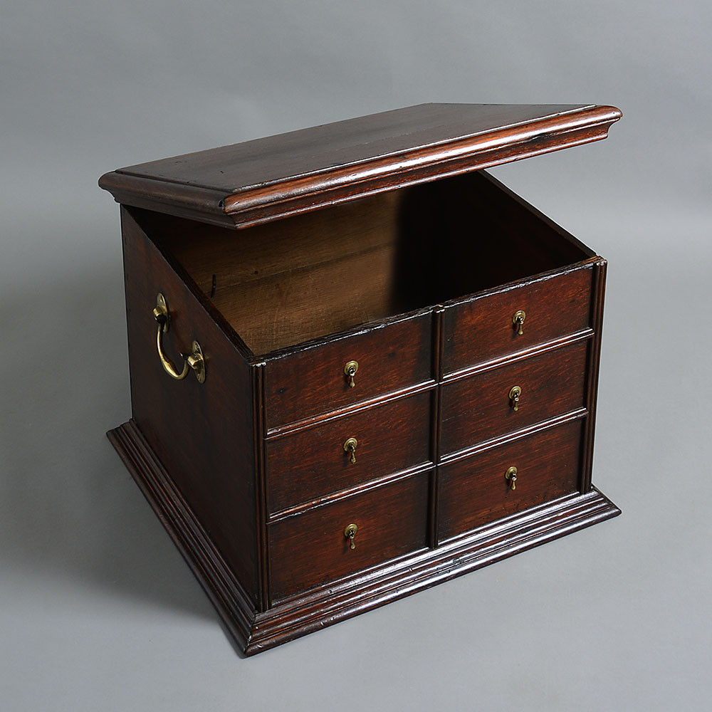 A rare George I Period oak close stool, the lid above six front and six rear false drawers with the original brass drop handles, the sides fitted with brass carrying handles.