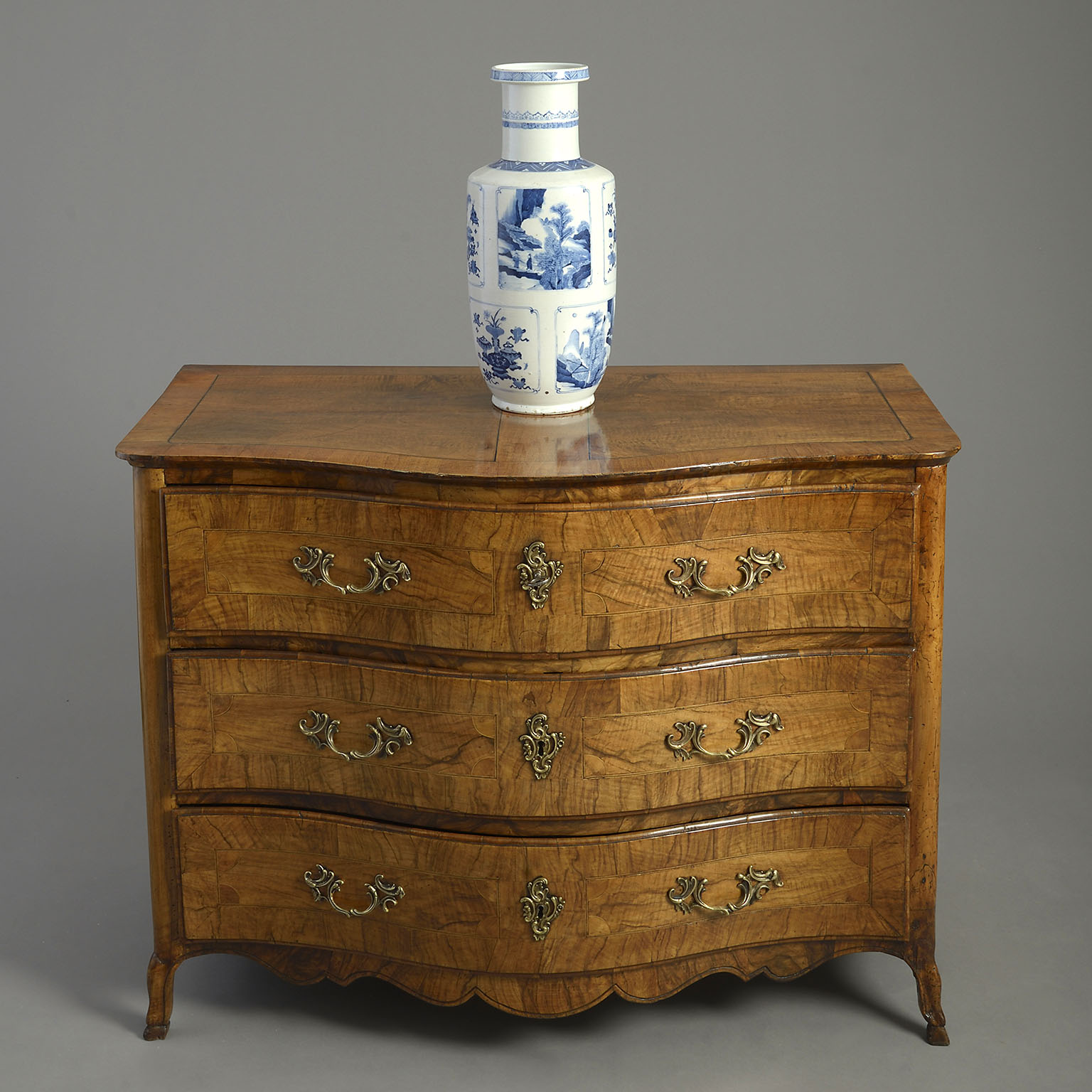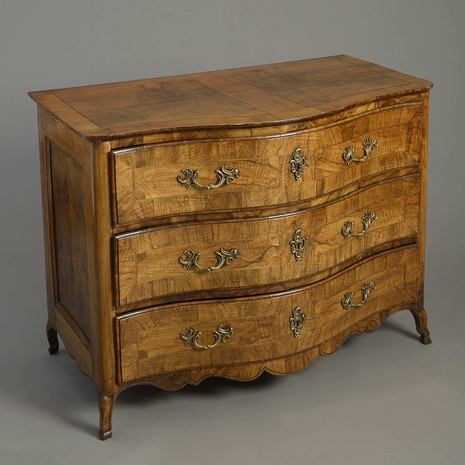 A late eighteenth century burr walnut parquetry commode, the overhanging top and three drawers with panelled inlay, mounted with rococo brass lock escutcheons and handles and raised on stylised hoof feet.