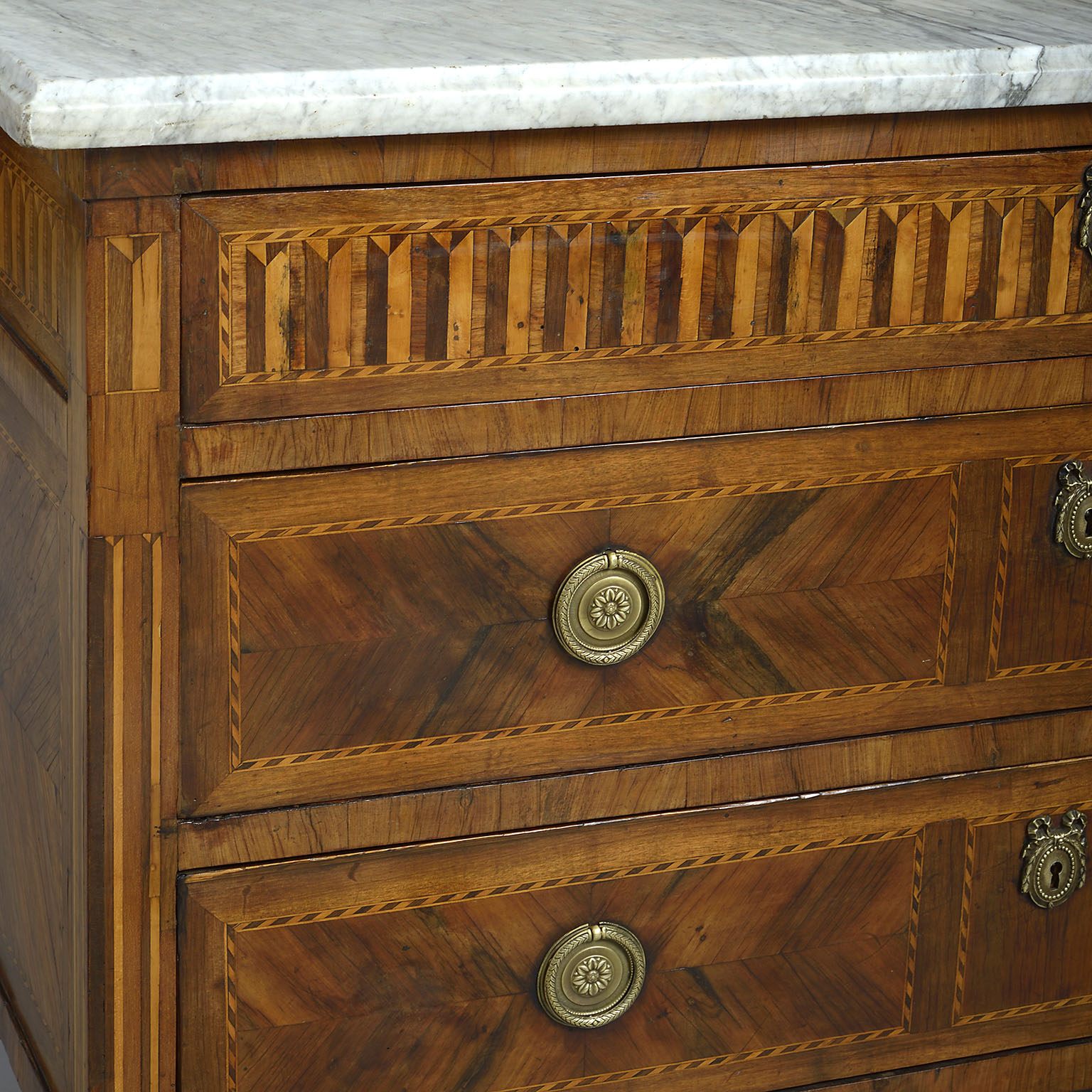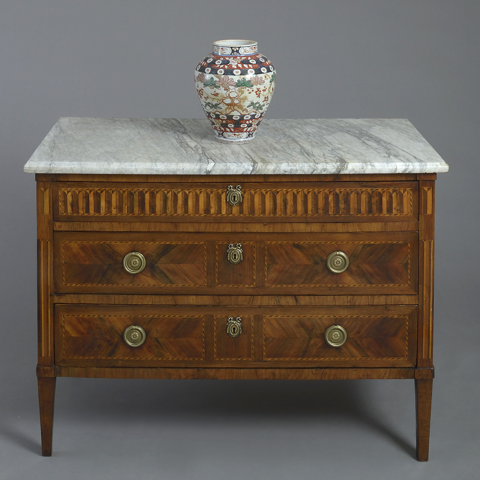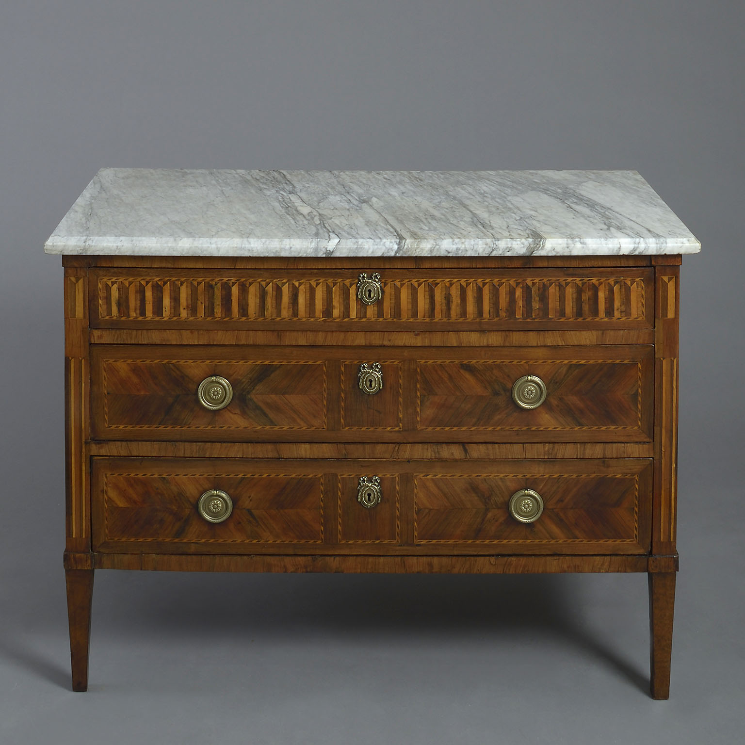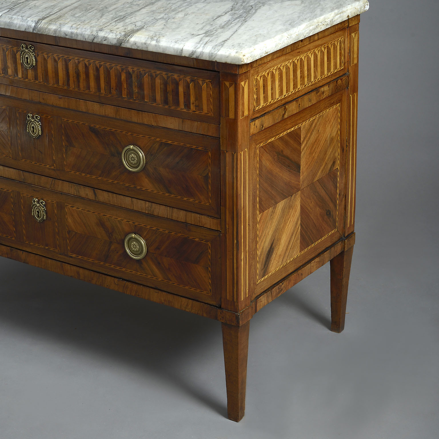 A fine late eighteenth century Louis XVI Period walnut and parquetry three drawer commode, the original white veined marble top above three drawers with neo-classical brass medallion handles and lock escutcheons, the ends with inlaid fluting and all raised upon square tapering legs