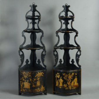 Each with three graduated serpentine shelves on scroll supports above a pair of chinoiserie decorated doors; one mid 18th century, the other possibly of a later date made as a companion piece.