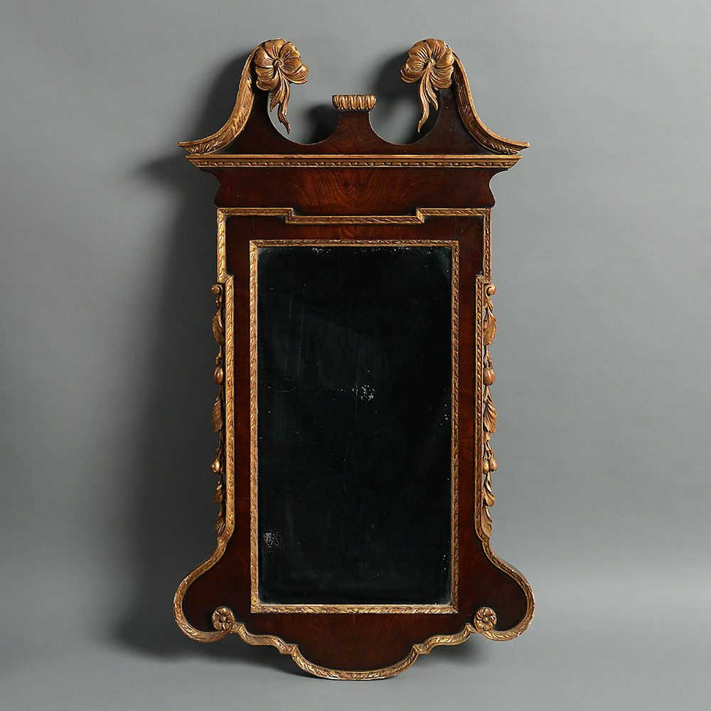 A mid-18th century walnut and parcel gilt mirror in the form of a tabernacle, the swan pediment with scrolling rosettes above a kitkat moulded frame with shaped apron.