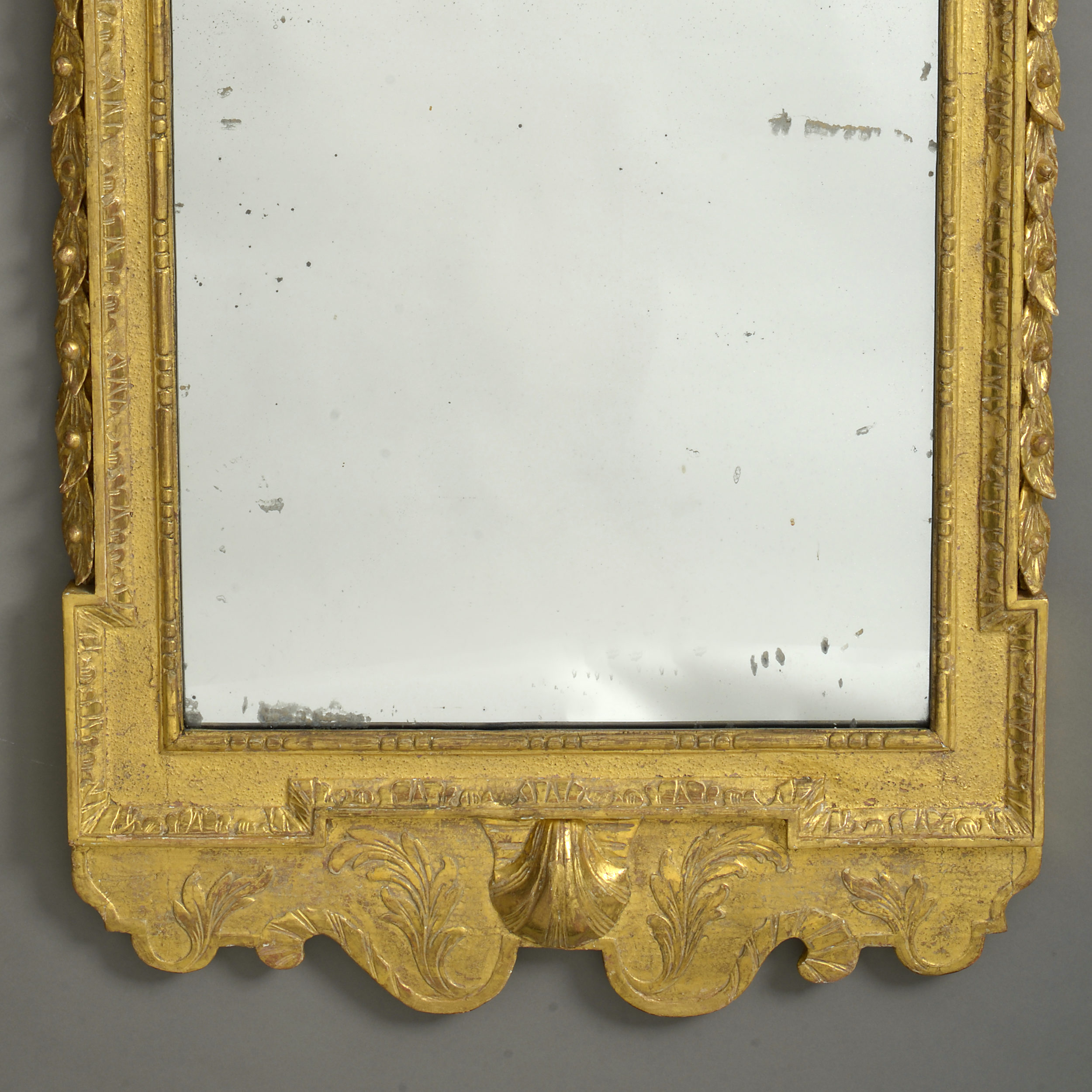 An early 18th century George II Period giltwood mirror in the manner of William Kent, the broken swan-neck pediment centred by a cartouche above a mercury glass plate within a panelled and sanded surround, flanked by trailing festoons of leaves and berries, the shaped apron centred by a scallop shell.