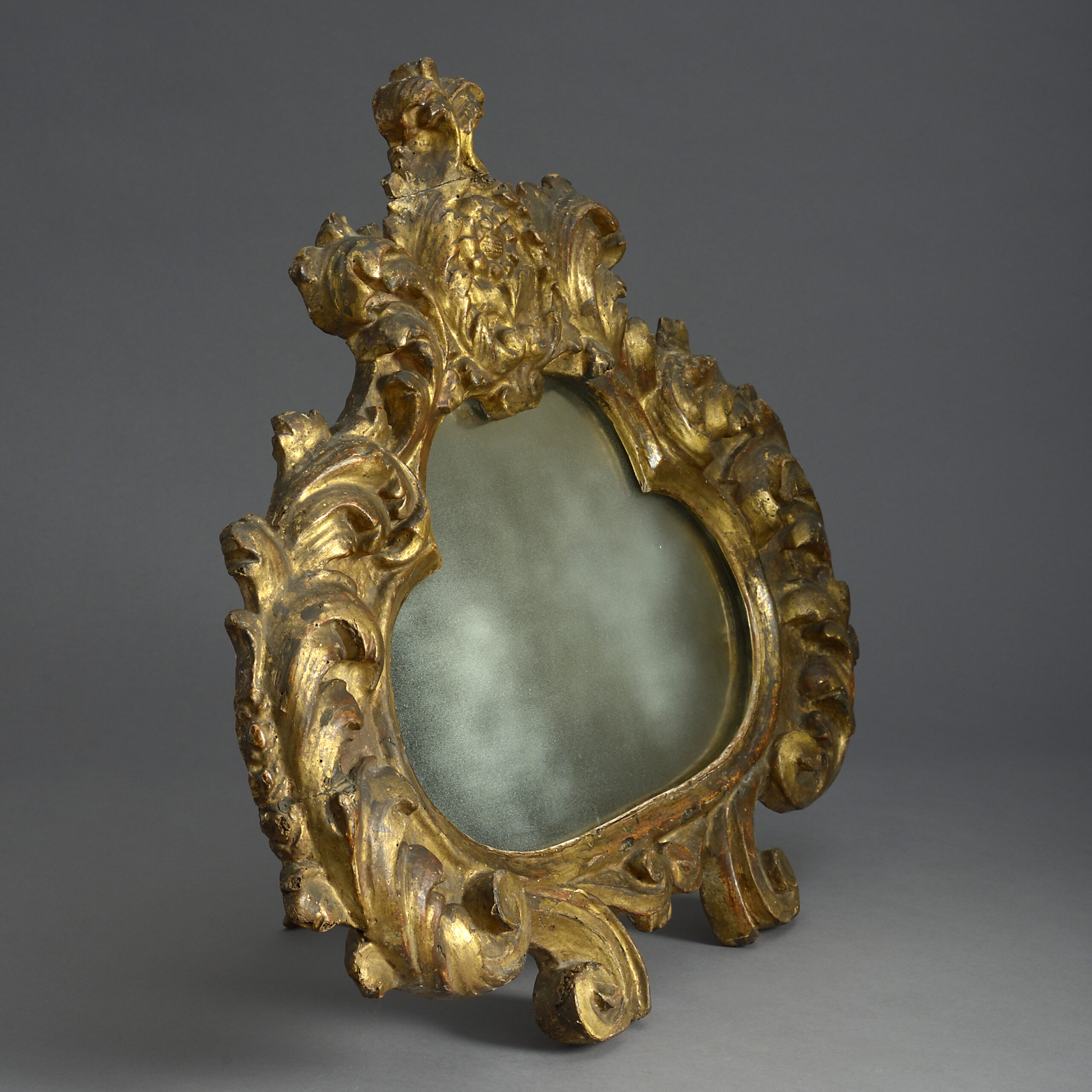 An early eighteenth century giltwood toilet mirror, the shaped frame of carved scrolls set upon a hinged stand.