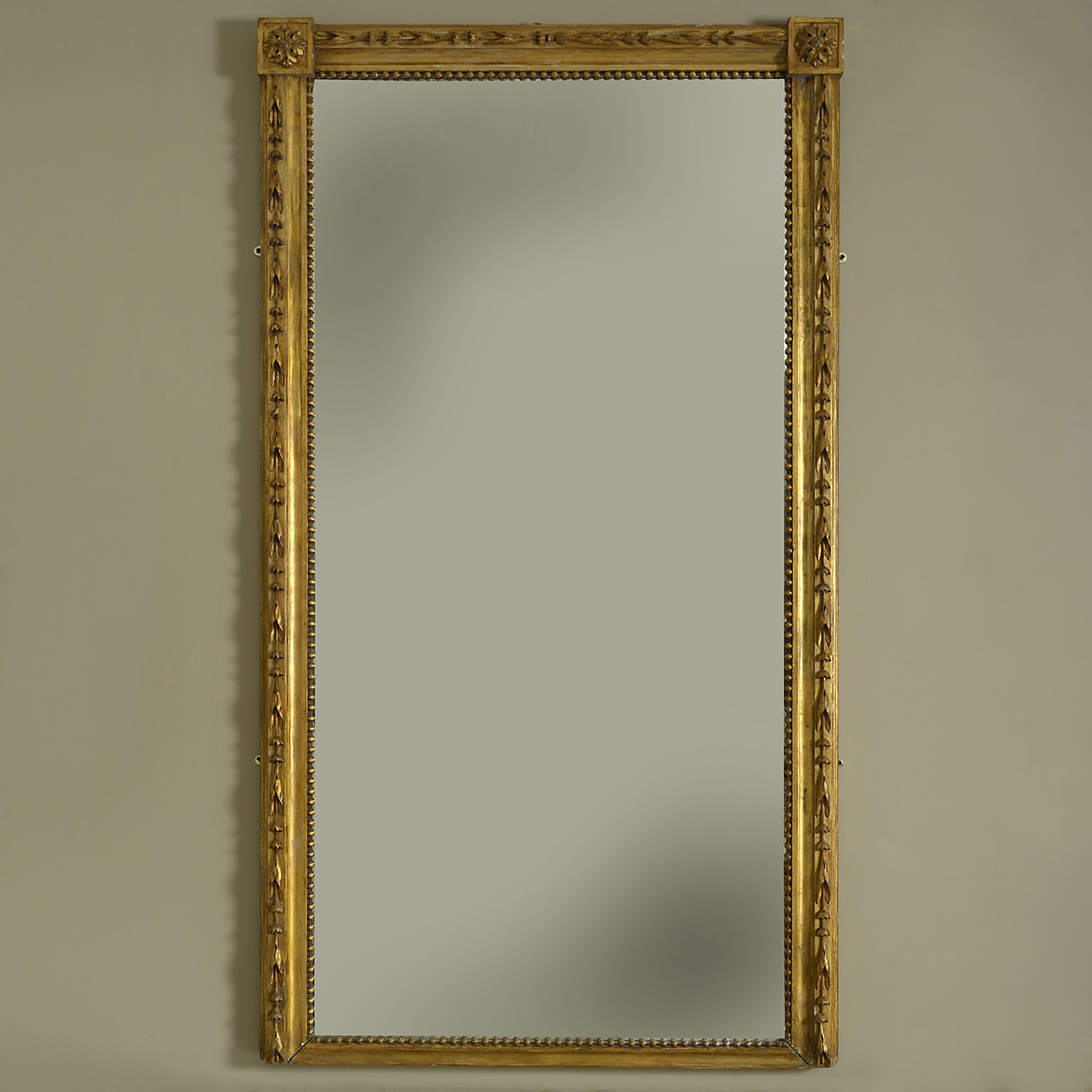 An early nineteenth century Regency Period giltwood pier mirror of large scale, the foliate carved and beaded frame topped with square block corners mounted with paterae.