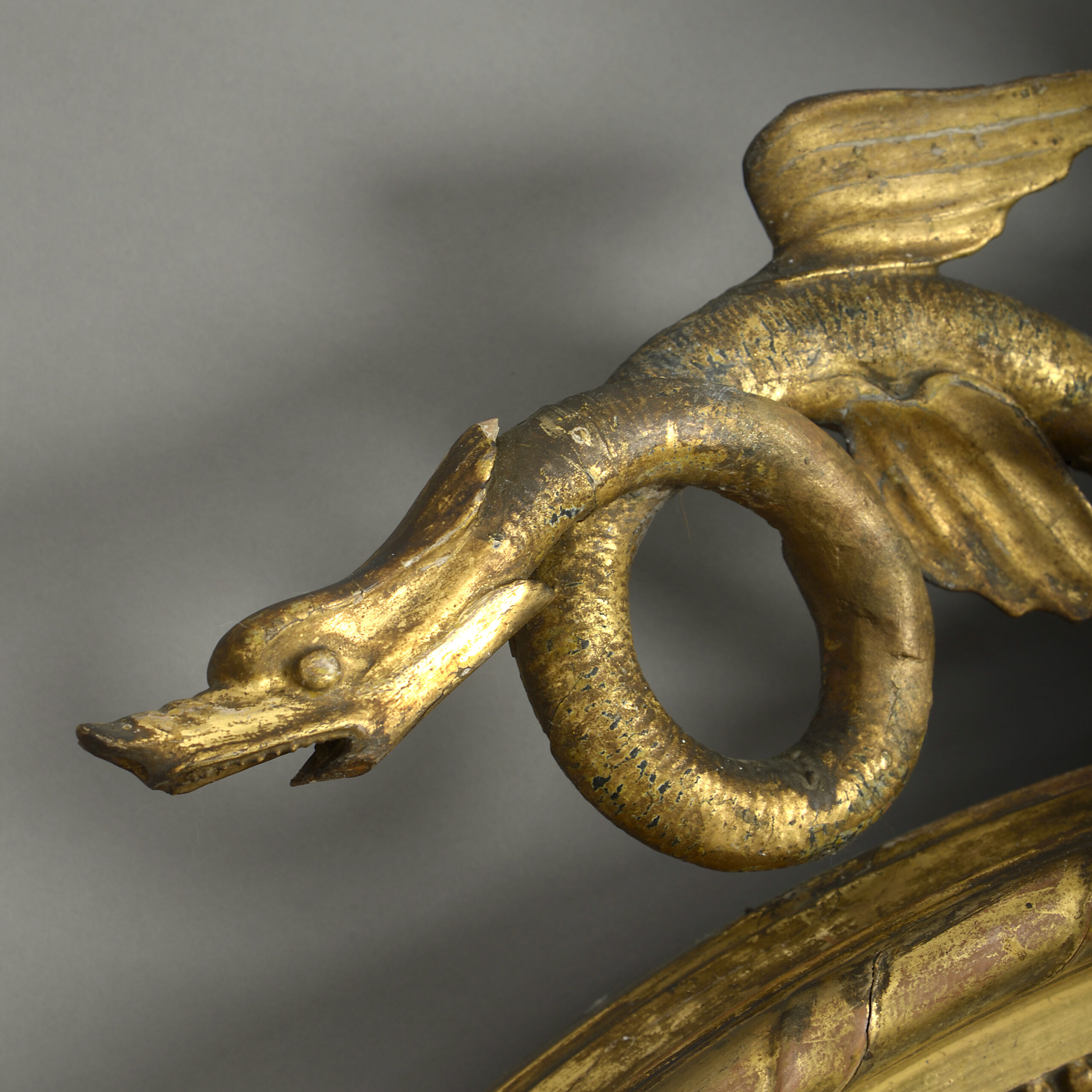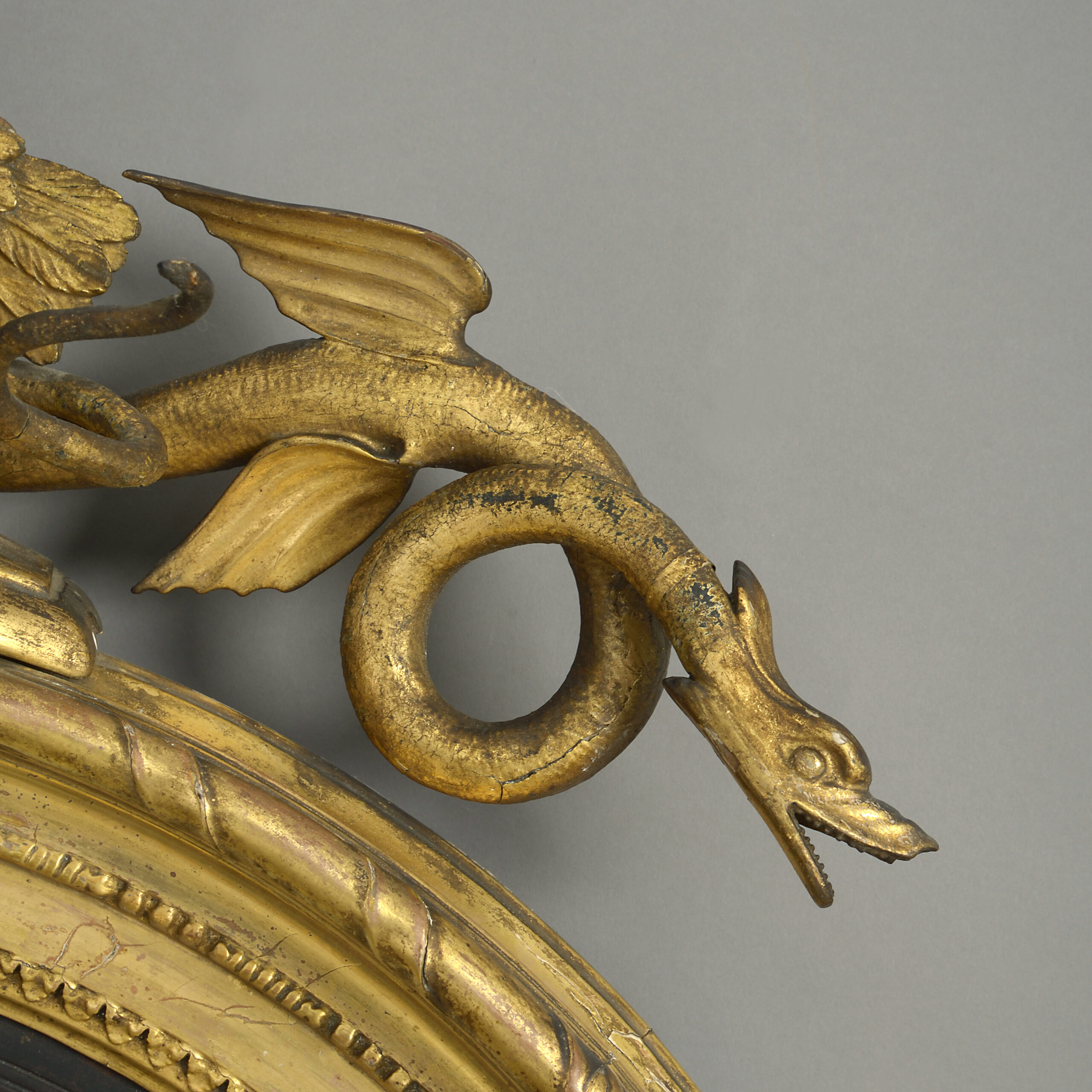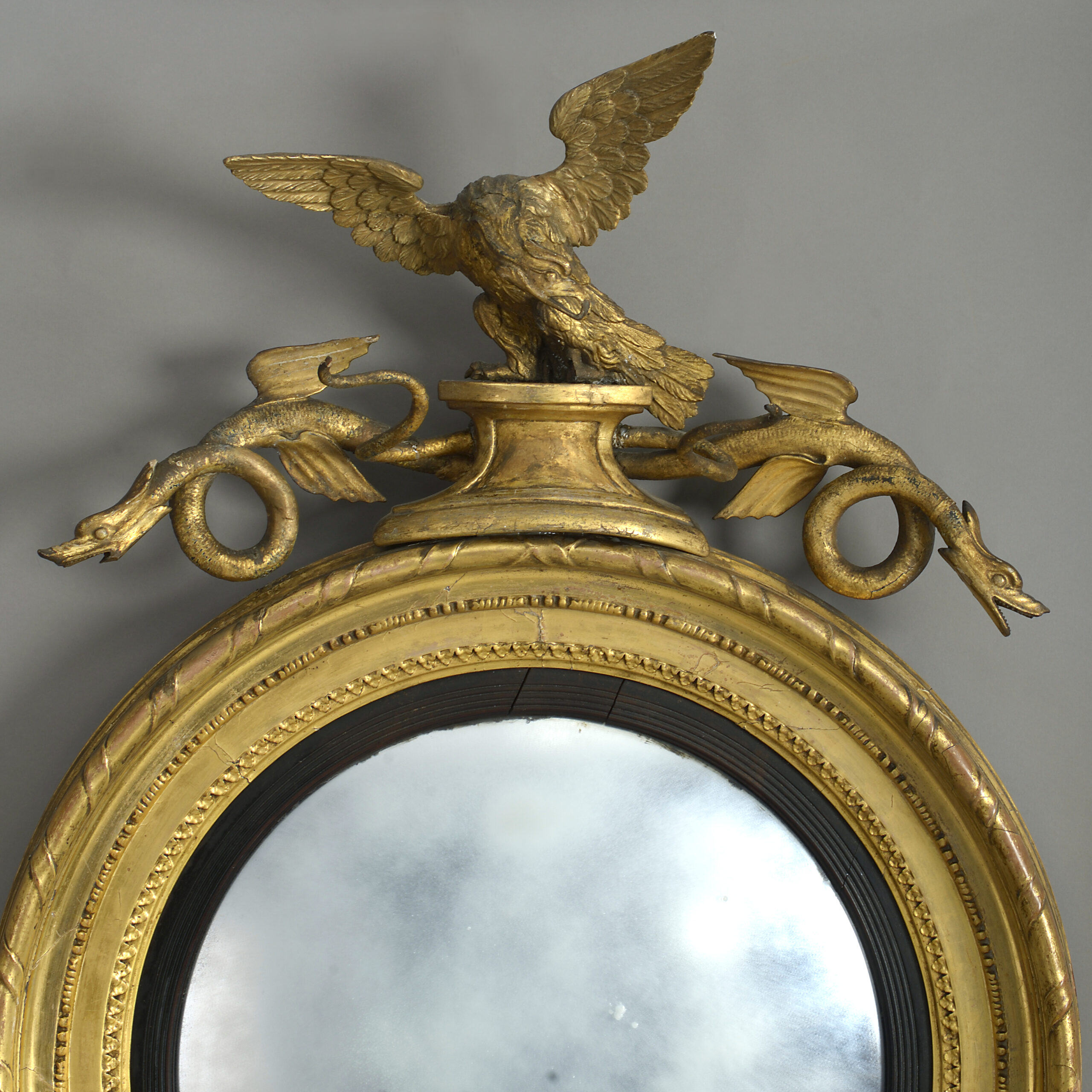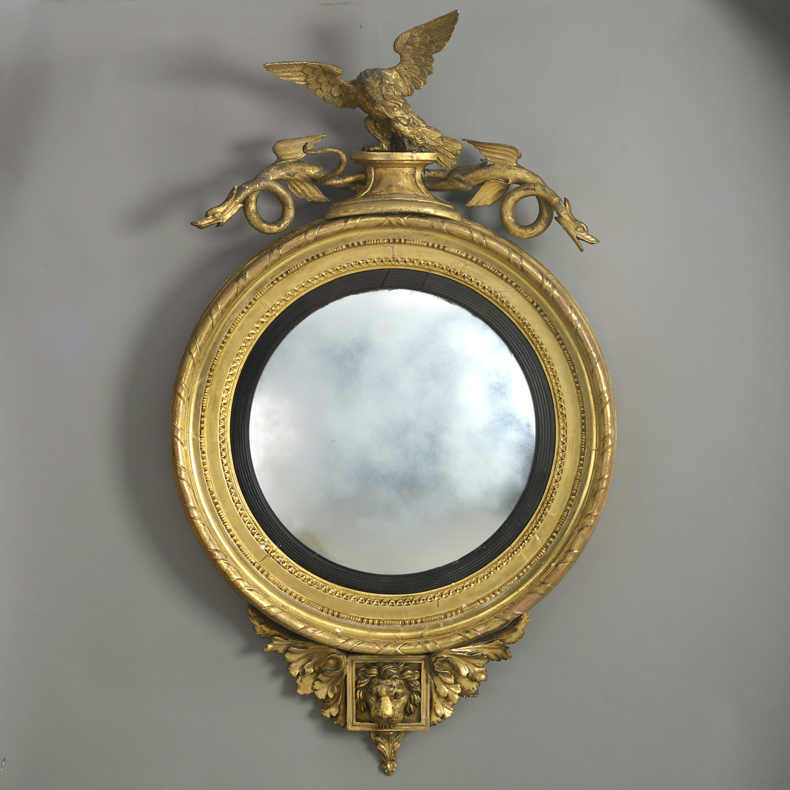 A fine early nineteenth century Regency Period giltwood convex mirror, the circular frame of rope twists, beading and palmettes with reeded ebonised slip, surmounted with an eagle between two dragons, the lower section comprising a carved lion’s head set within a square tablet, between supporting acanthus scrolls and downward finial.