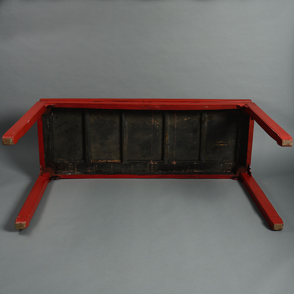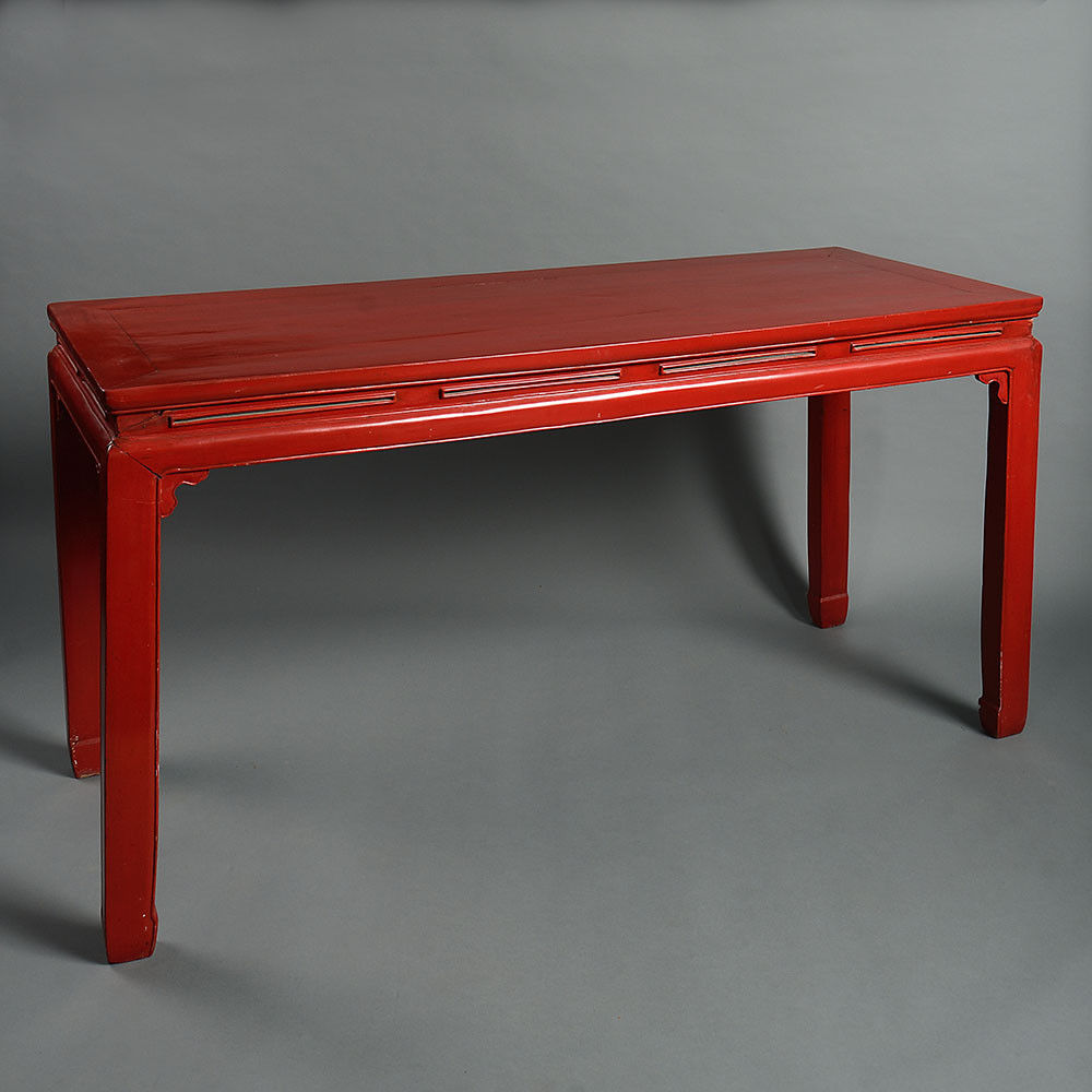 A late 19th century red lacquer alter table of long rectangular form and set upon four shaped legs in the traditional manner.