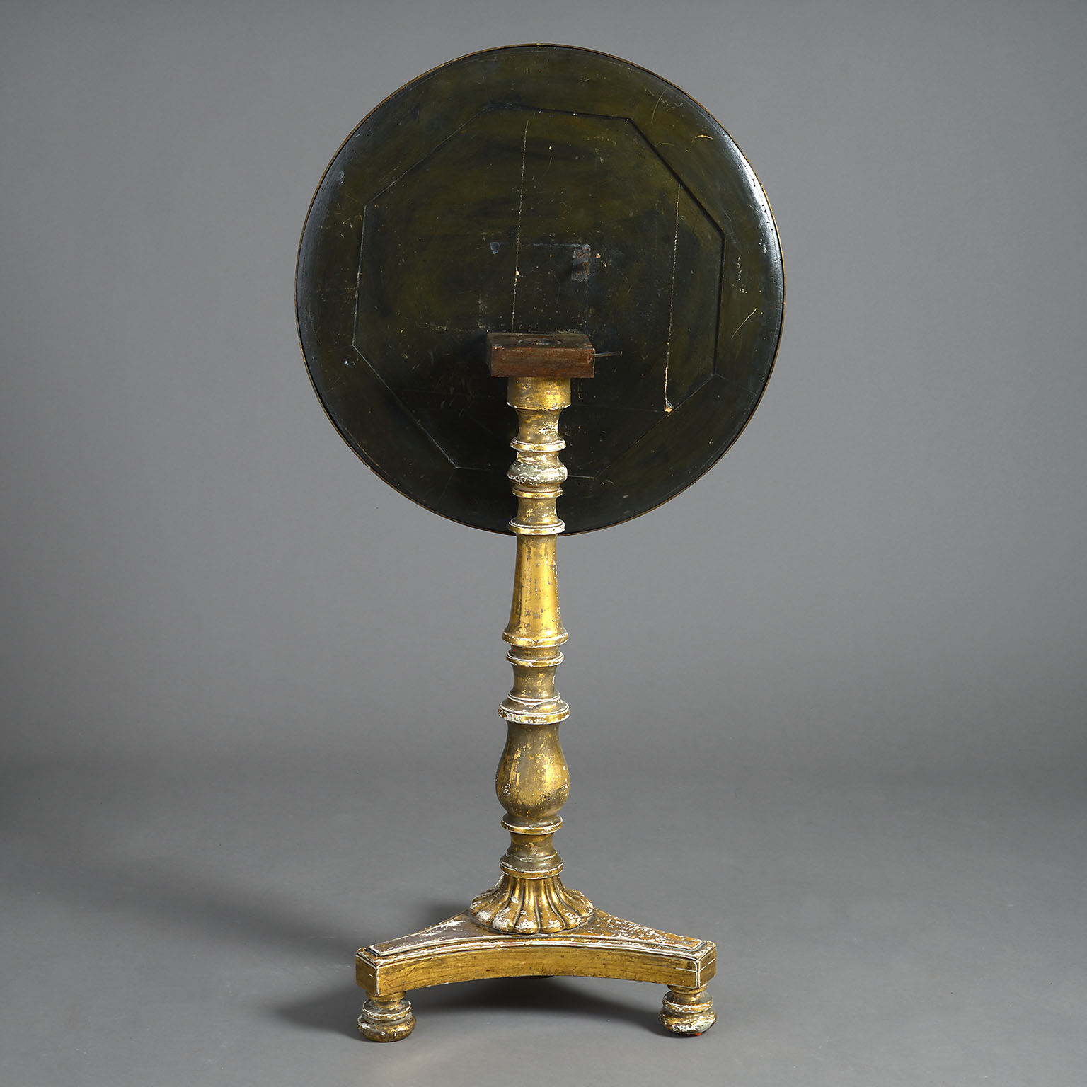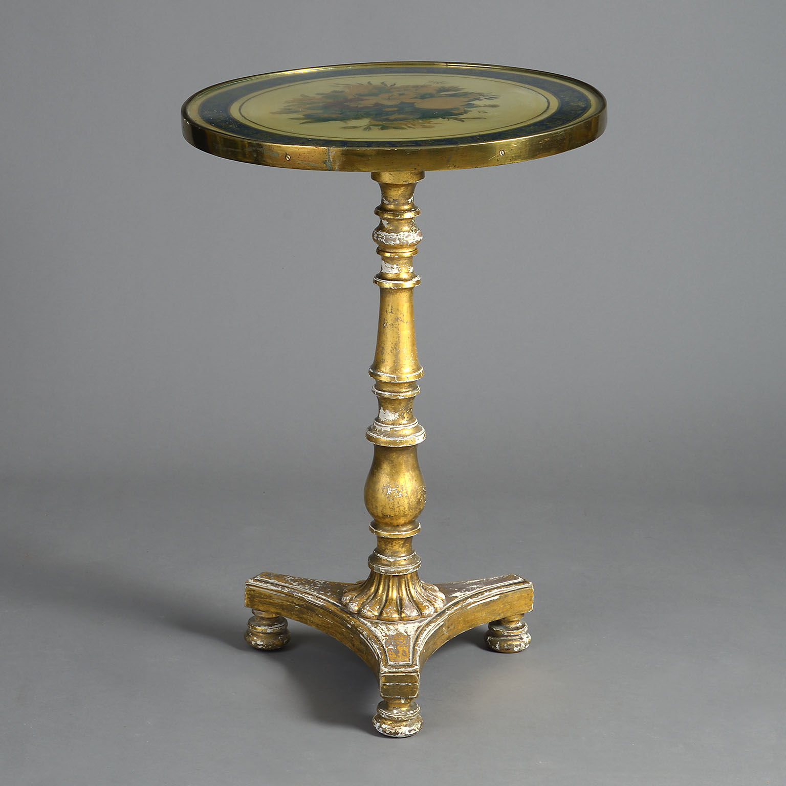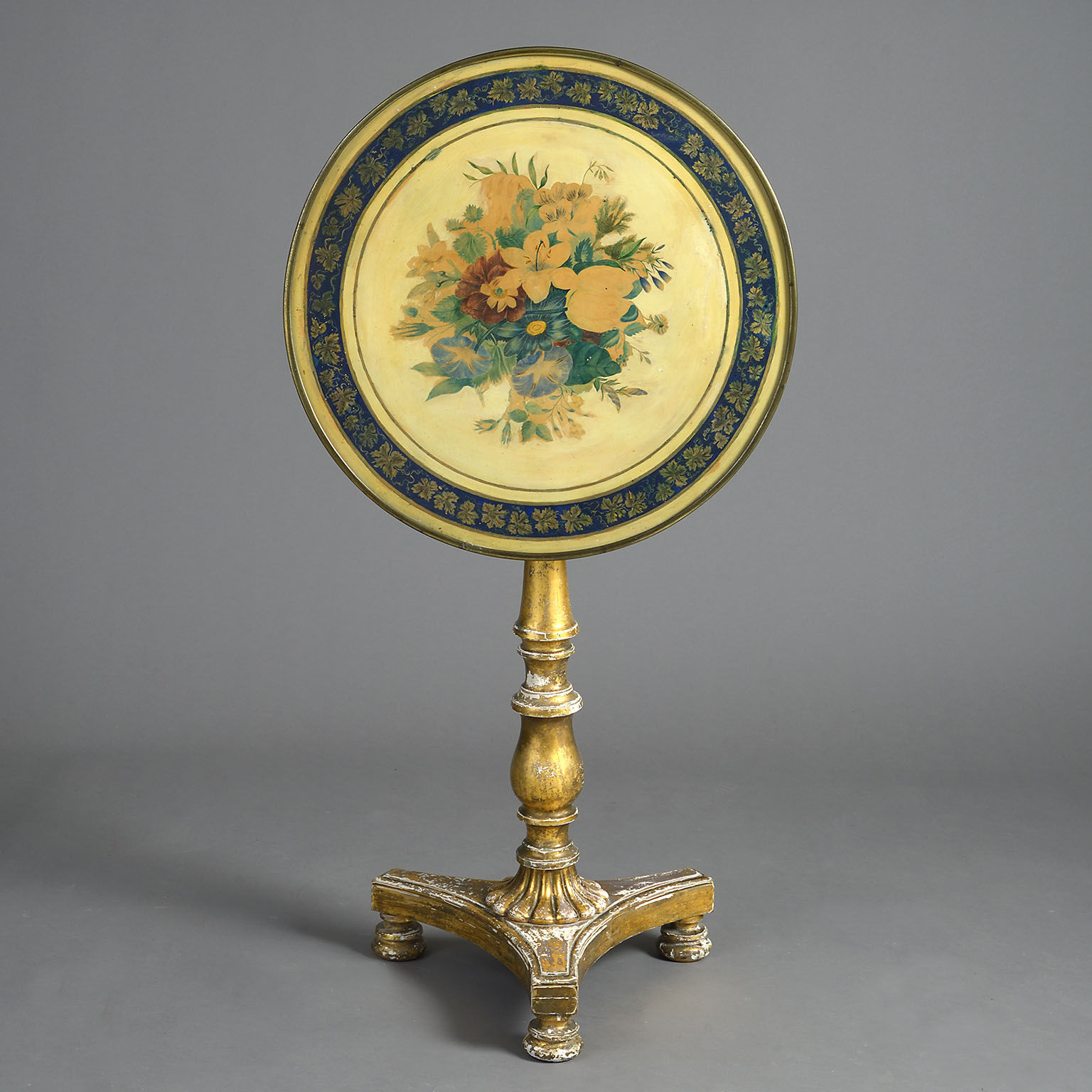 The hand-painted floral top protected under glass with a lacquered brass border. The tilt-top action supported on a gilt-wood baluster turned support with a platform base. Bearing a makers label ‘Made at Tyrrells, 2 Greek Street, Soho’