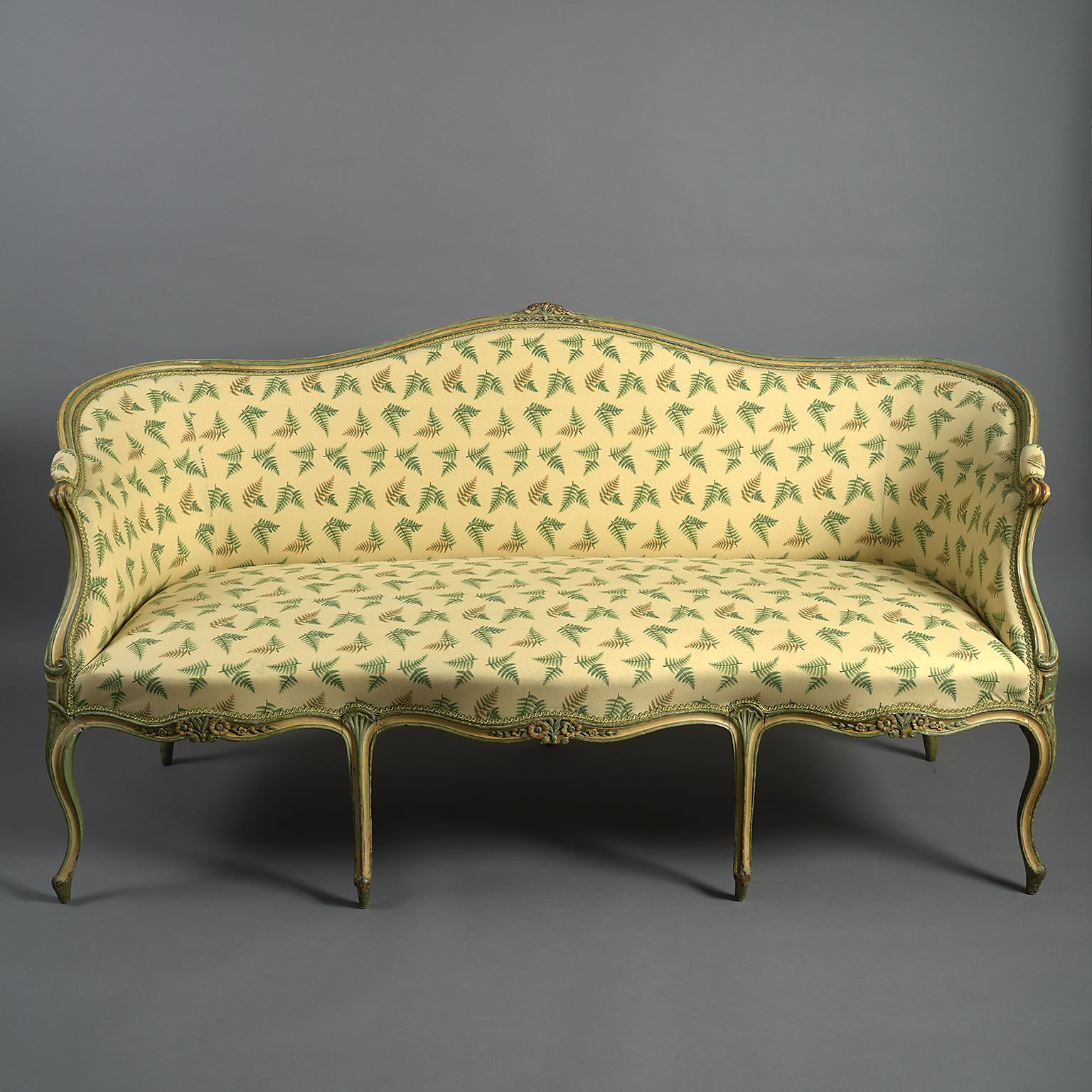 In the French taste, the moulded beechwood frame carved with flowers to the cresting and seat rails. The serpentine form raised on cabriole legs all painted in palest yellow picked out in green. The paintwork is possibly original. Traditionally re-upholstered throughout.