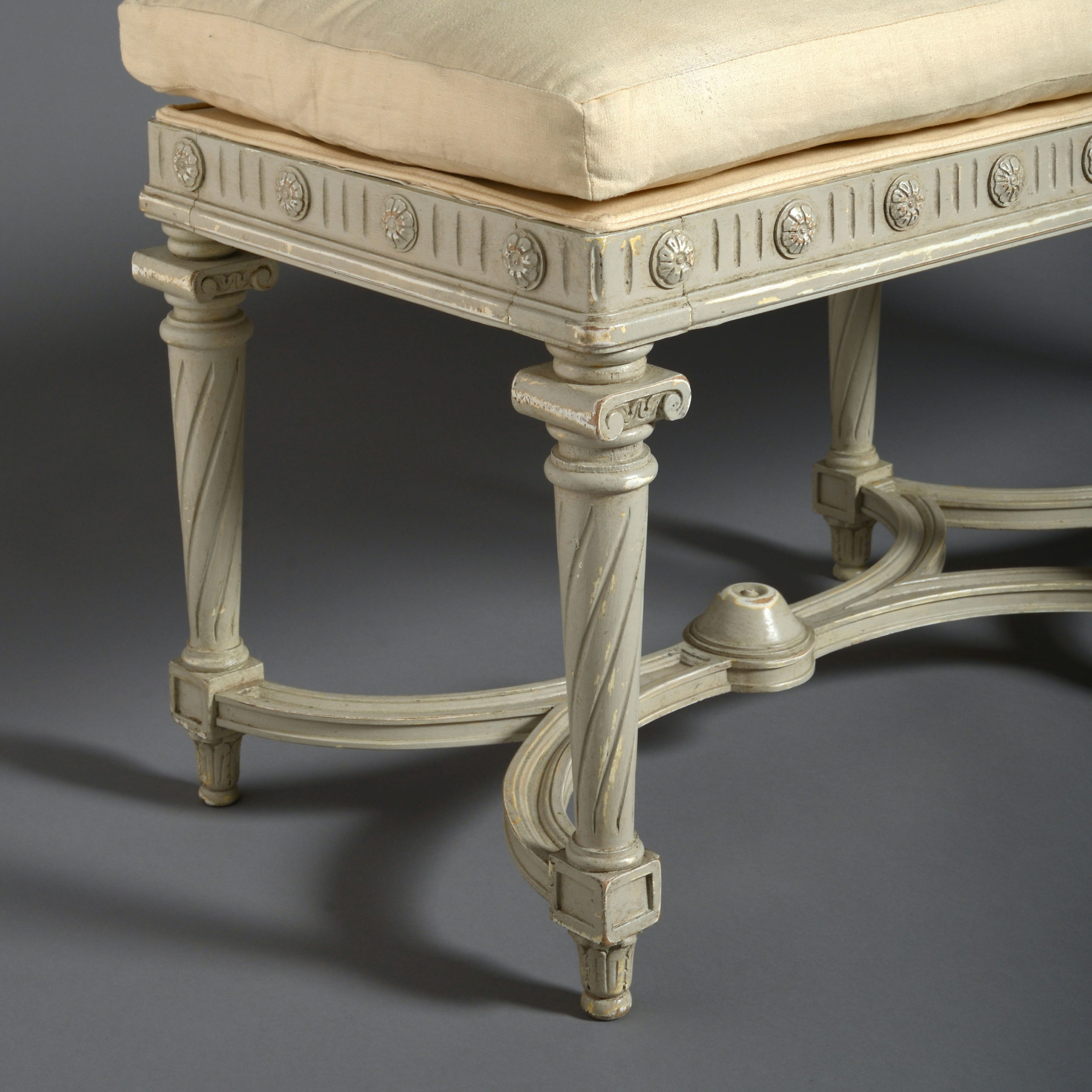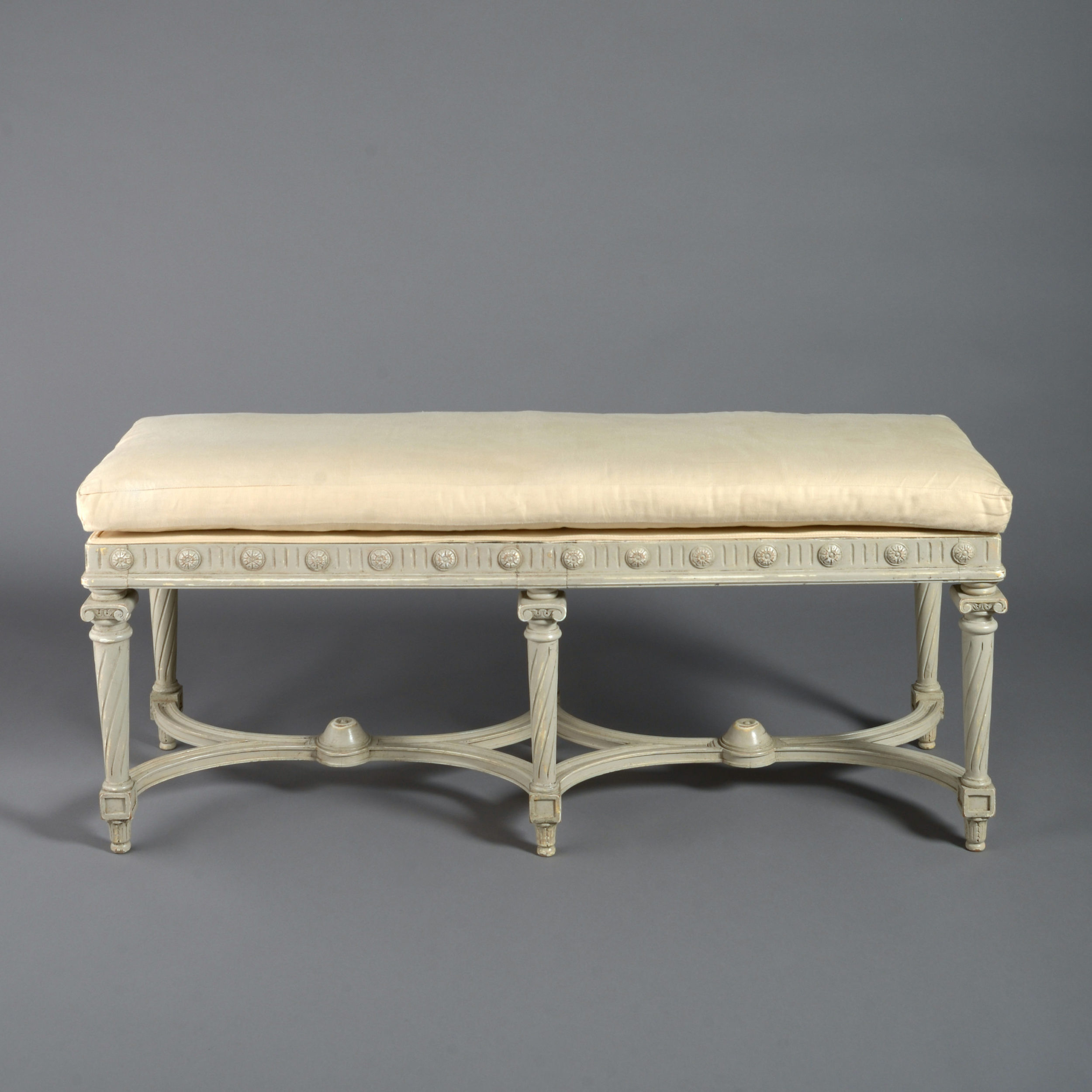 A late 19th century grey painted upholstered long stool in the Louis XVI style, a frieze of triglyphs and paterae set above six tapering spiral fluted column legs each headed with an ionic capital and all conjoined by concave stretchers. With a loose cushion seat.