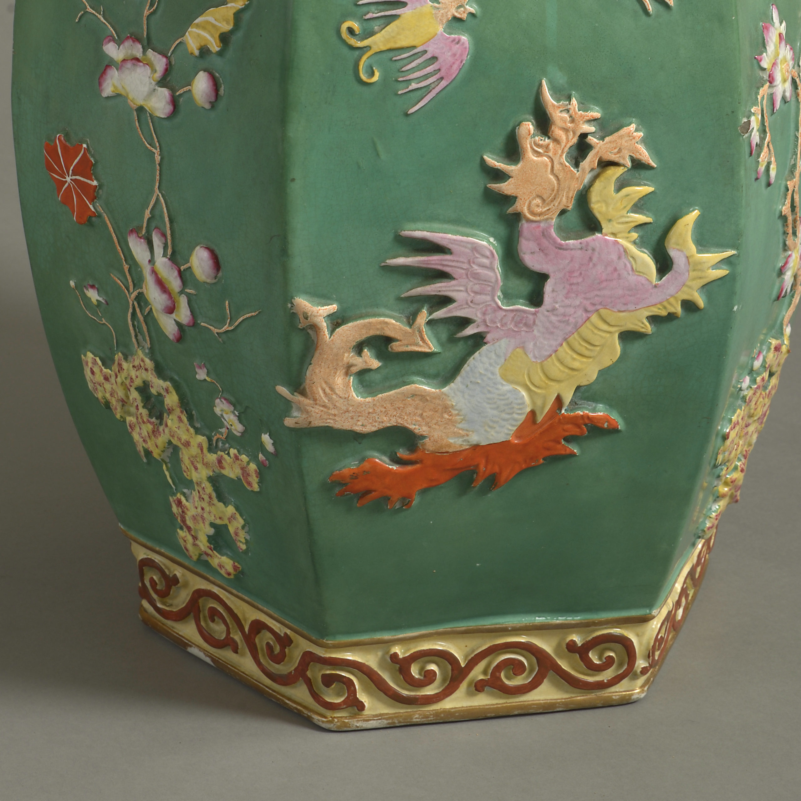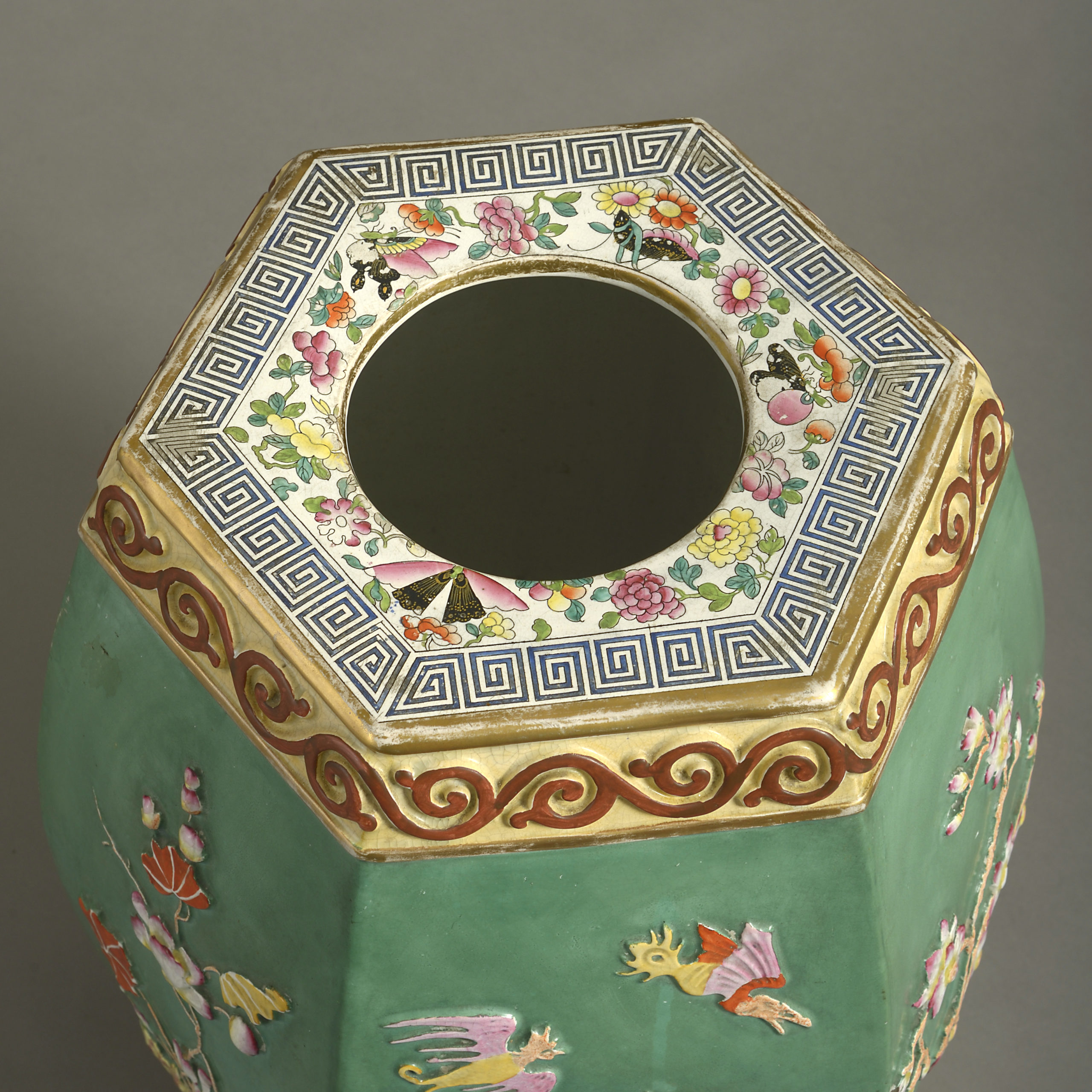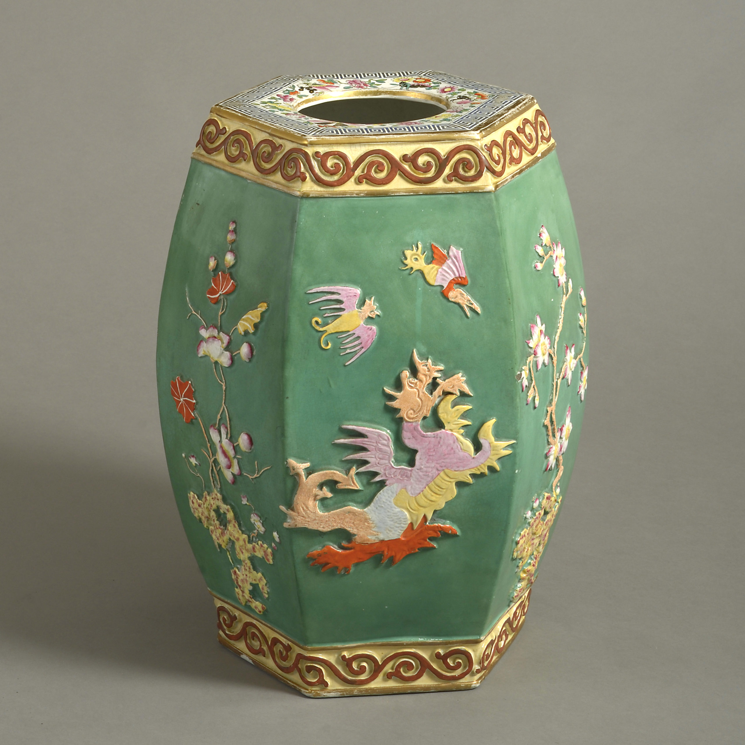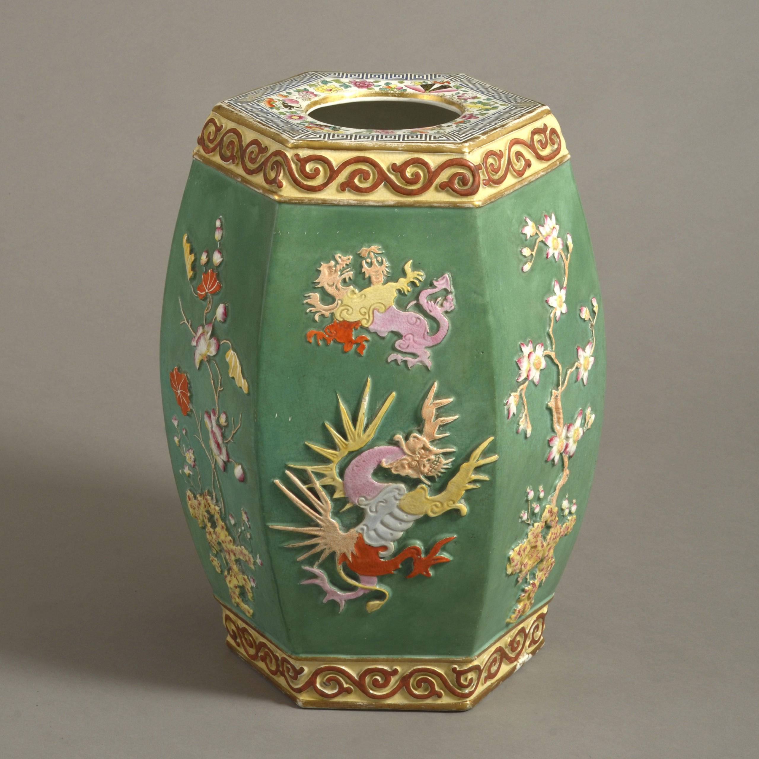 A mid-19th century porcelain garden seat of hexagonal form, the faceted sides with applied alternating decoration of dragons and foliage, in polychrome glazes upon a rich green ground.