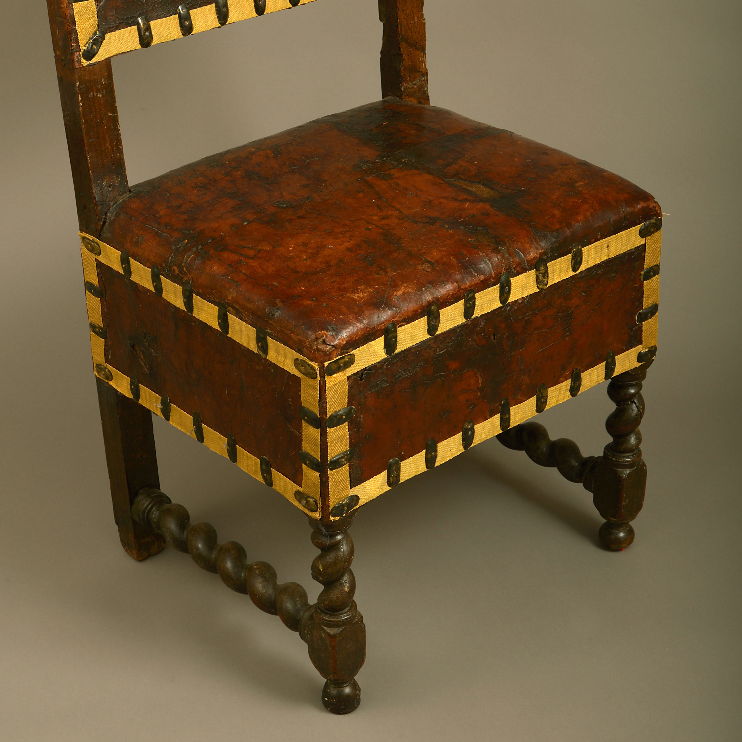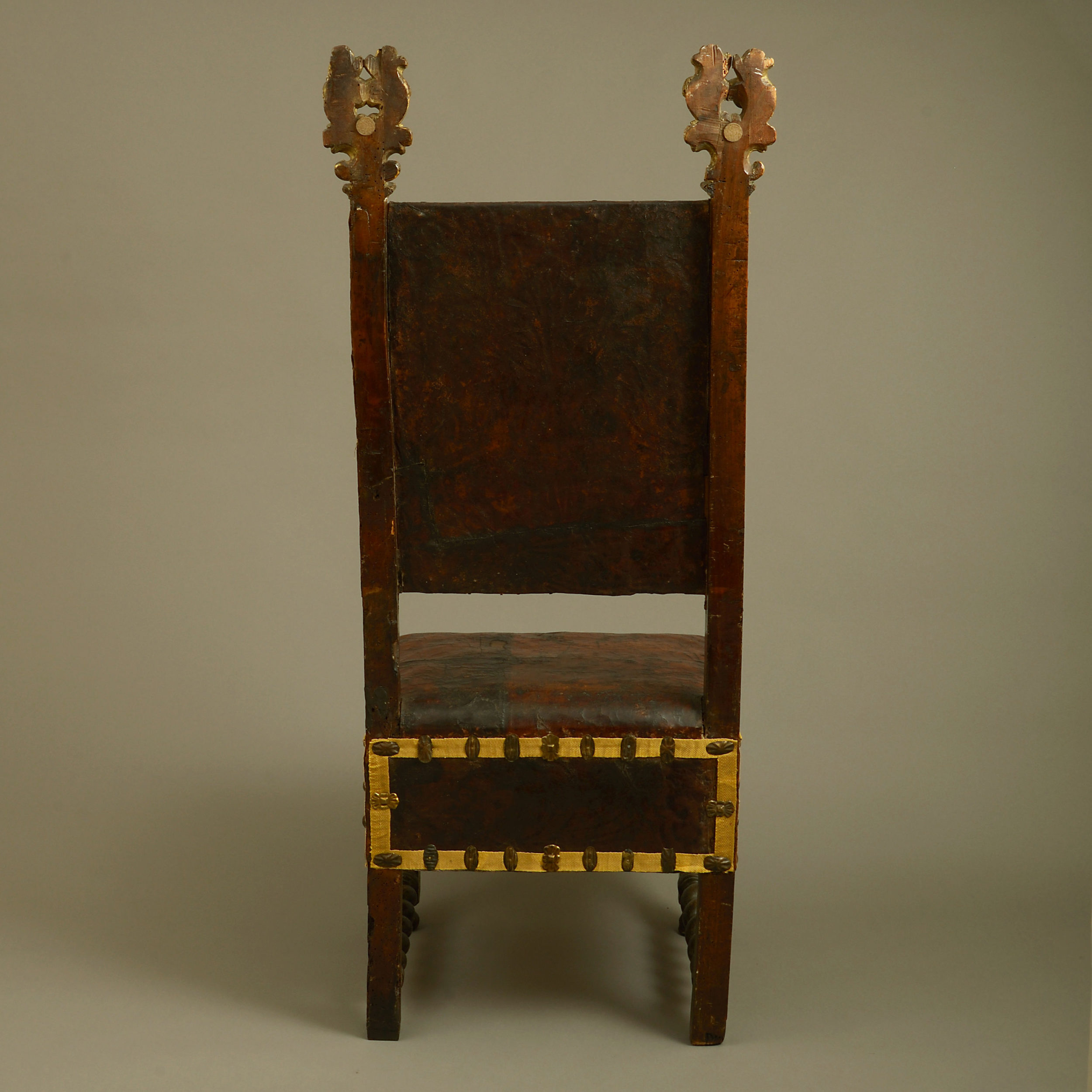 A rare mid-17th century Florentine walnut chair, of walnut, having gilded foliate finials and, retaining the original leather upholstery and raised on turned barley twist legs and side stretchers.