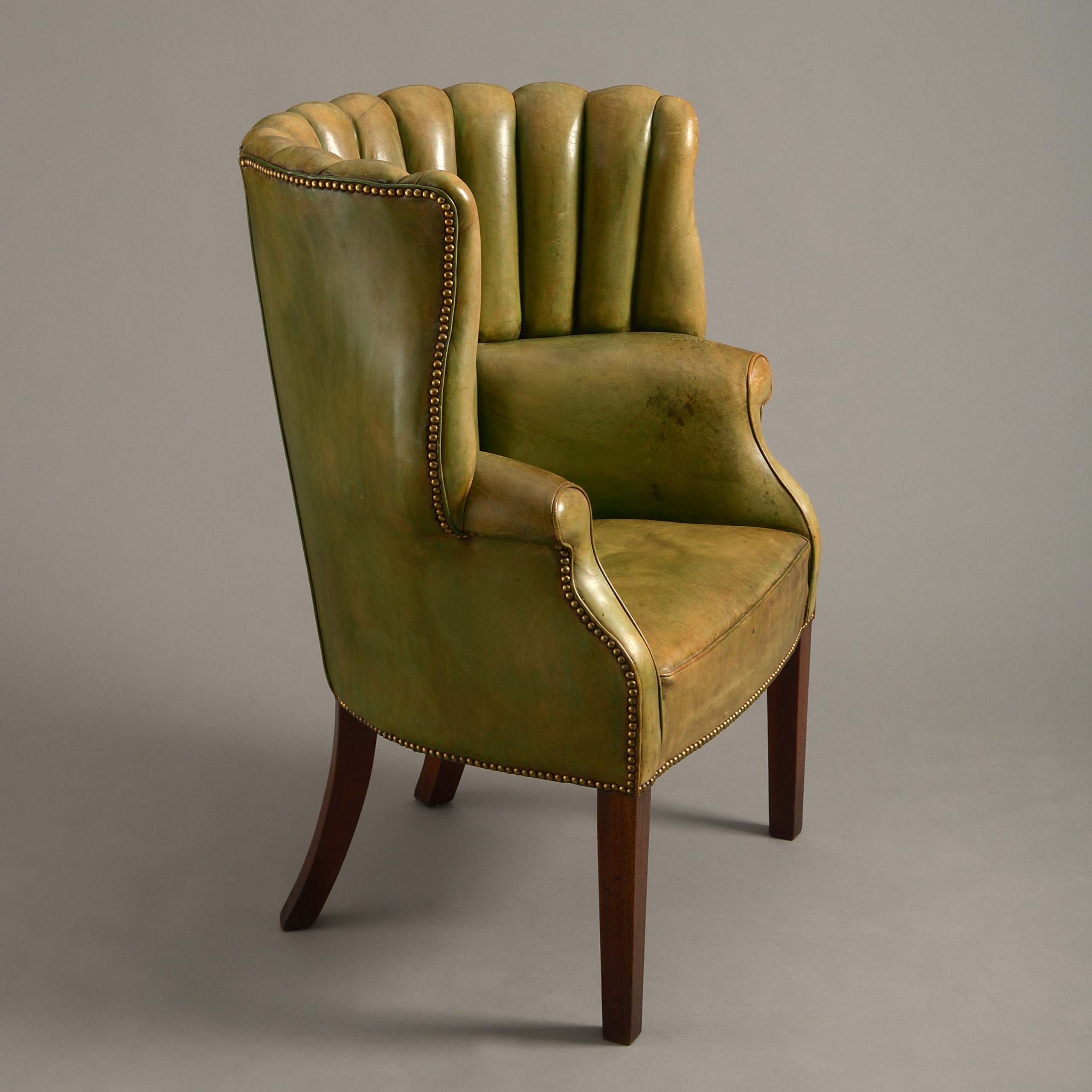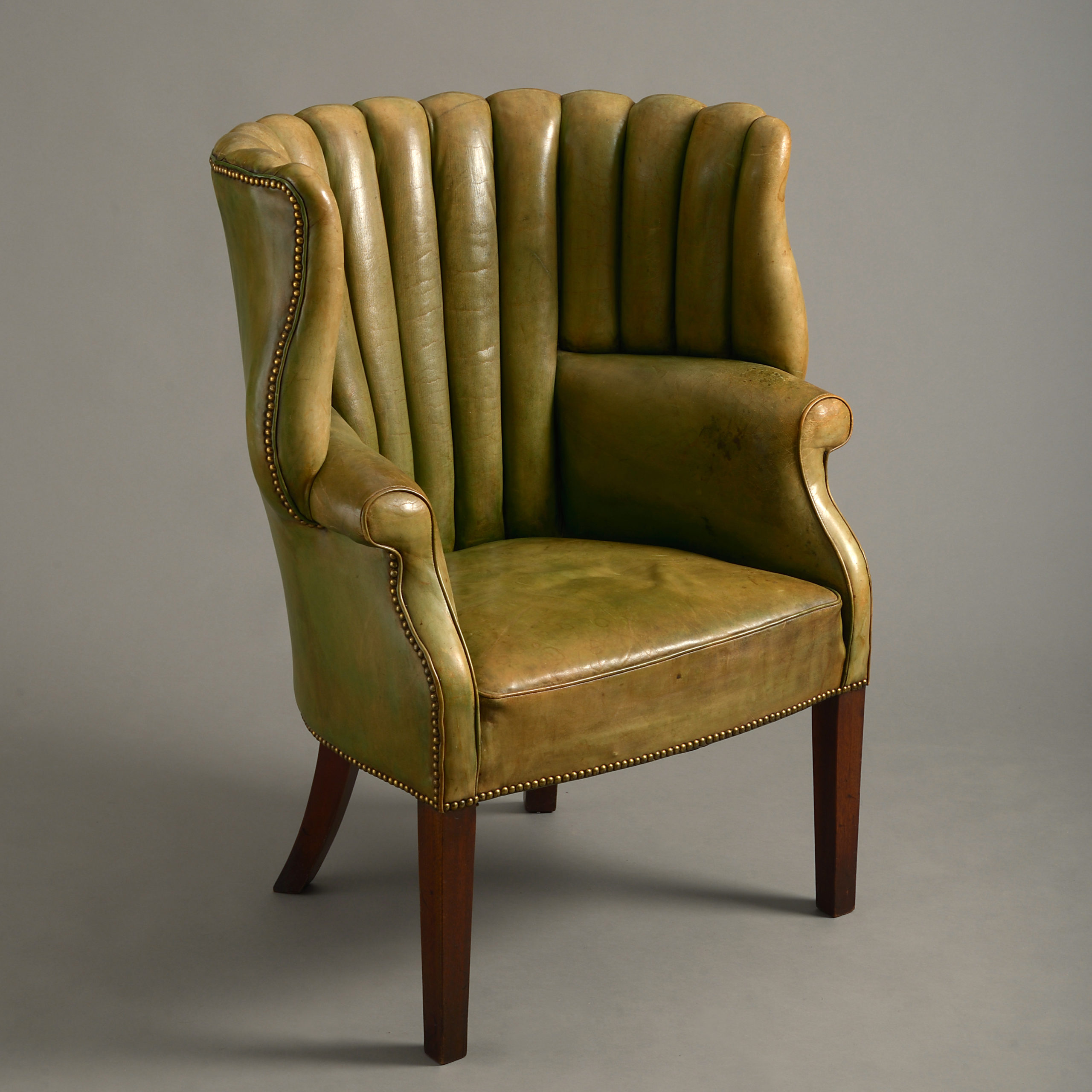 A late 19th century George III style green leather upholstered armchair, raised on square tapering mahogany legs.