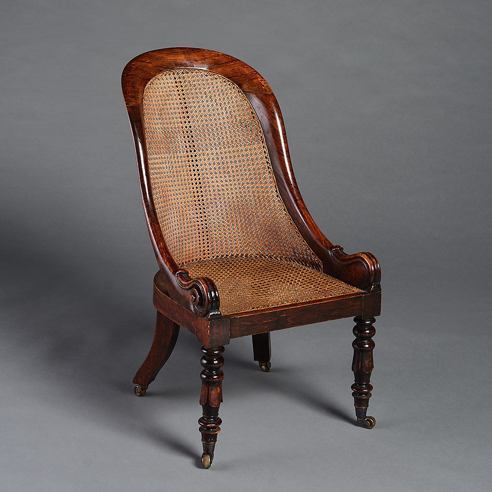An early 19th century small scale Regency faux painted rosewood Bergere, the rounded back and seat with caning, raised upon turned legs with palmette decoration and terminating in brass castors. Together with a leather covered cushion seat.