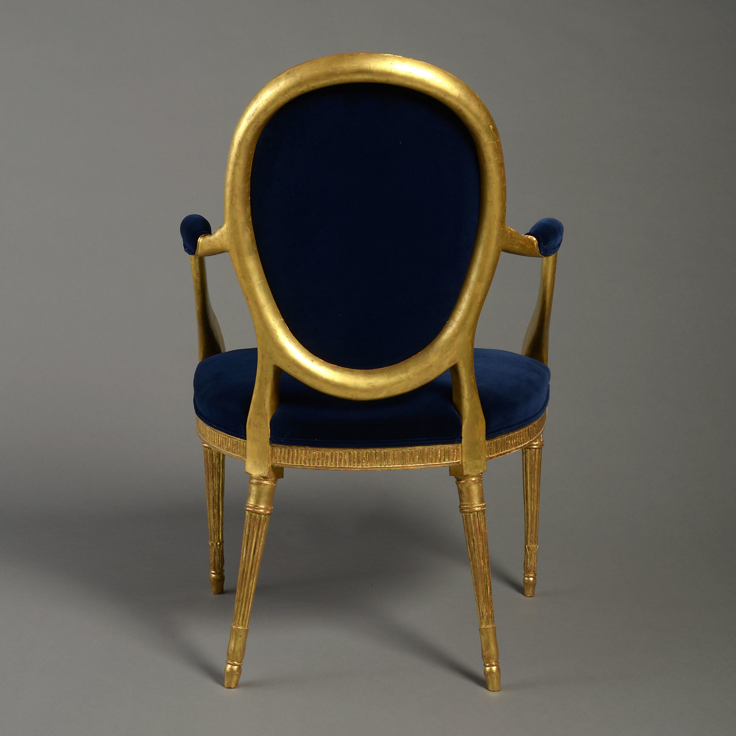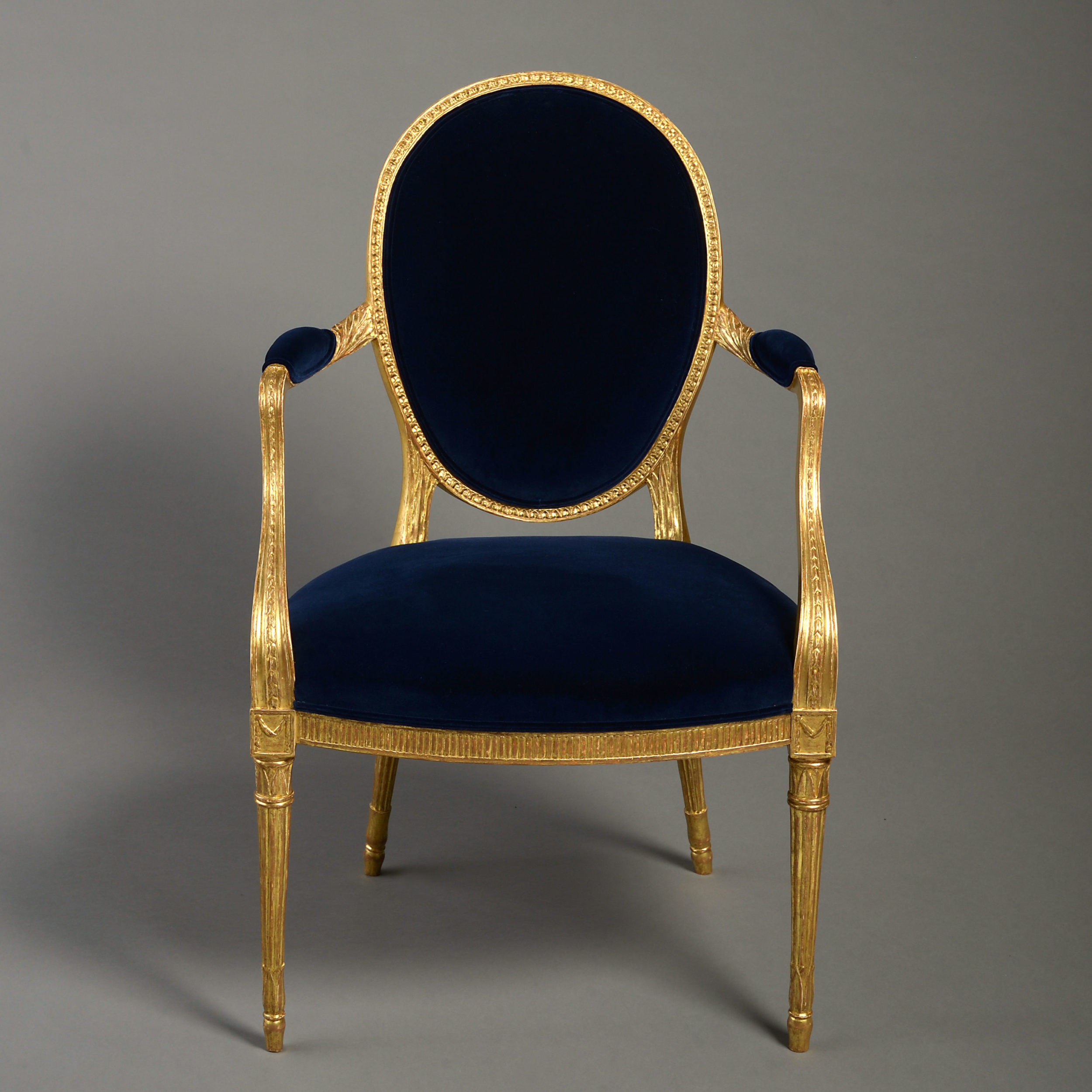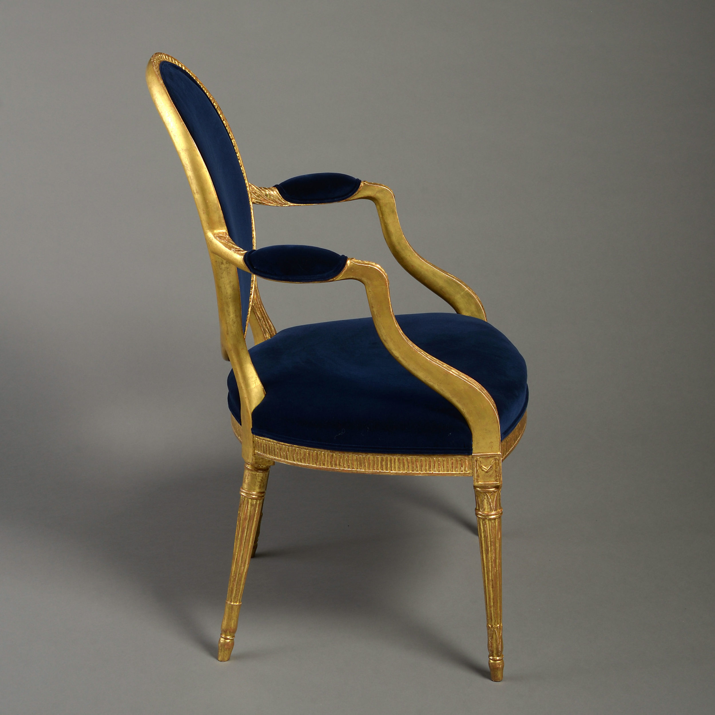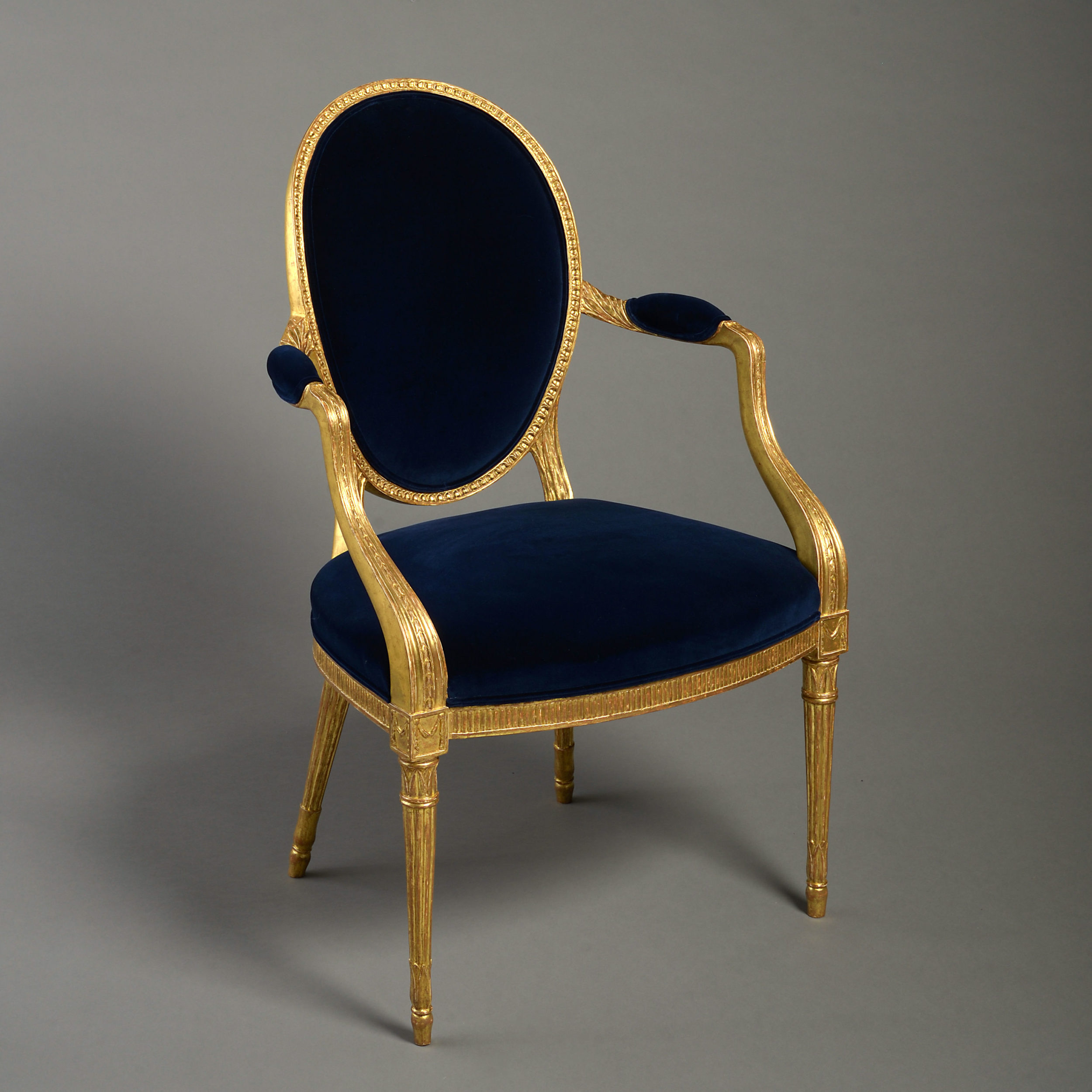 A fine late 18th century carved giltwood open armchair in the Adam taste, having an palmette moulded stuffed oval back with swooping arms, the overstuffed seat with fluted rail, and terminating in turned legs with foliate carving in the Classical manner.