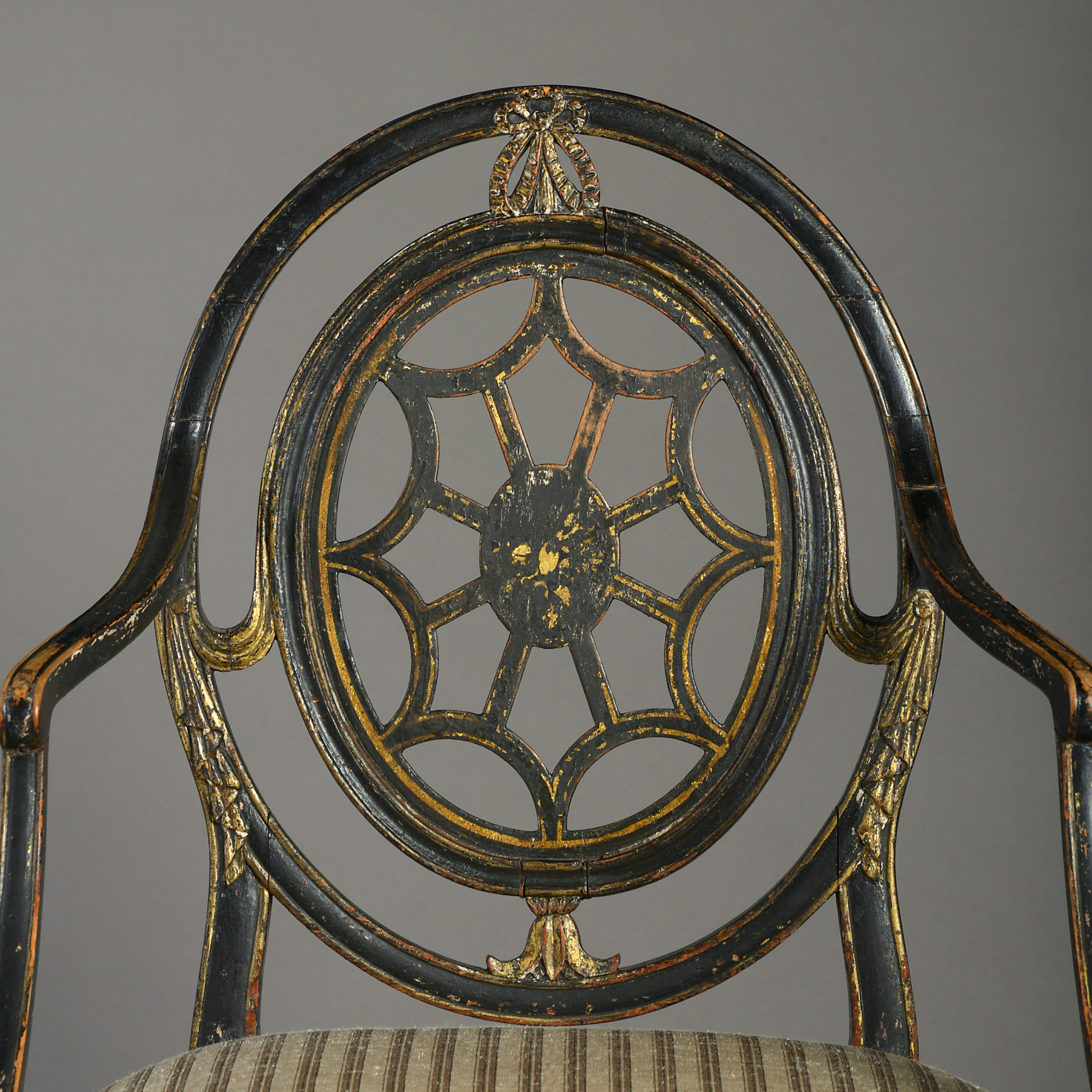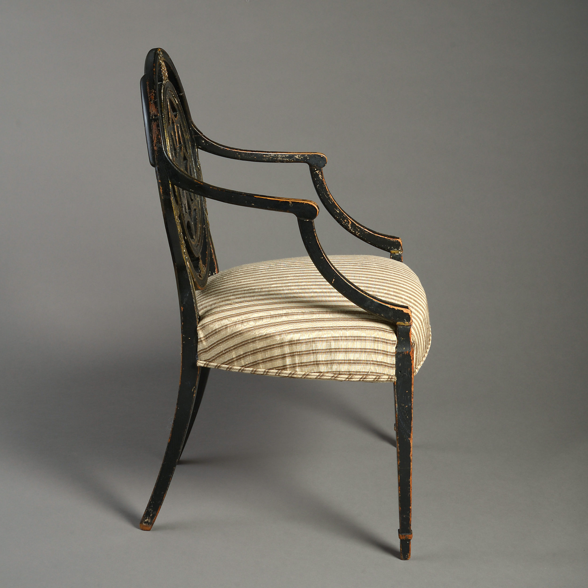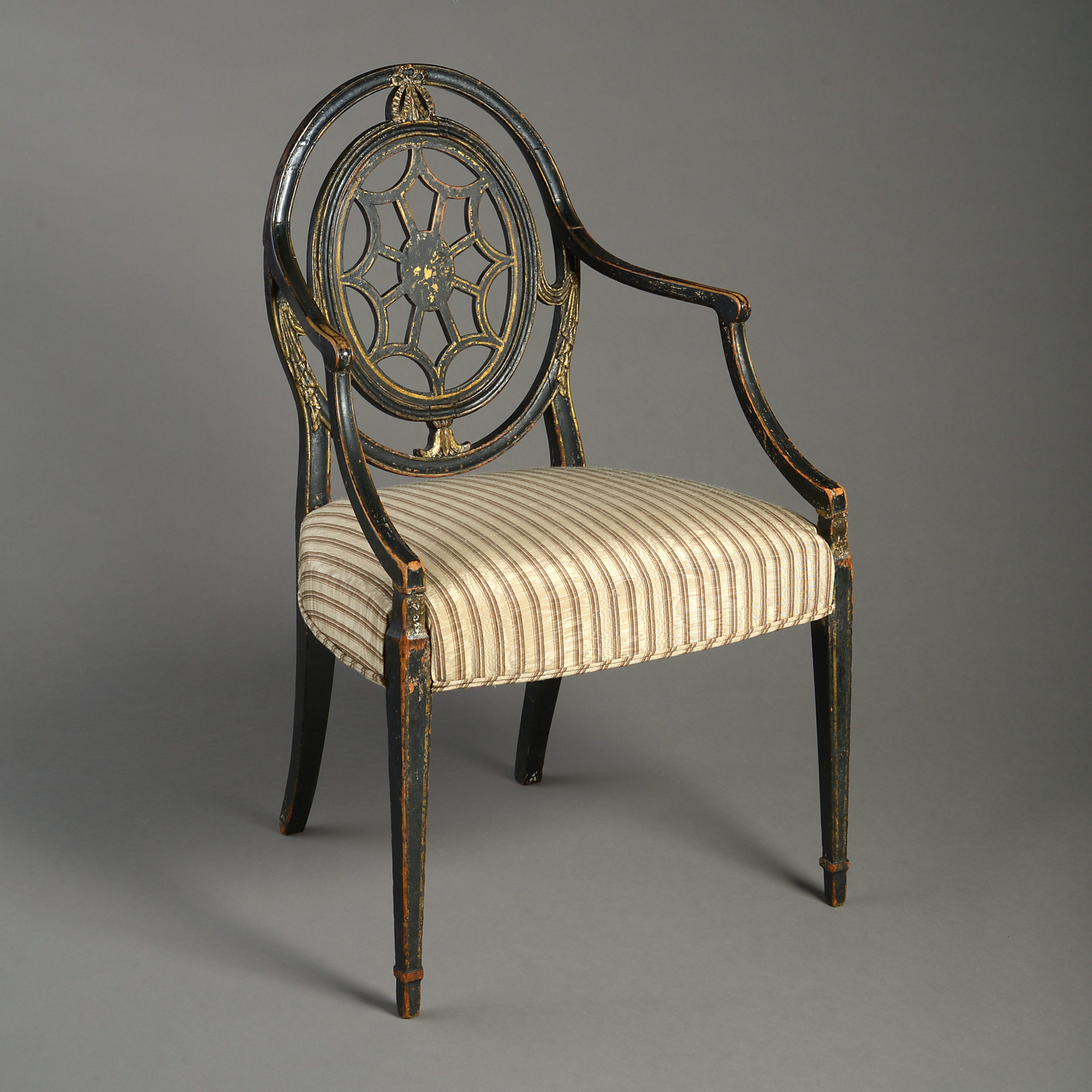 A late 18th century George III Period ebonised and parcel gilded open armchair, having an oval back with carved swags and an upholstered seat, the whole supported upon square tapering legs.