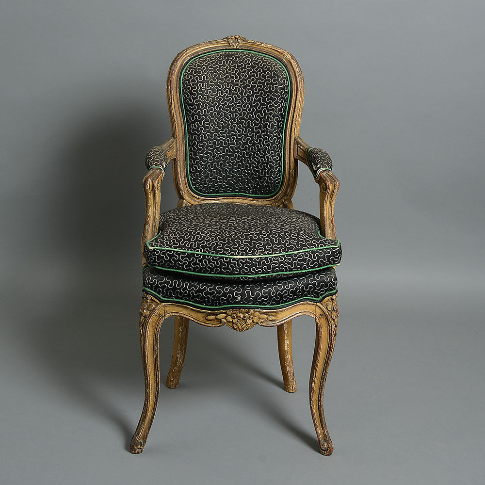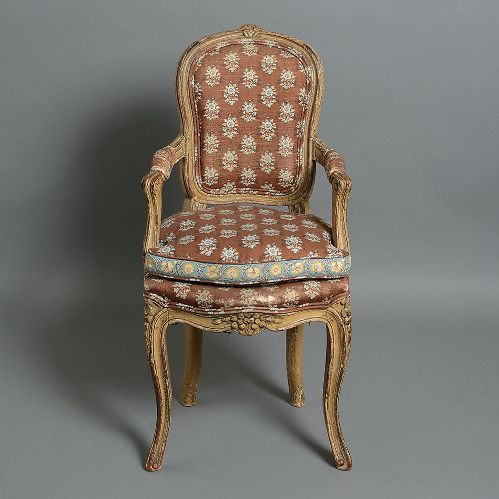 A rare pair of mid-18th century painted miniature fauteuil, both with upholstered cartouche backs, scrolling arms and over-stuffed seats and raised on cabriole legs.
