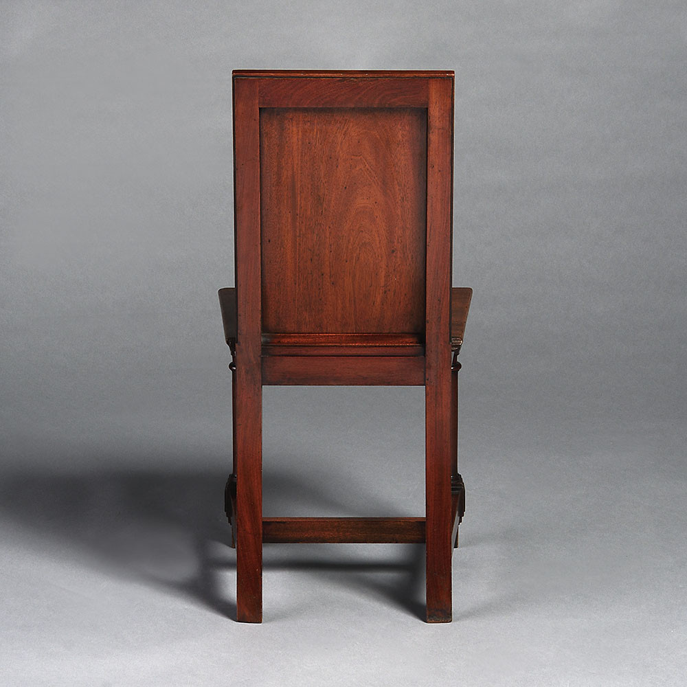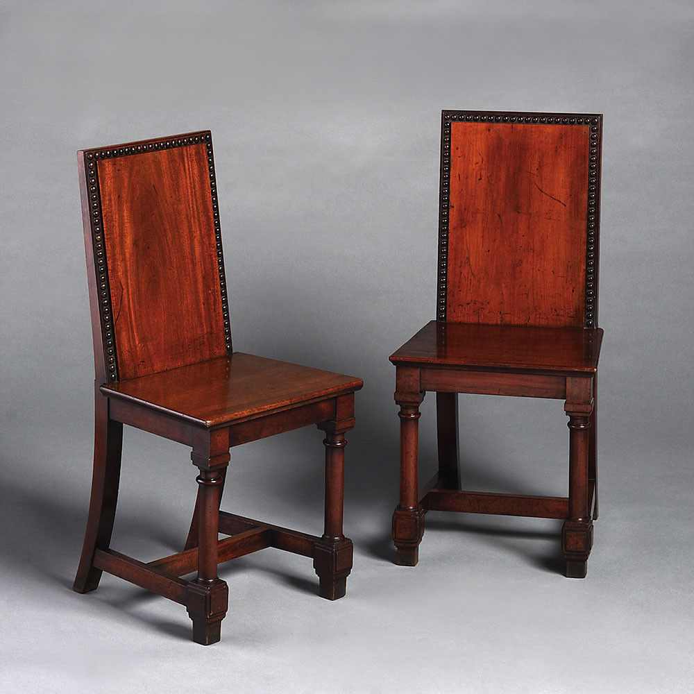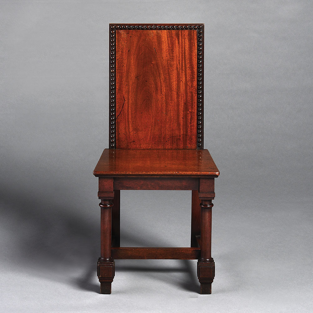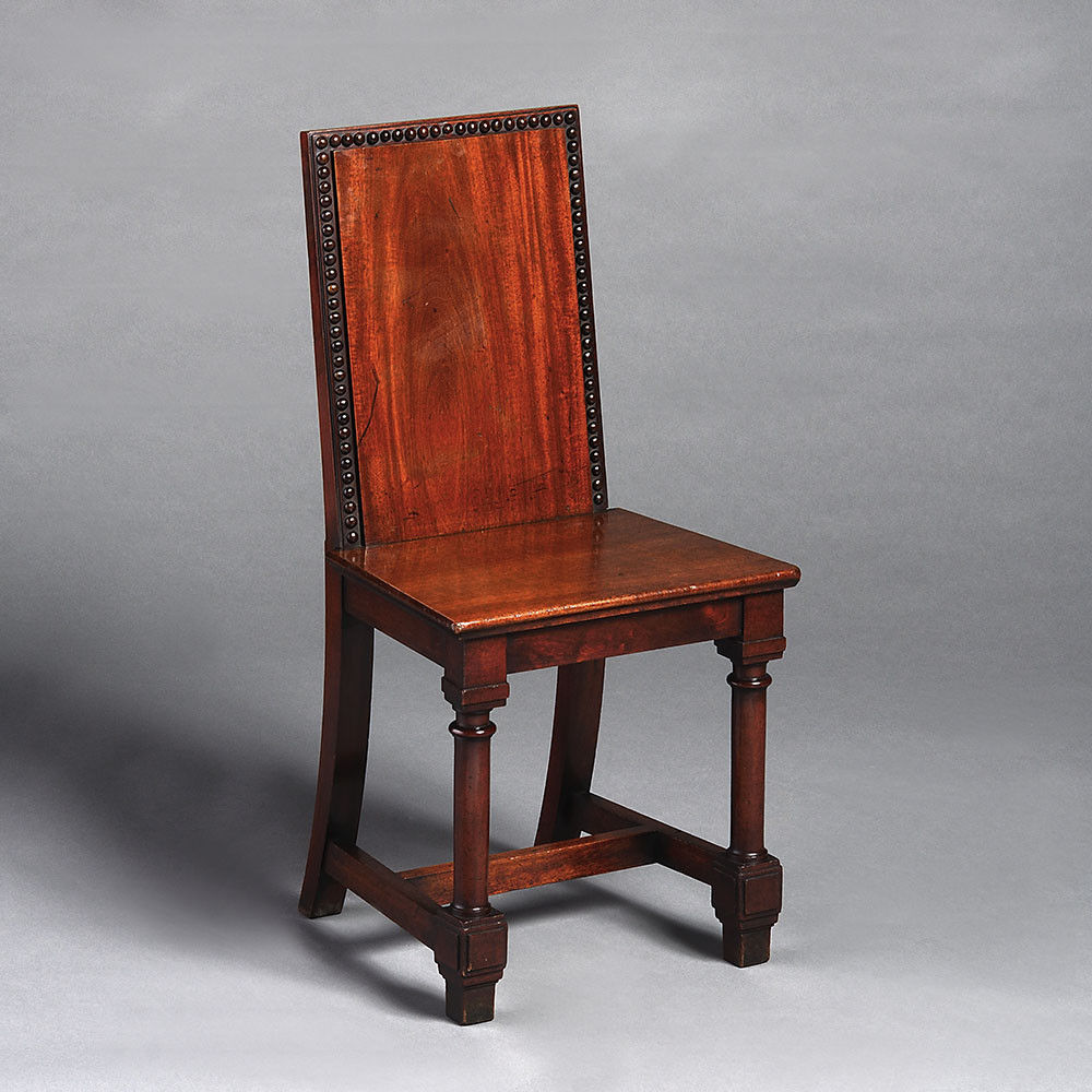 During the 18th and 19th centuries, Hall Chairs became a staple in any grand English dwelling. A product of the Grand Tour, the idea of the Hall Chair stemmed from the Italian ‘Scabeli’, an essential part of the 16th century nobel palazzi of Italy. It soon, however, adopted particularly English elements, adding to the austere English entrance hall. The objective of the chair was to provide occasional seating with little focus on comfort in favour of practicality. The decoration is essentially formal as these chairs were considered and designed to complement their architectural surroundings.