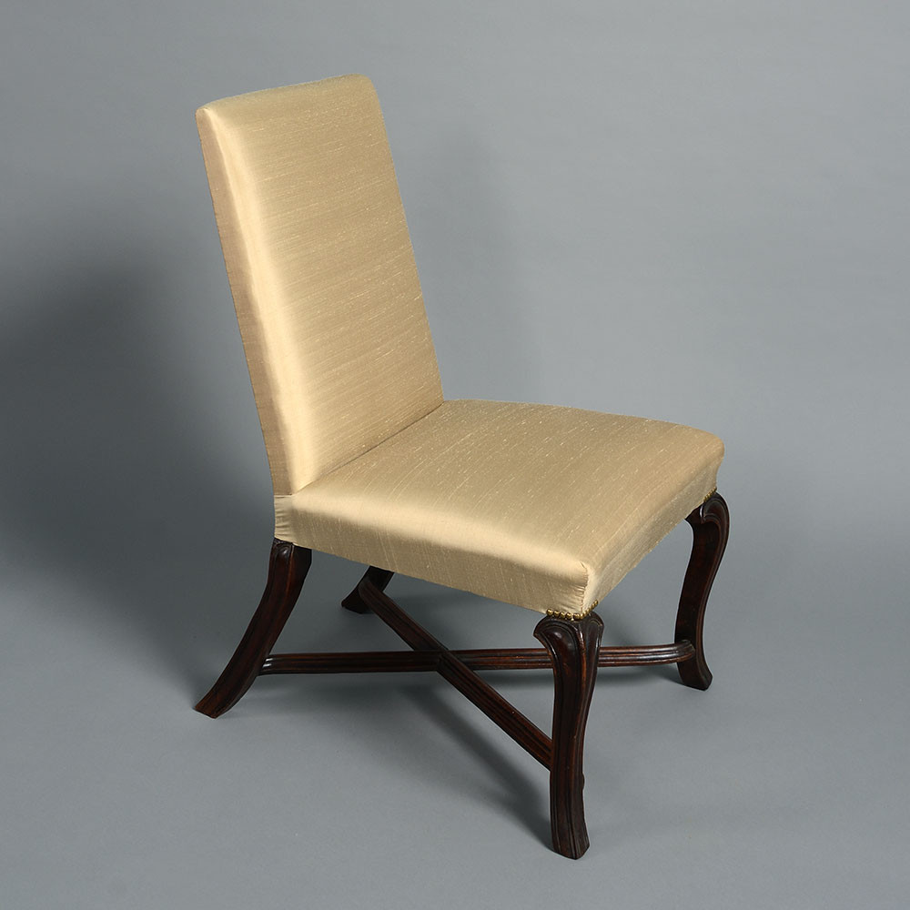 An early 18th century upholstered side chair in the William & Mary manner, the frame with square back set upon four faceted cabriole legs and joined by elongated cross stretchers.