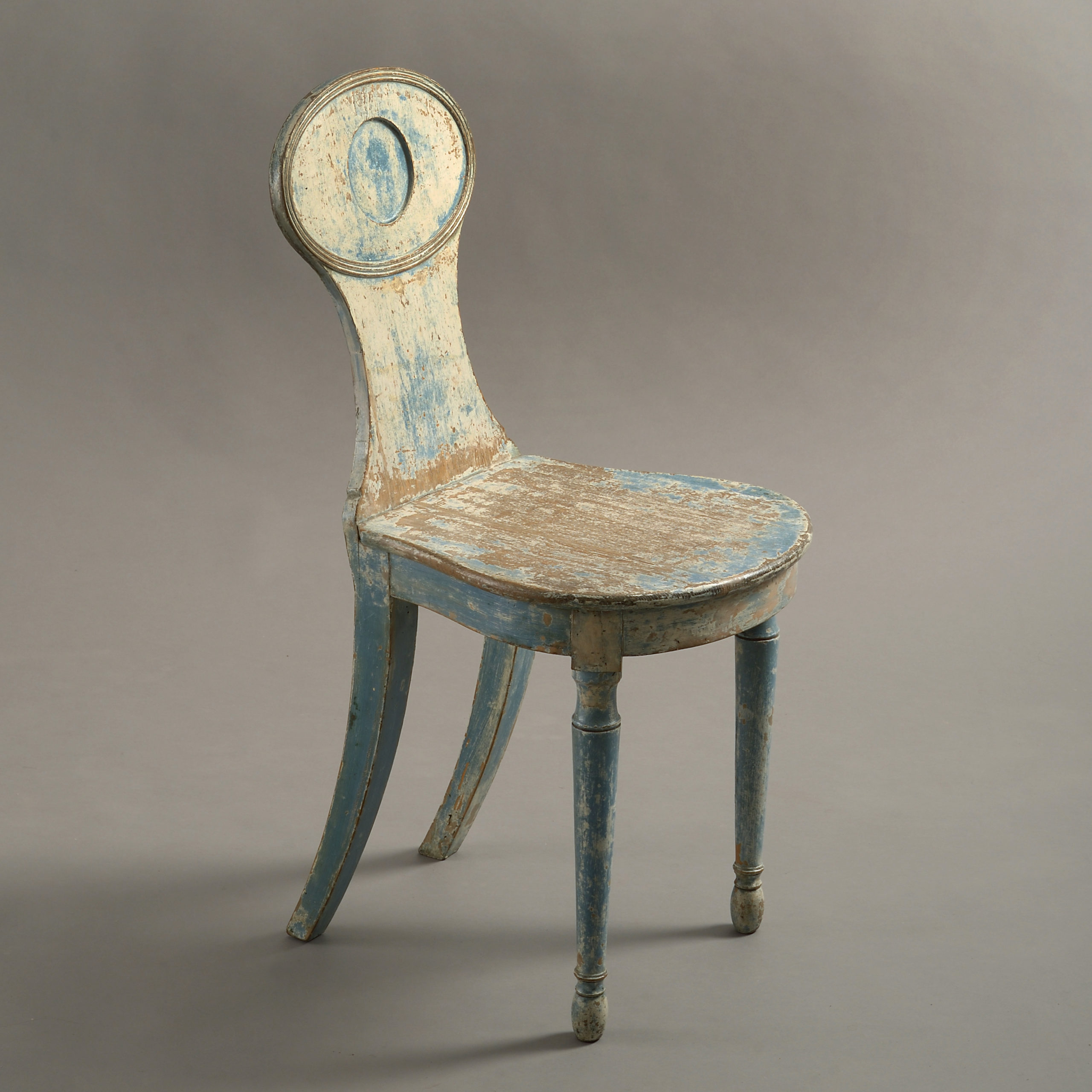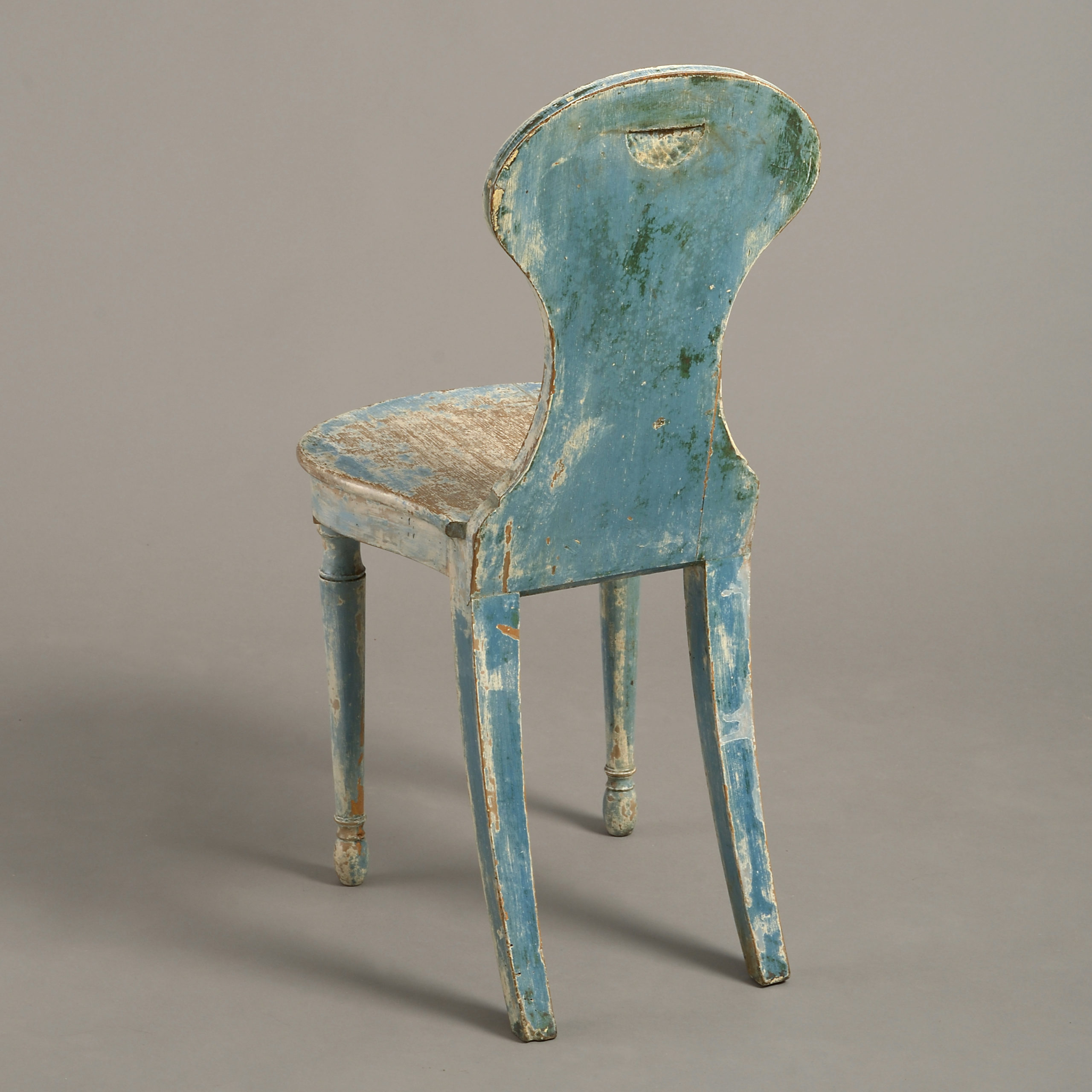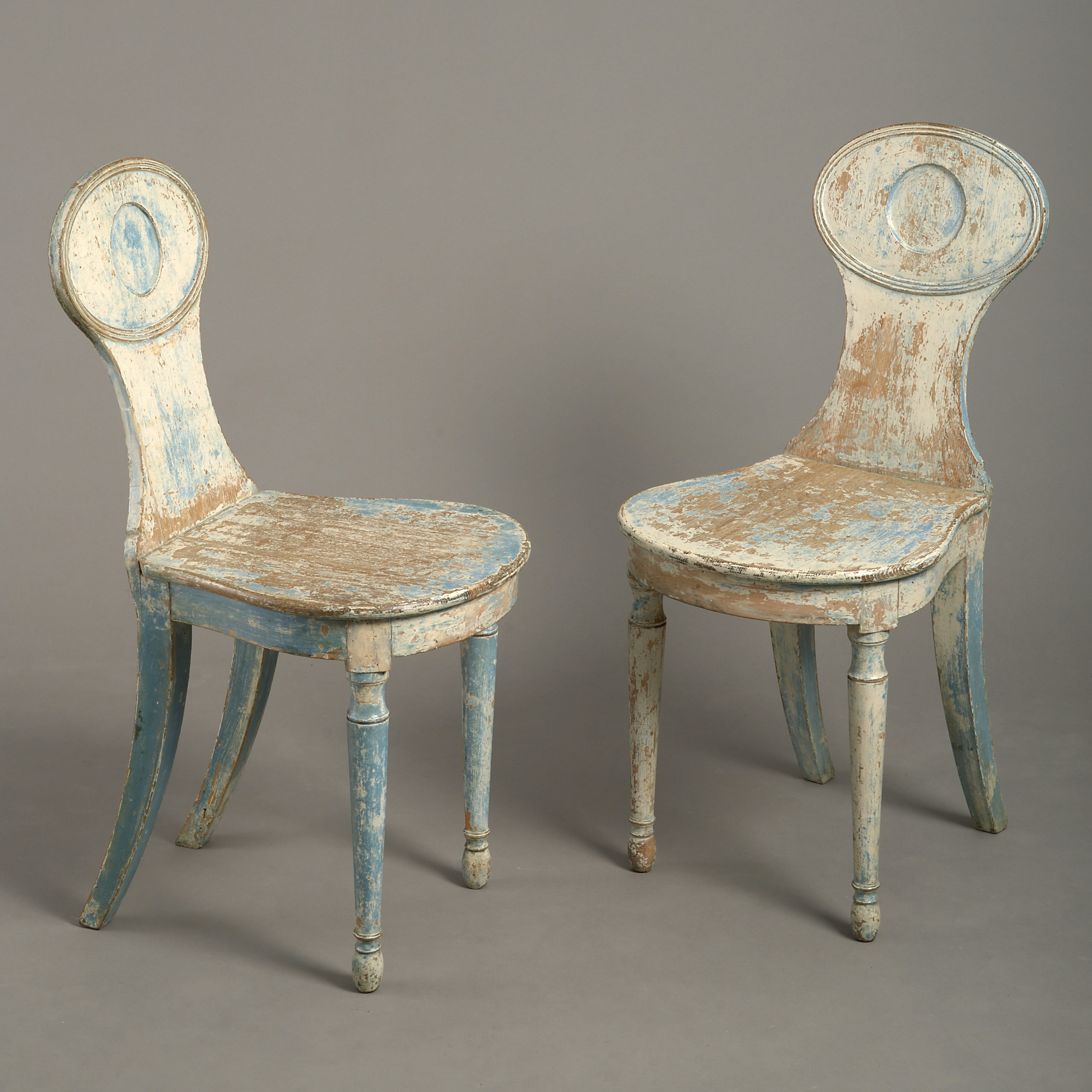 A pair of early 19th century Regency Period blue painted hall chairs, having oval backs, shaped seats and turned legs. The undersides stamped with the mark for John Gee.