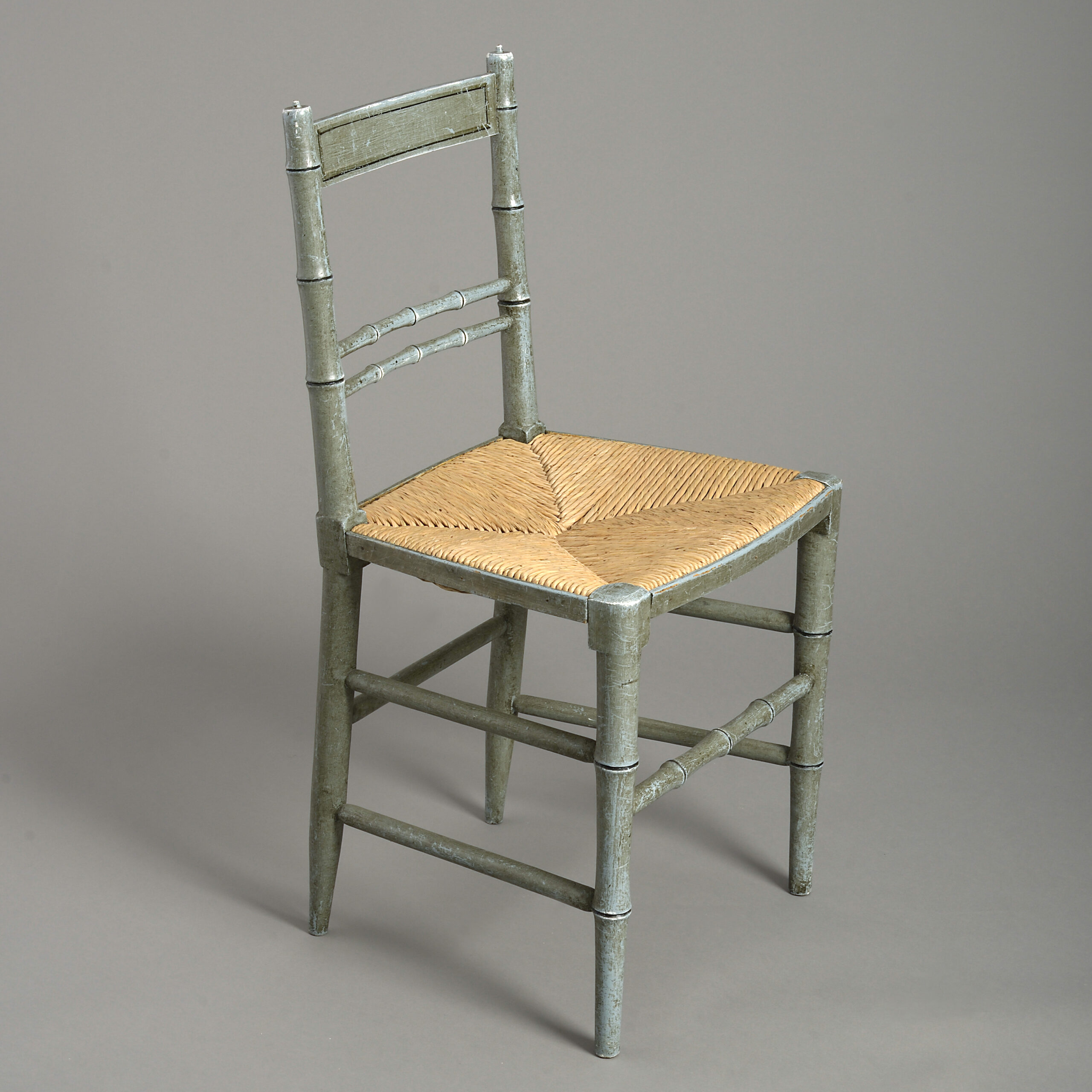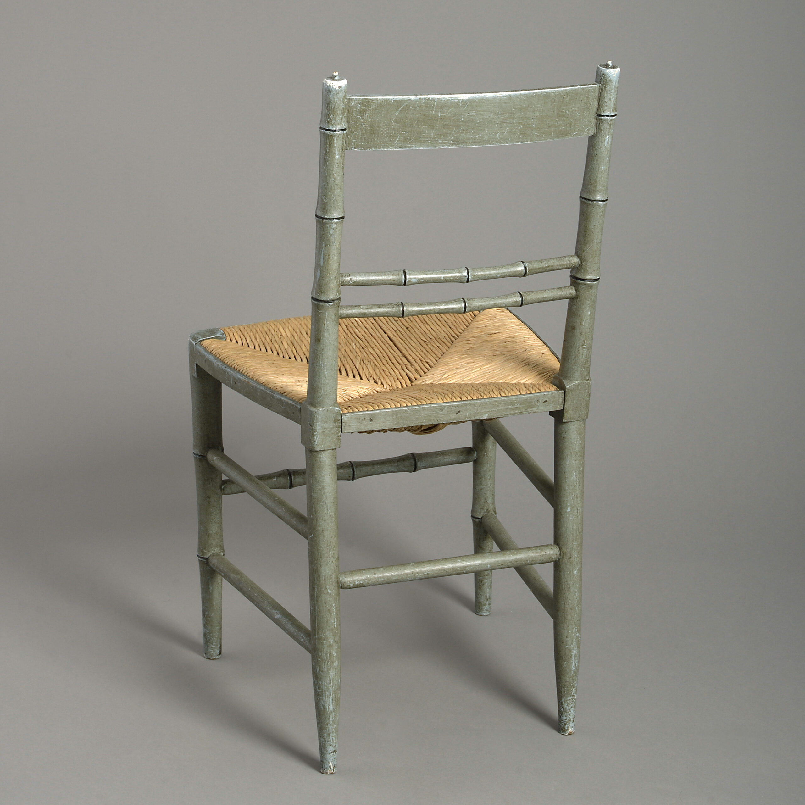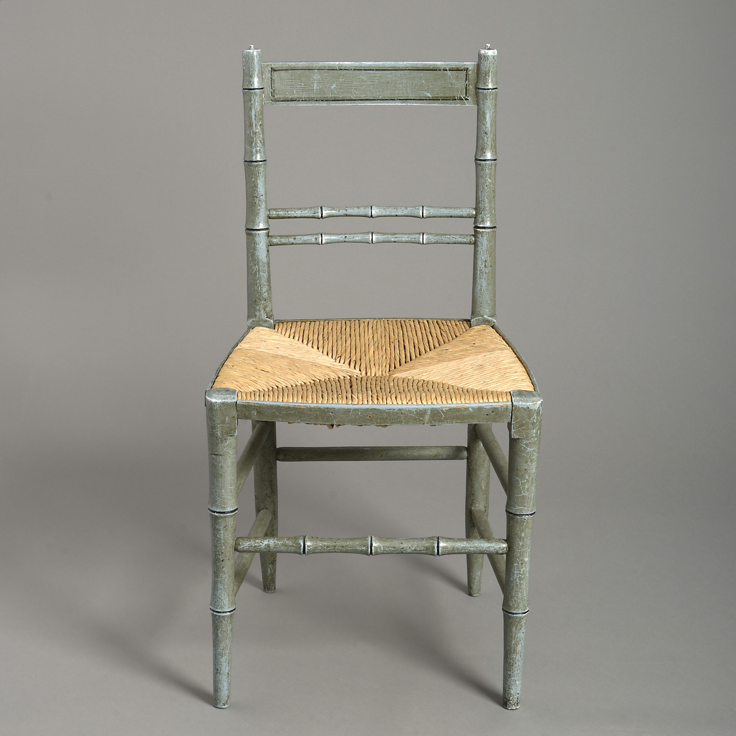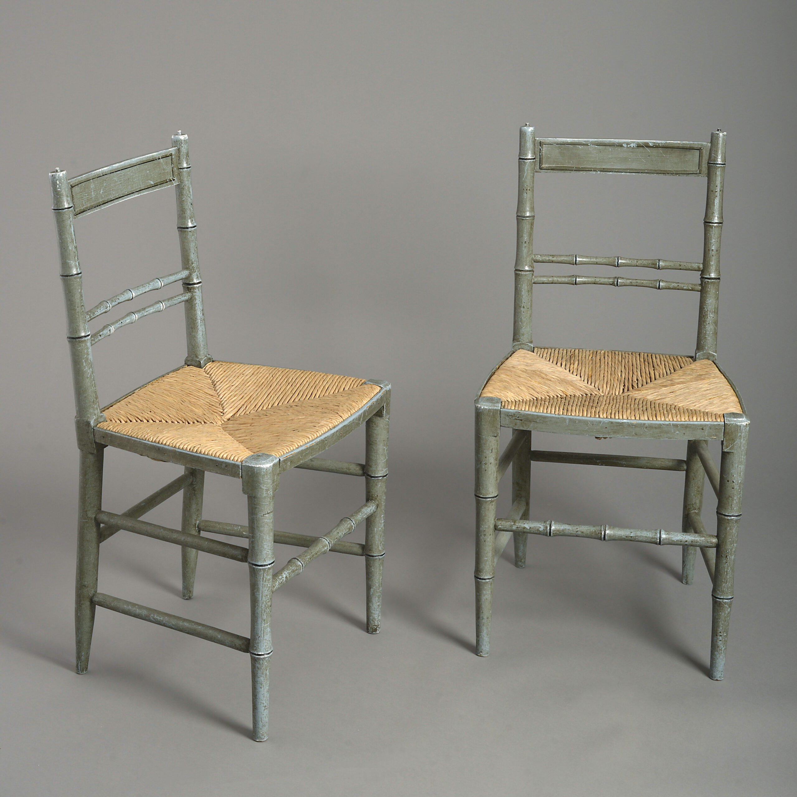 A pair of early nineteenth century panted Regency Period side chairs, having faux bamboo turned frames and stretchers and rush seats.