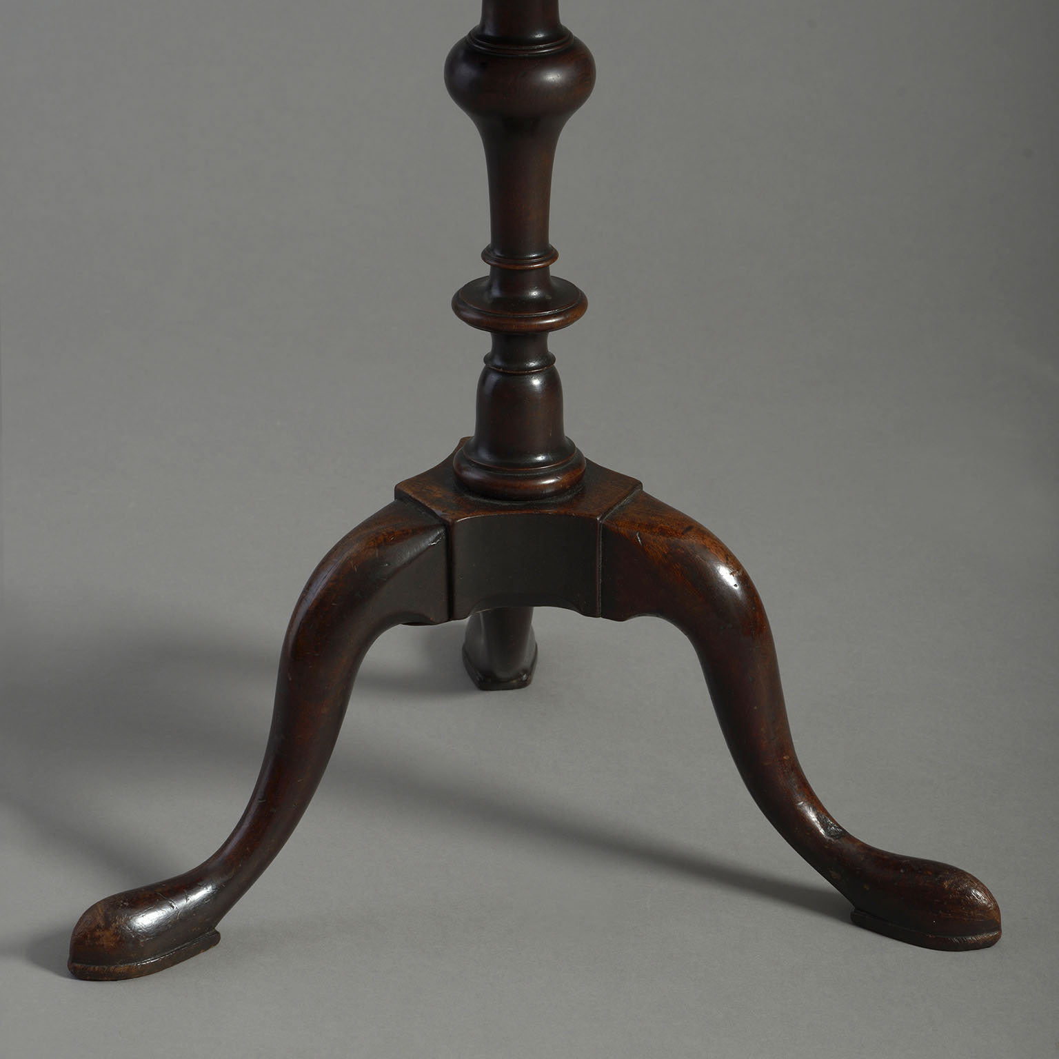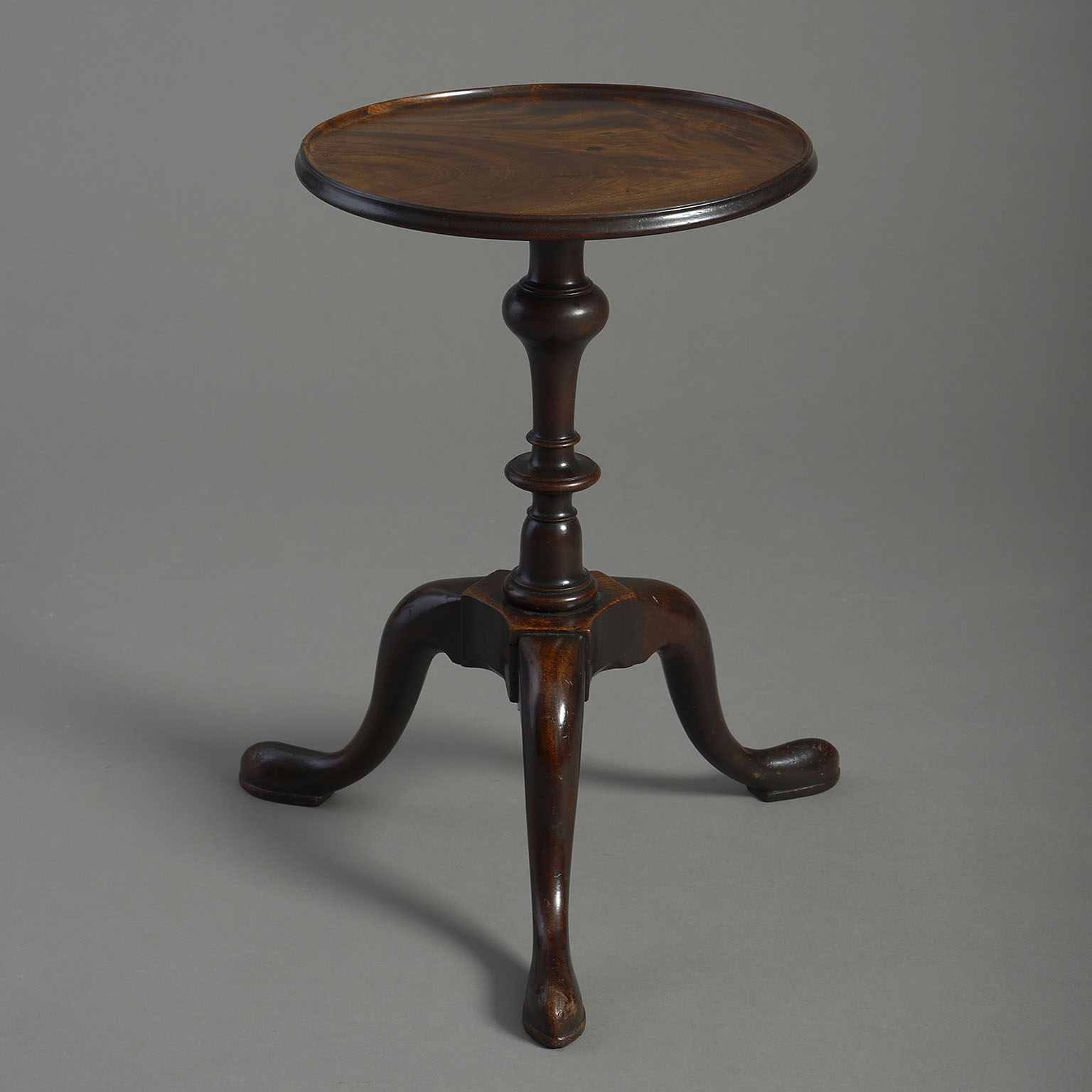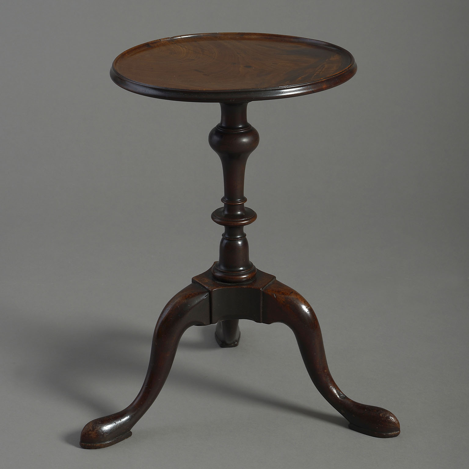 A mid-eighteenth century George II Period mahogany tripod kettle stand, the figured dish top raised upon a turned stem and all terminating in three cabriole legs.