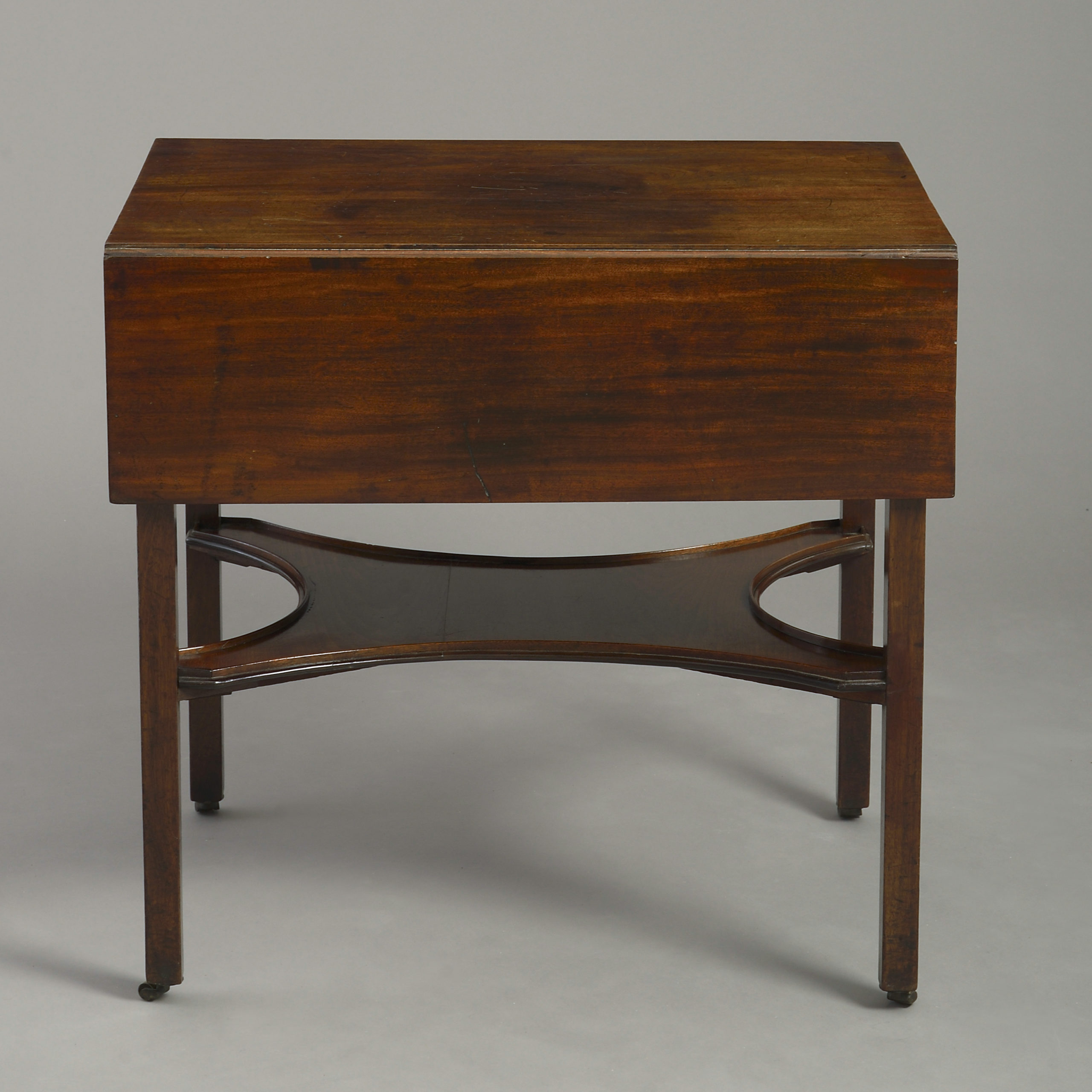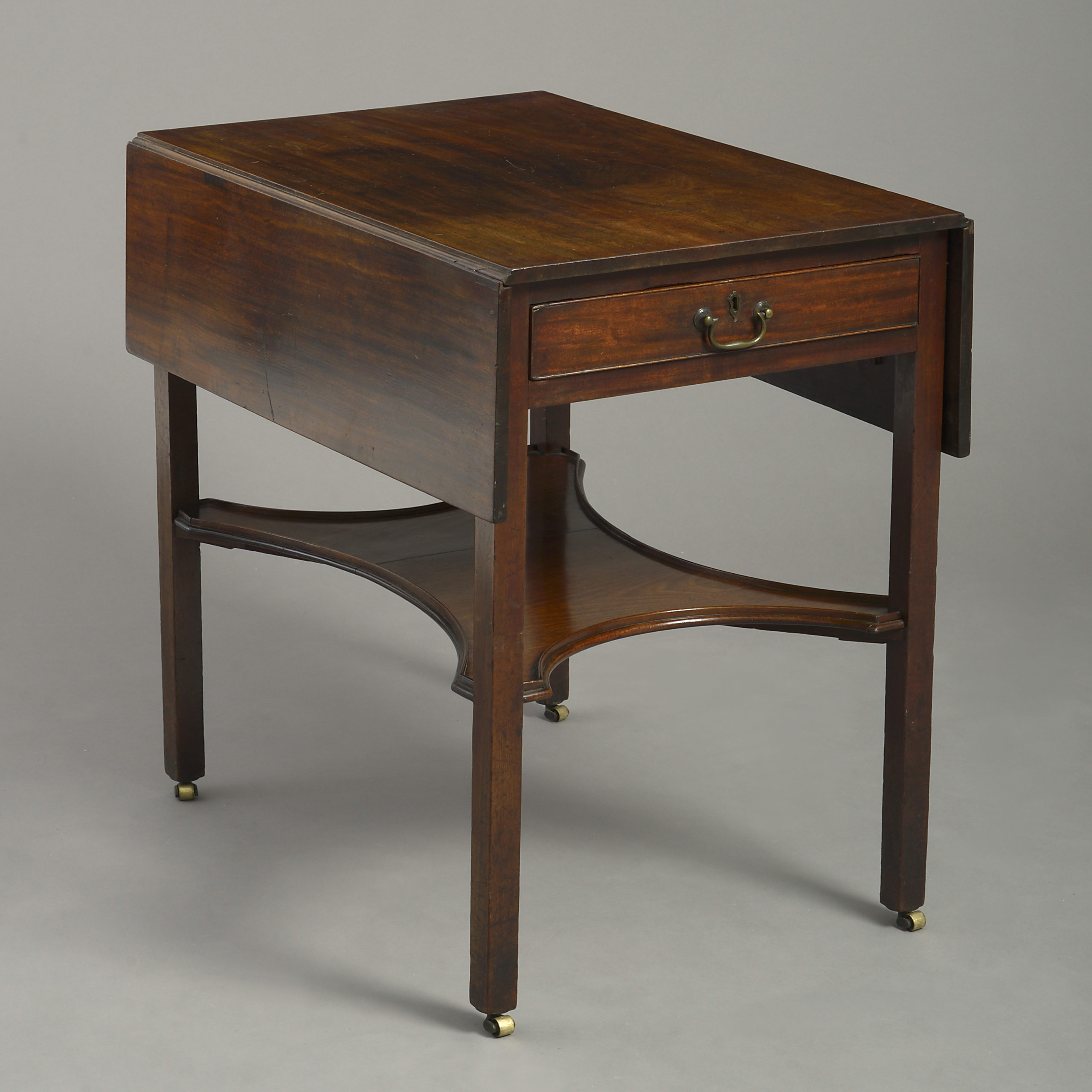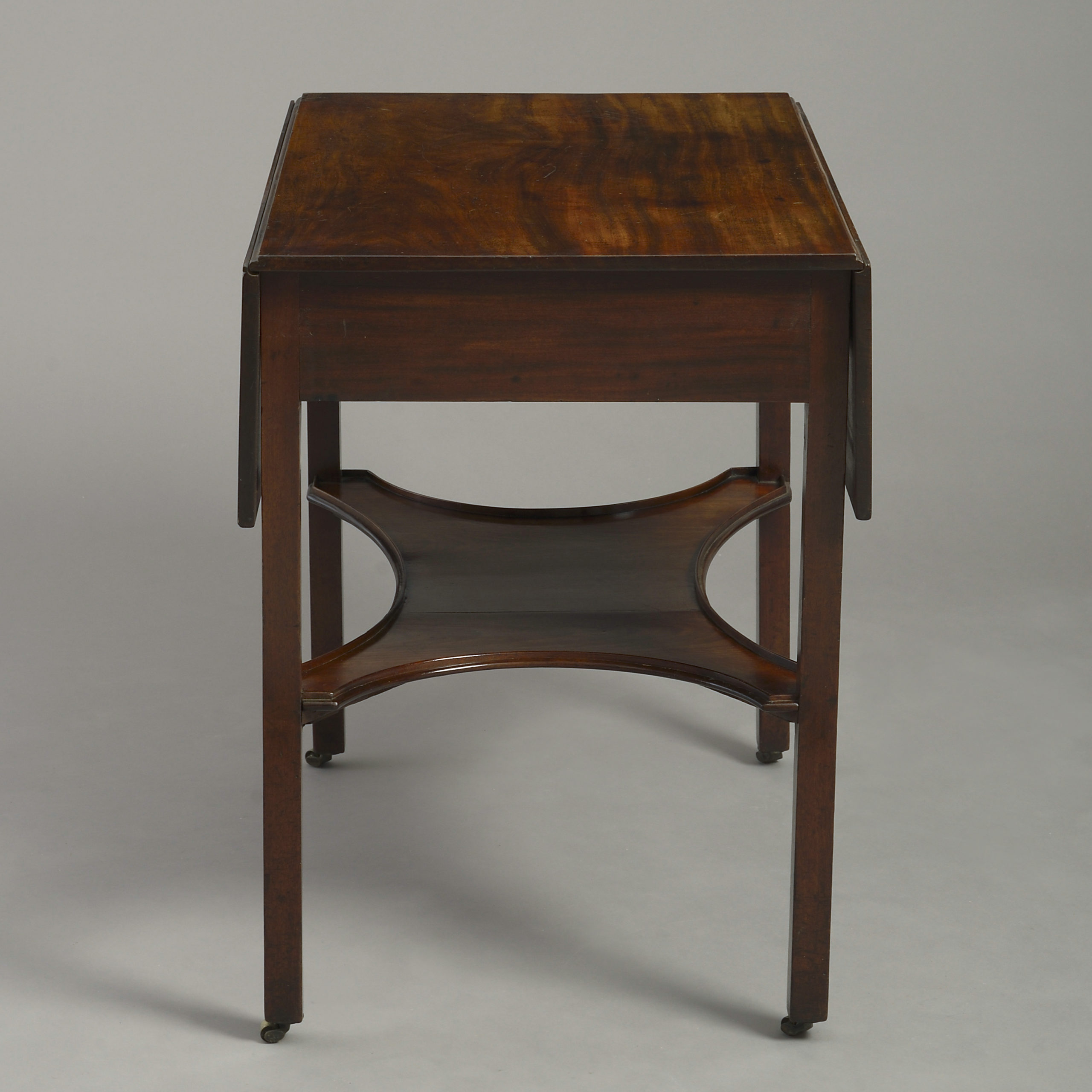 An eighteenth century mahogany supper table, the top with two flaps above a single drawer with brass swan neck handle, raised on square block legs with concave lower shelf, all terminating in the original brass castors.