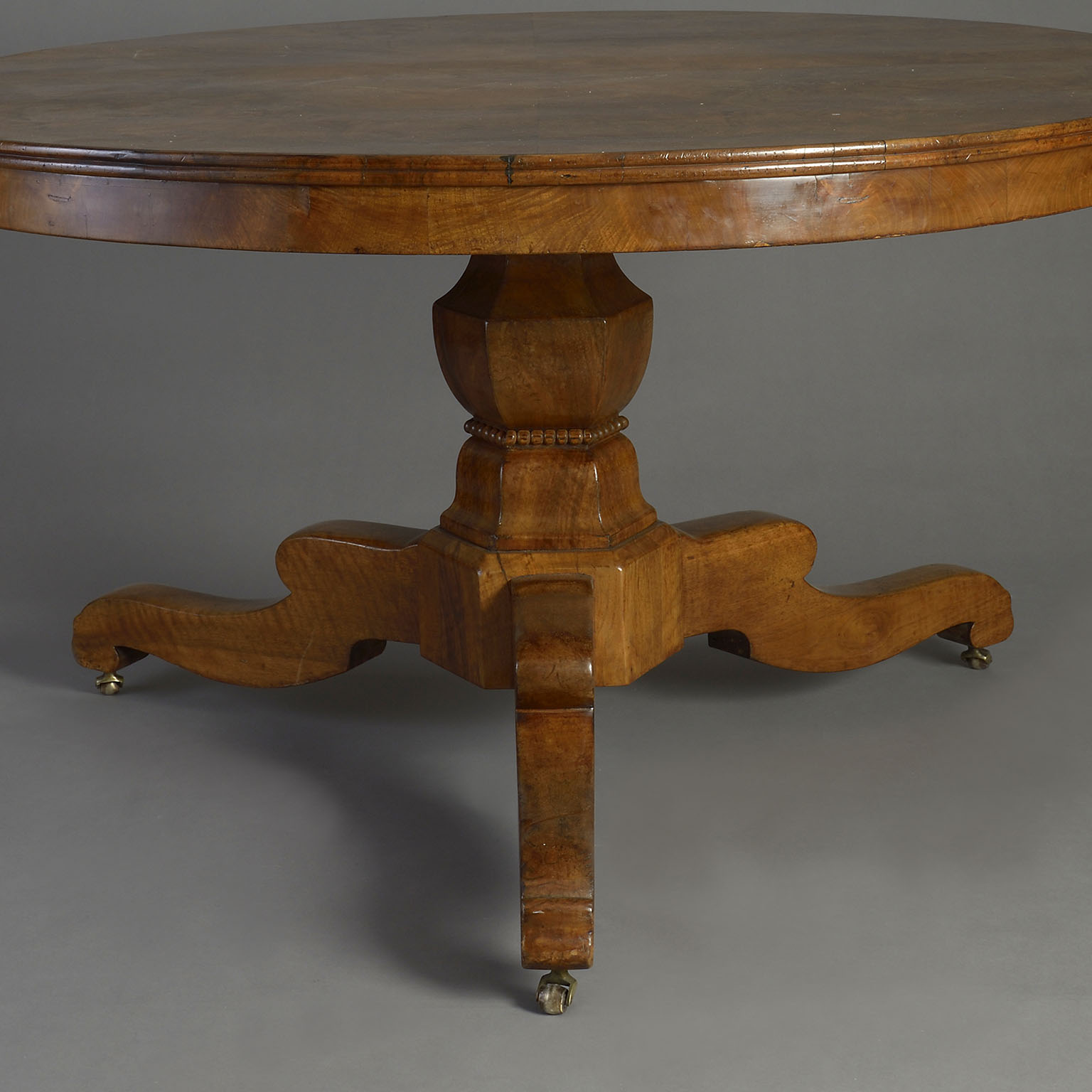 A mid-nineteenth century richly figured burr walnut centre table, the segmental veneered top set upon a hexagonal baluster stem and raised upon a shaped tri-form base with castors.