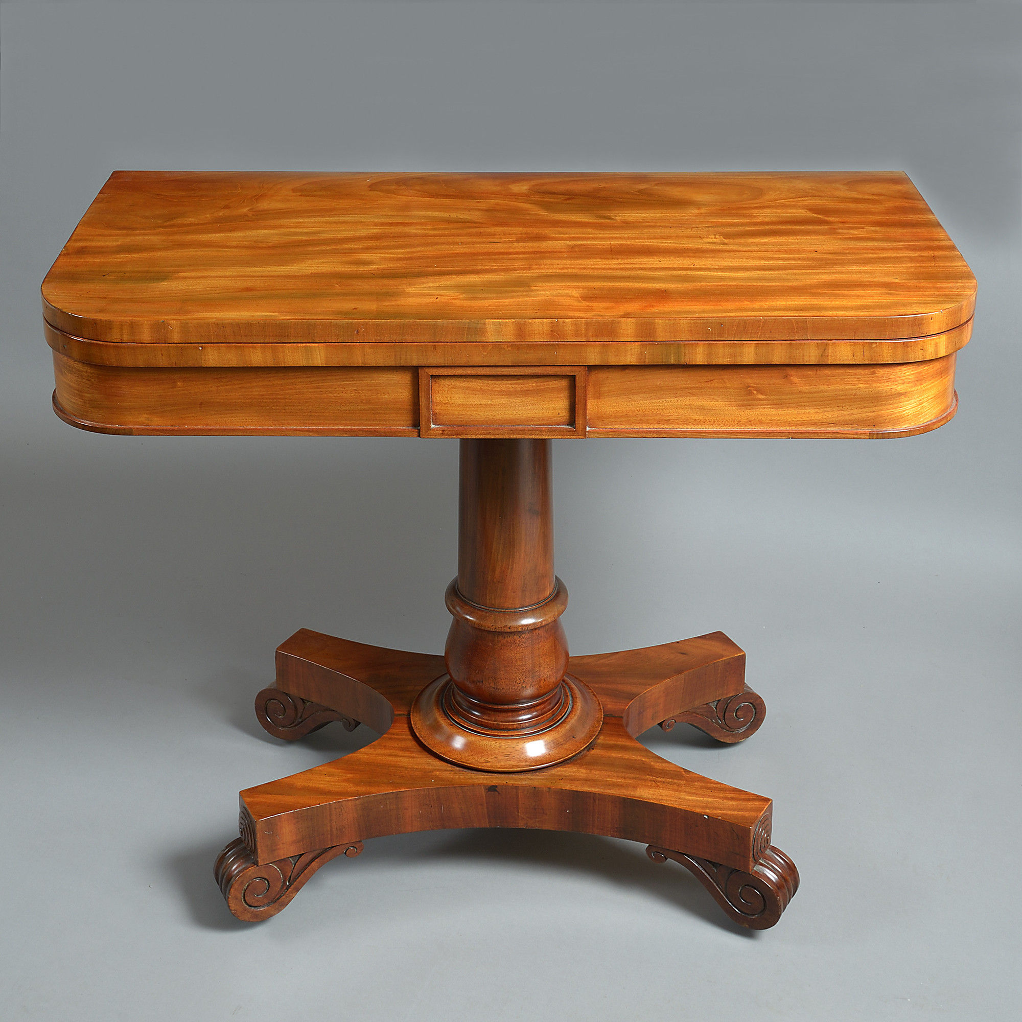 A pair of early 19th century mahogany card tables, each having a finely figured D-end top above a column stem and set upon a plinth with four scrolling feet.