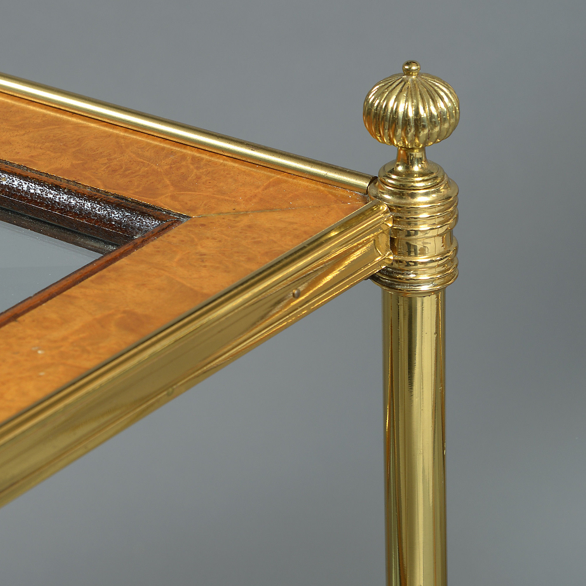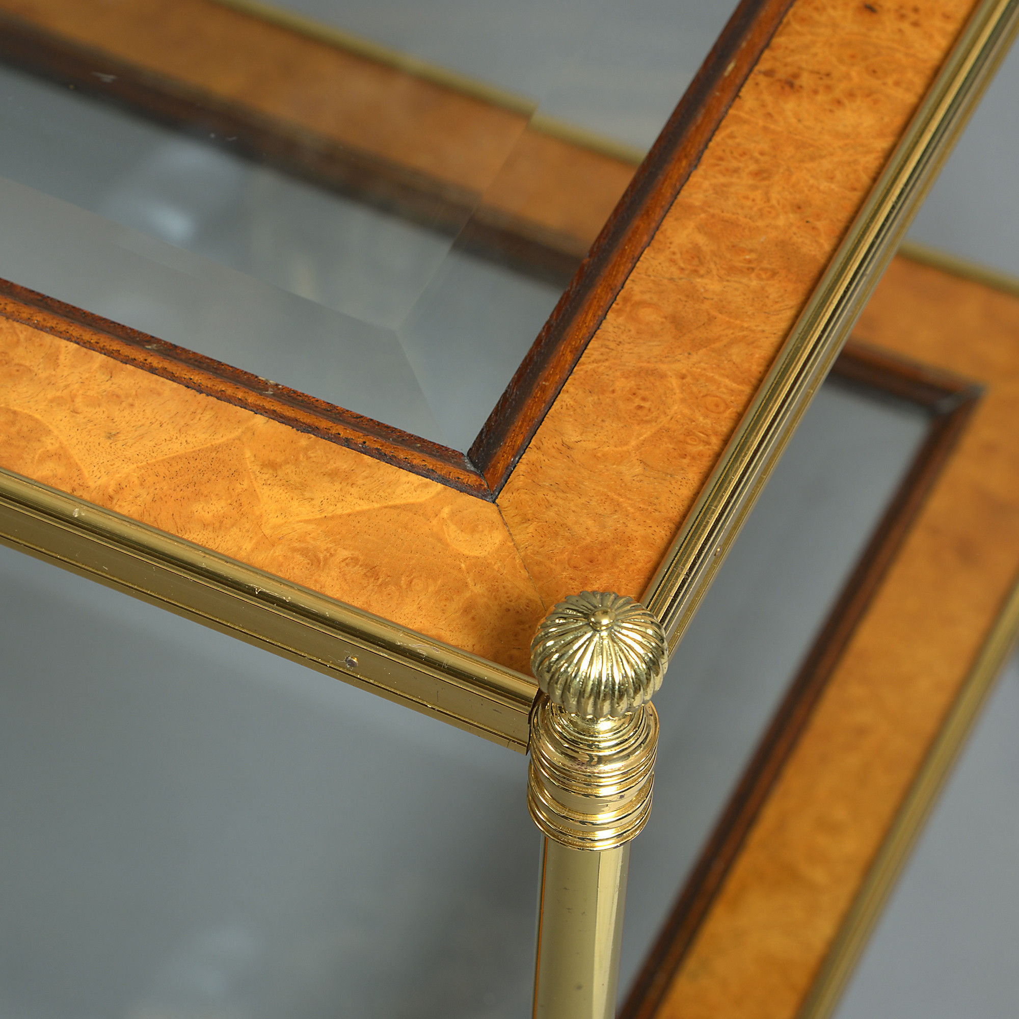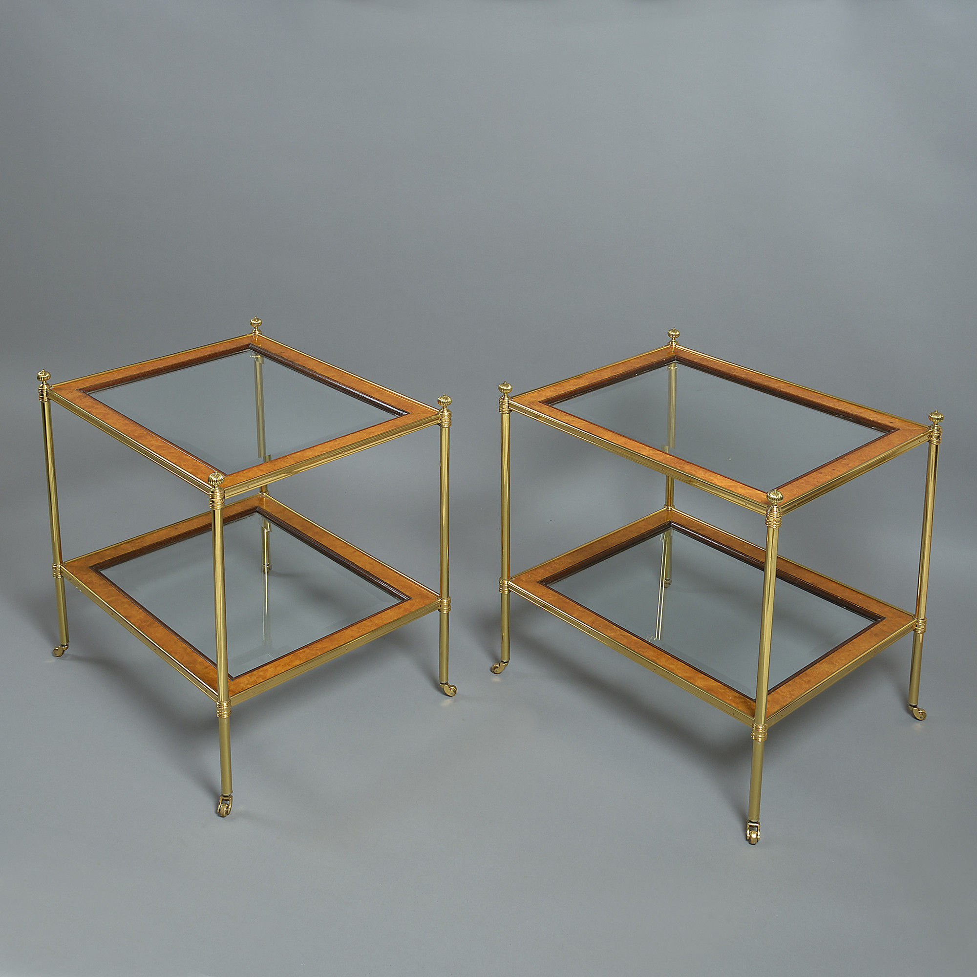 A pair of late 20th century two tier tables, the brass frames with finials and castors supporting rectangular shelves of burr satinwood and bevelled glass.