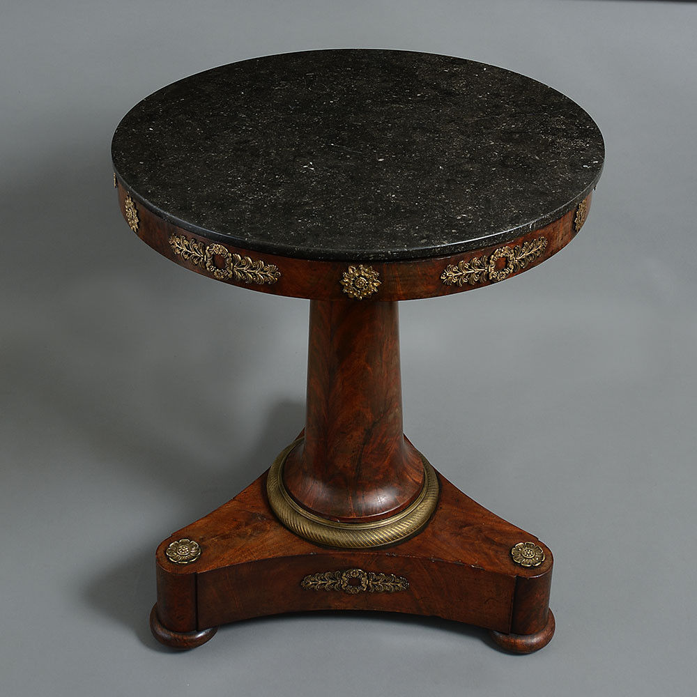 A fine early 19th century Empire Period mahogany centre table, the black fossil circular marble top above a veneered frieze with finely chased brass mounts in the Classical taste, supported by a tapering stem and terminating in a triangular form plinth mounted in the same manner, set upon bun feet with the original sunken castors.