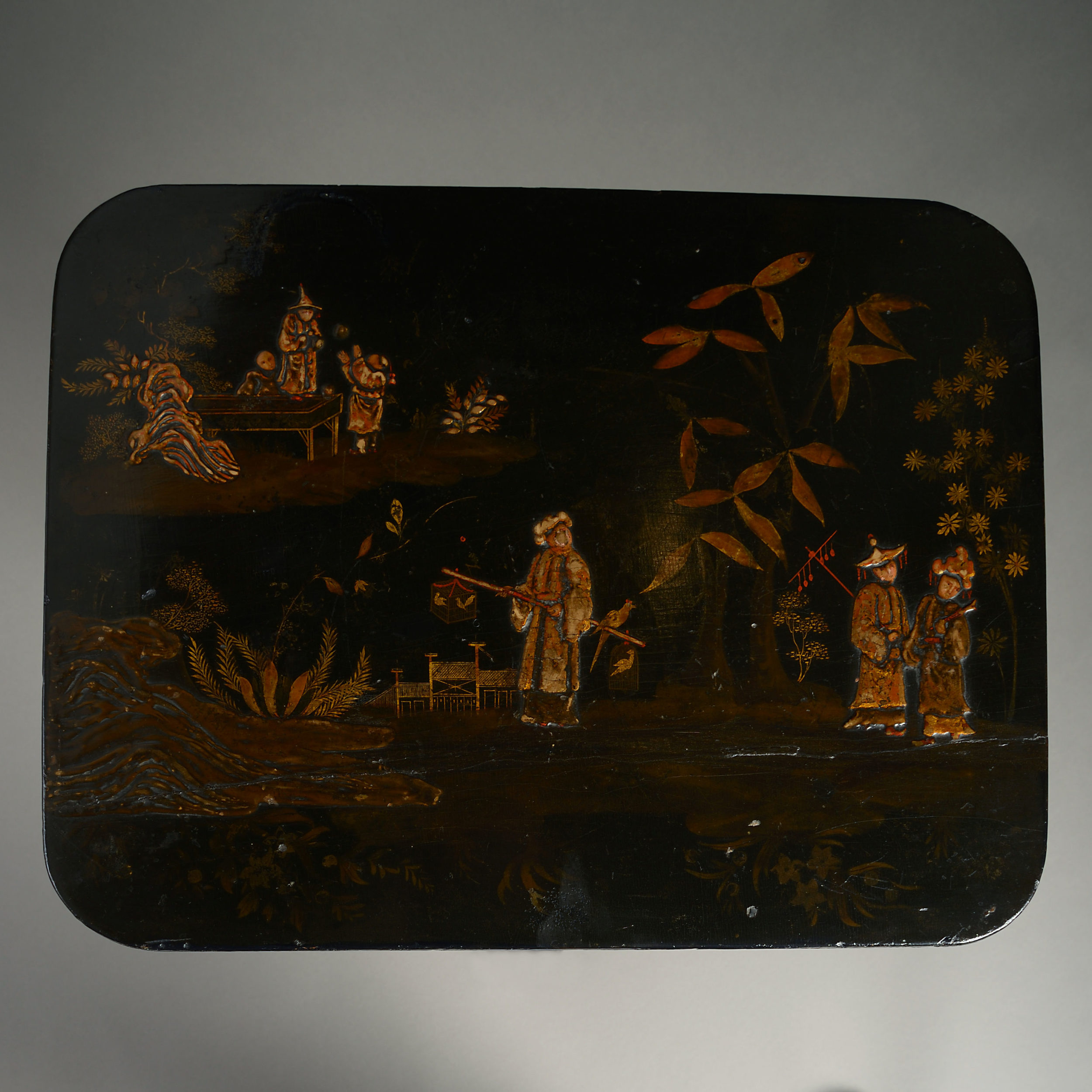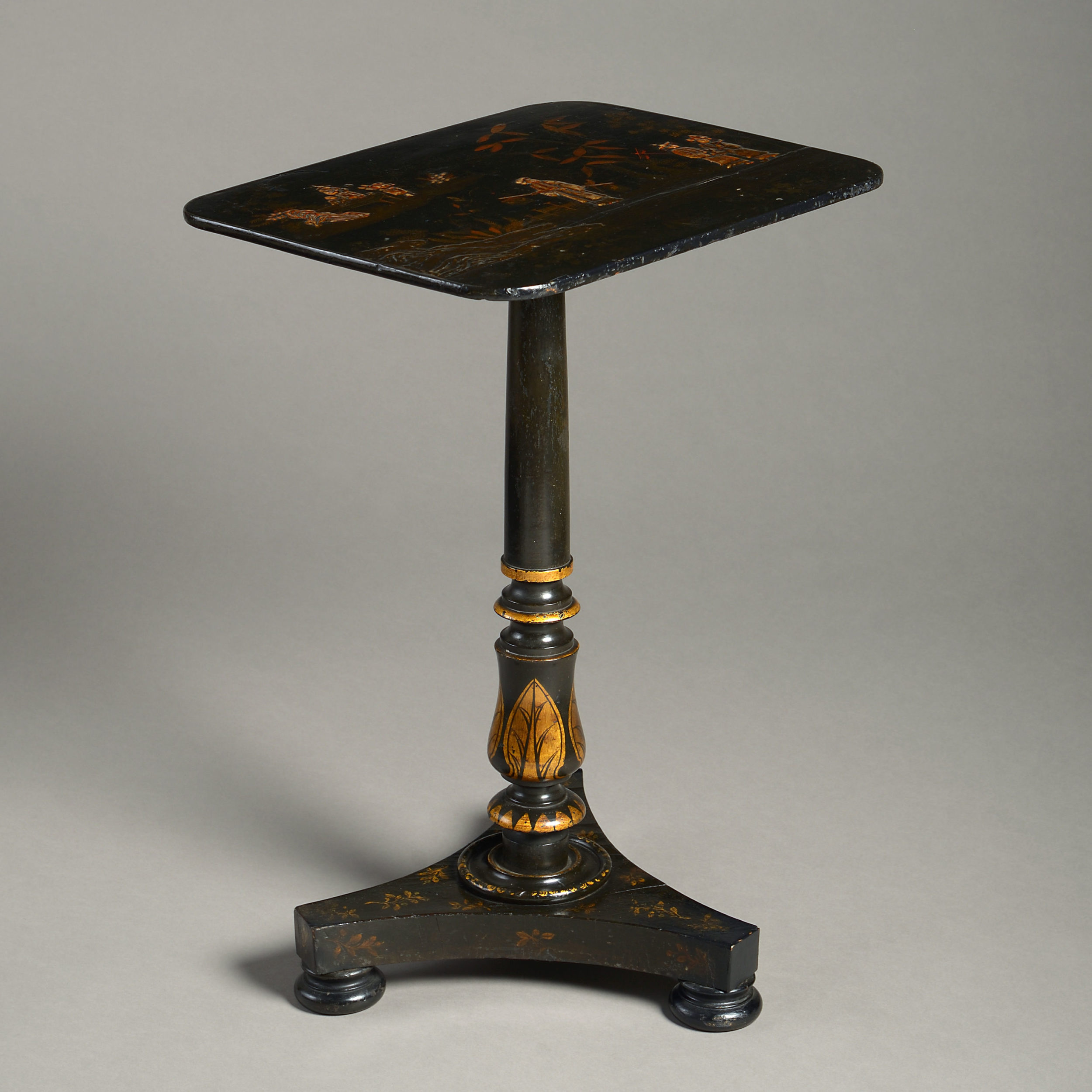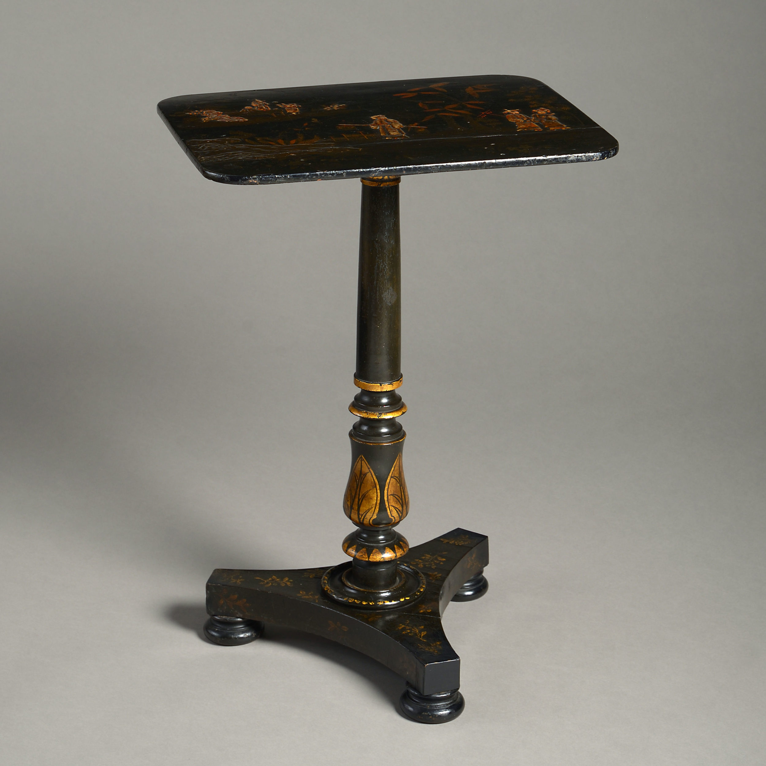 An early 19th century japanned occasional table, having a rectangular top decorated with chinoiseries, the turned stem and triform plinth base with gilded decoration.