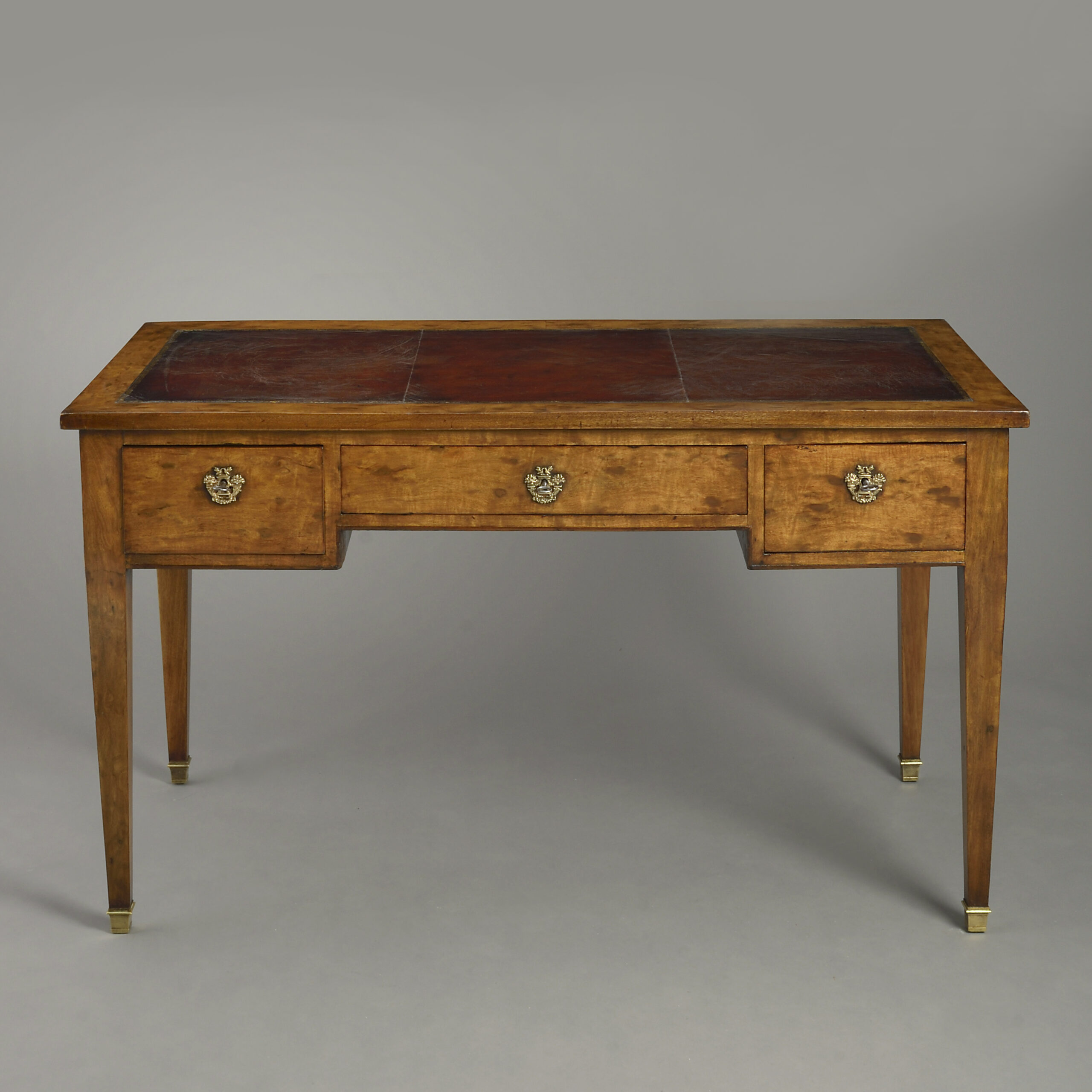 An early 19th century plum pudding mahogany bureau plat, having a leather top above a central long drawer and two flanking drawers, all raised on square tapering legs with brass sabots.
