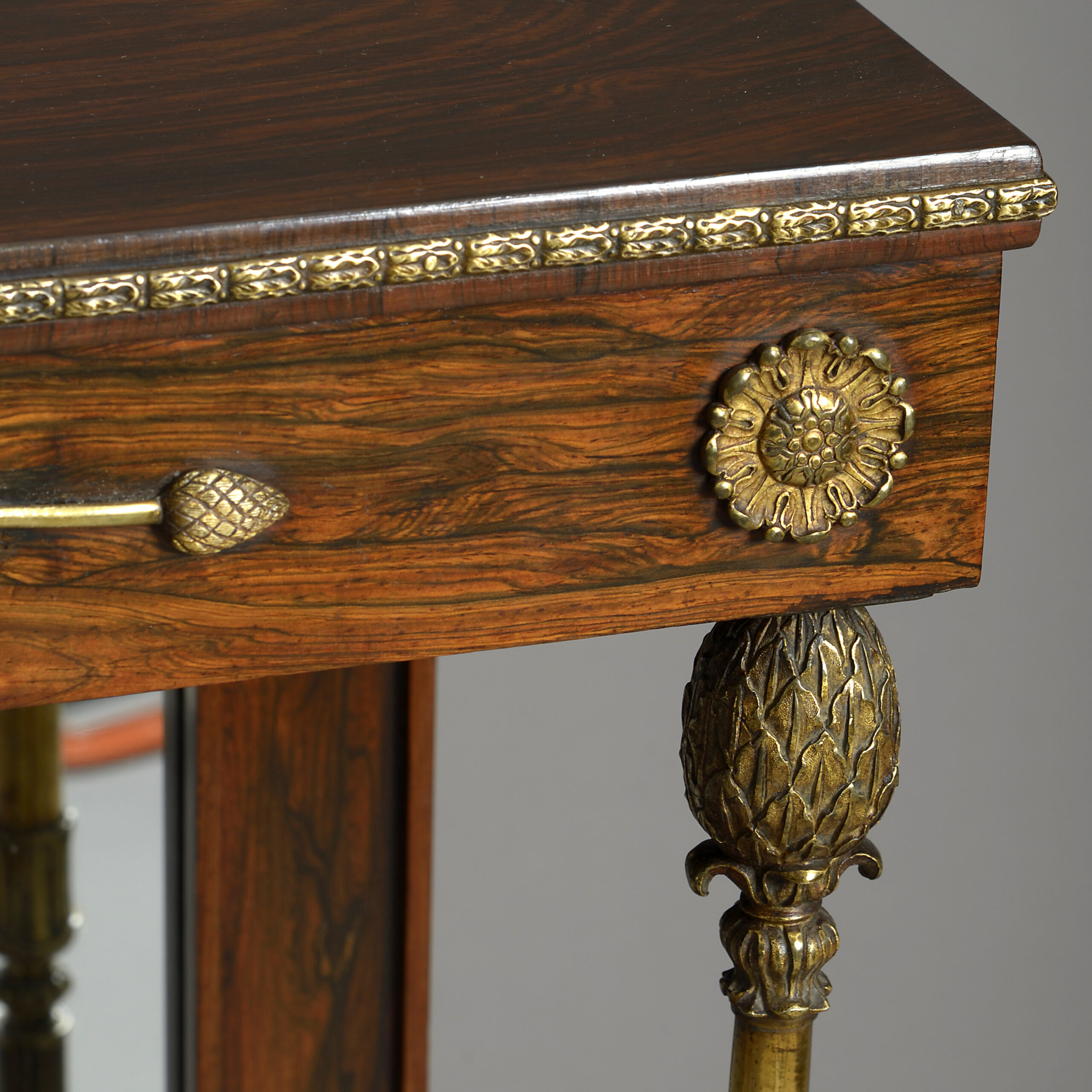 An early nineteenth century Regency Period rosewood console table of small scale, the overhanging top with applied brass beading, the frieze with applied paterae and foliate mounts, the original mirrored back behind two ormolu spear supports, all terminating on a plinth base.