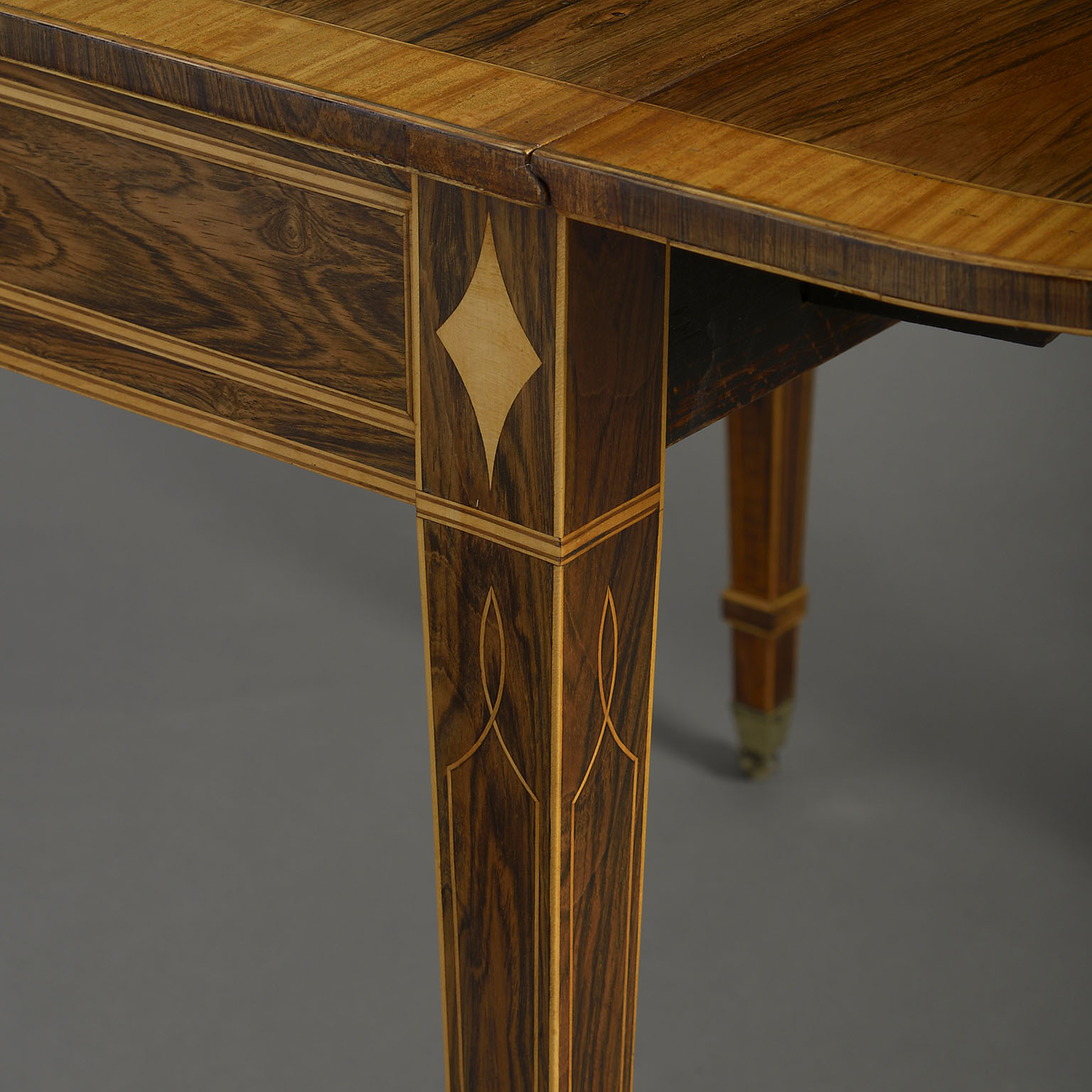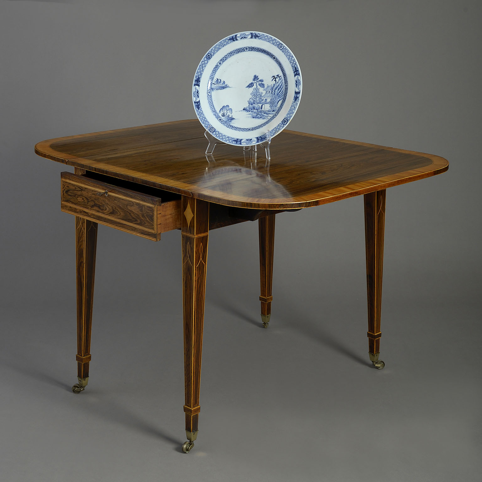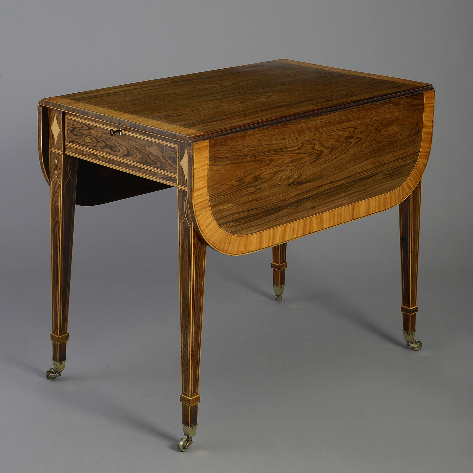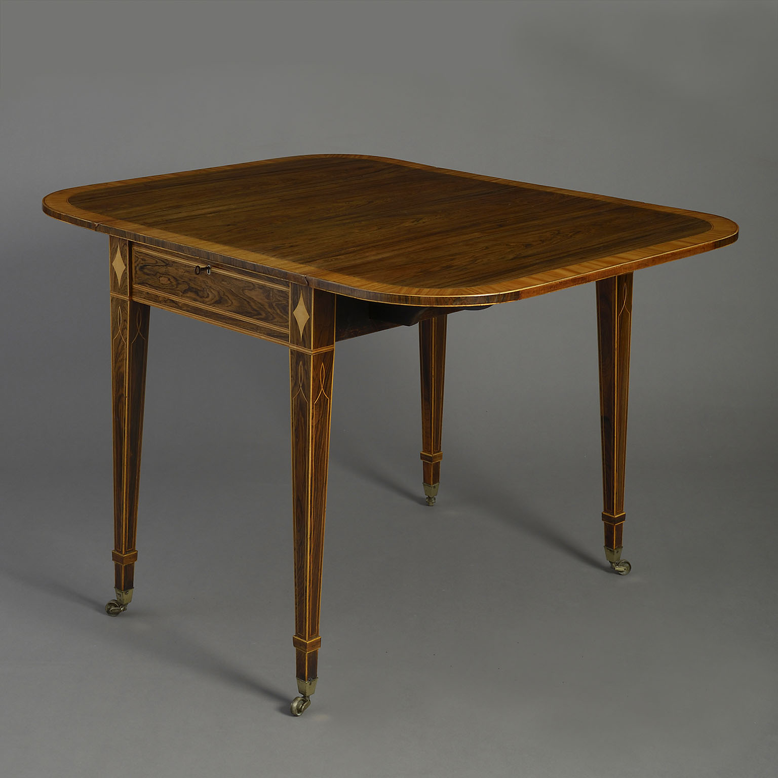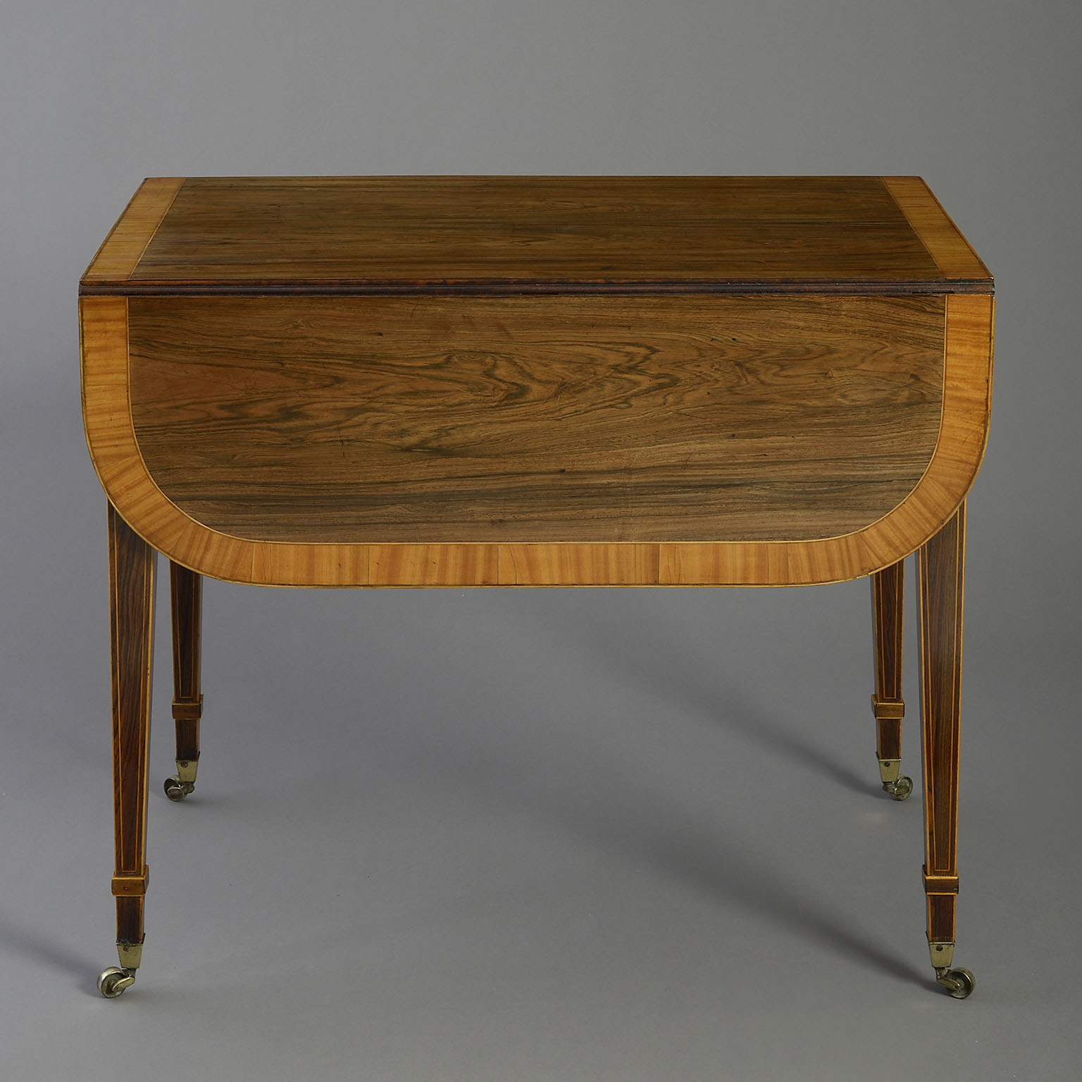 A fine early nineteenth century Regency Period rosewood Pembroke table, the top with D-end flaps and satinwood crossbanding, above a single drawer with tapering legs, all with satinwood stringing and terminating in the original brass castors.