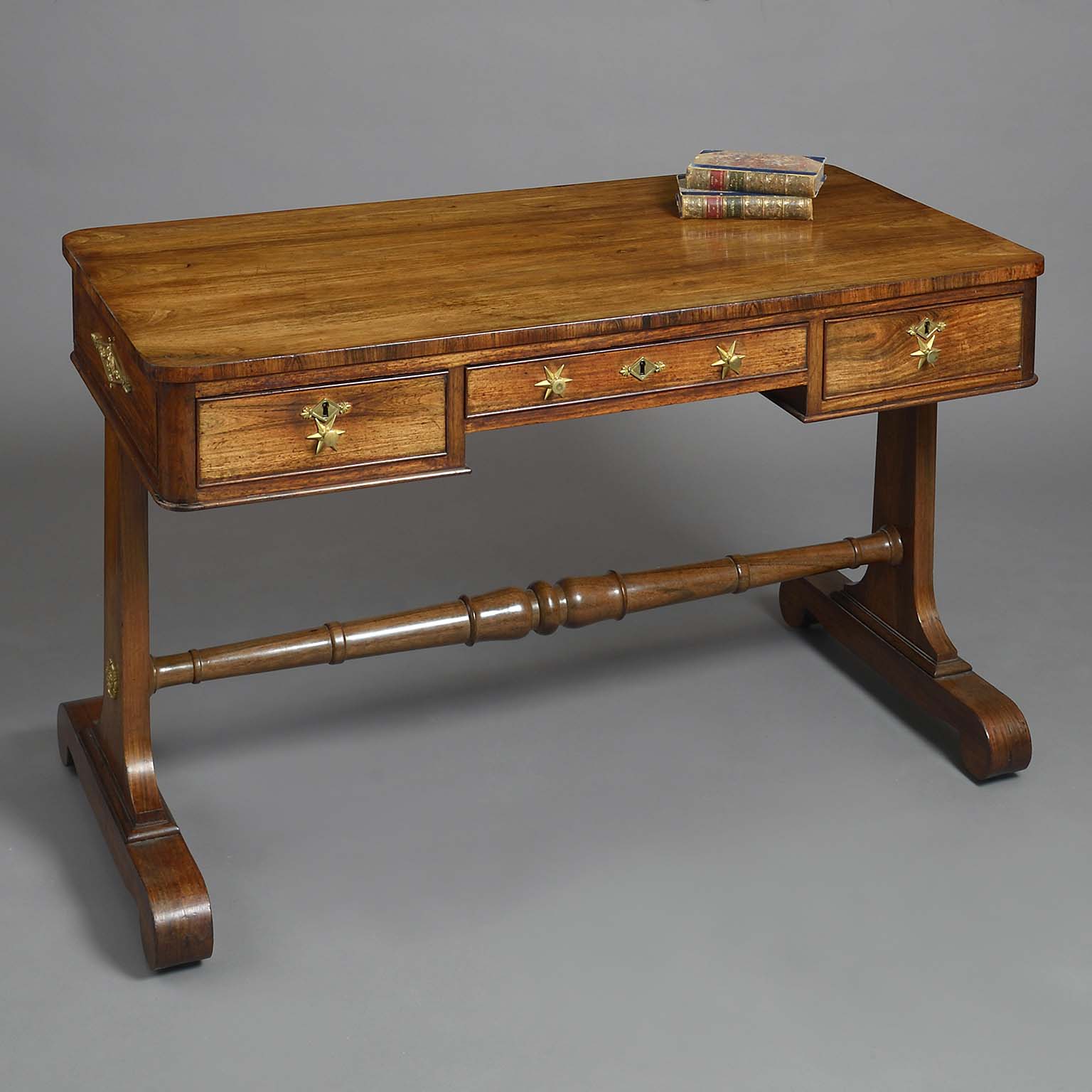 A fine early nineteenth century Regency Period Rosewood writing table, the overhanging top above a configuration of one long and two short drawers with ormolu mounts, the side supports conjoined with a turned stretcher, all set upon brass castors.