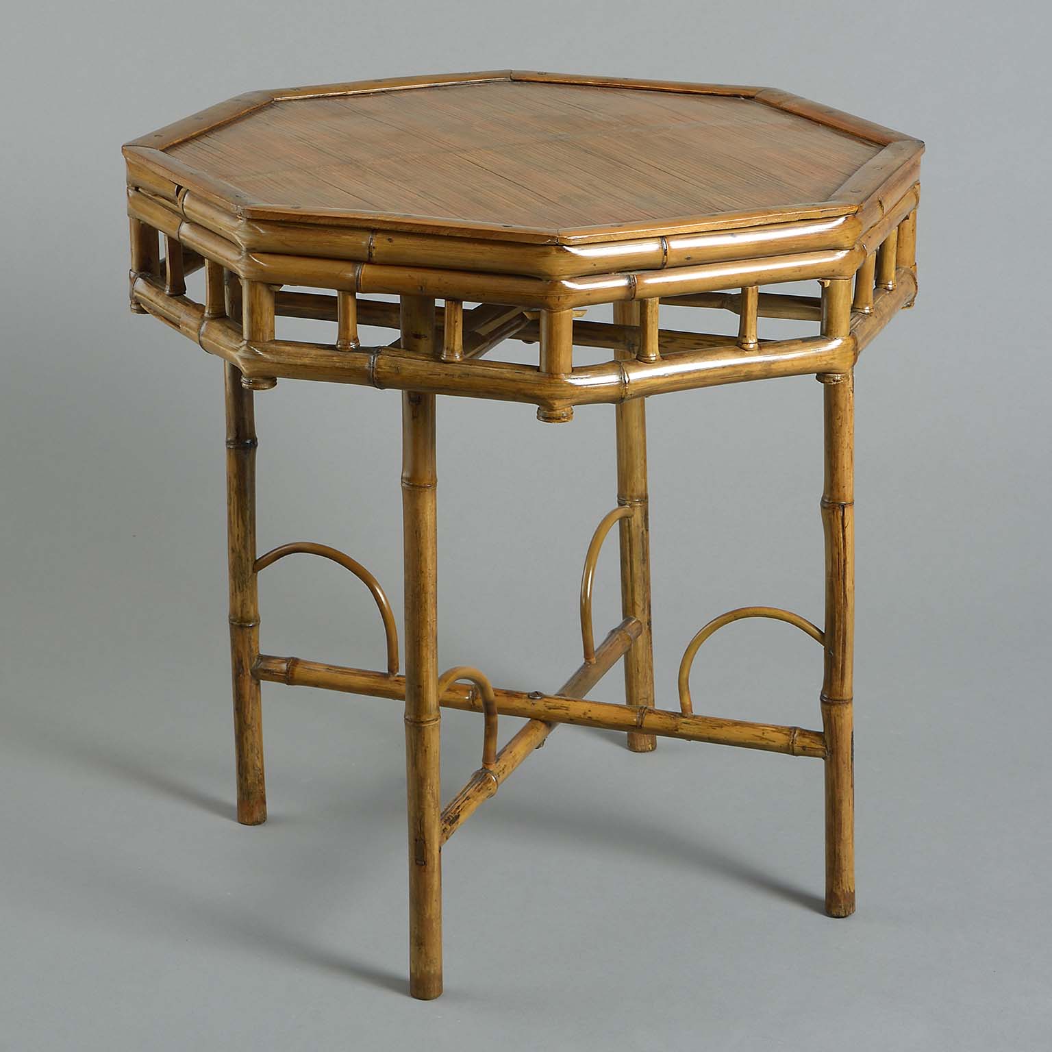 An early twentieth century bamboo table in the Brighton Pavilion Taste, the octagonal top with pierced frieze, set upon four legs with x-form stretchers.