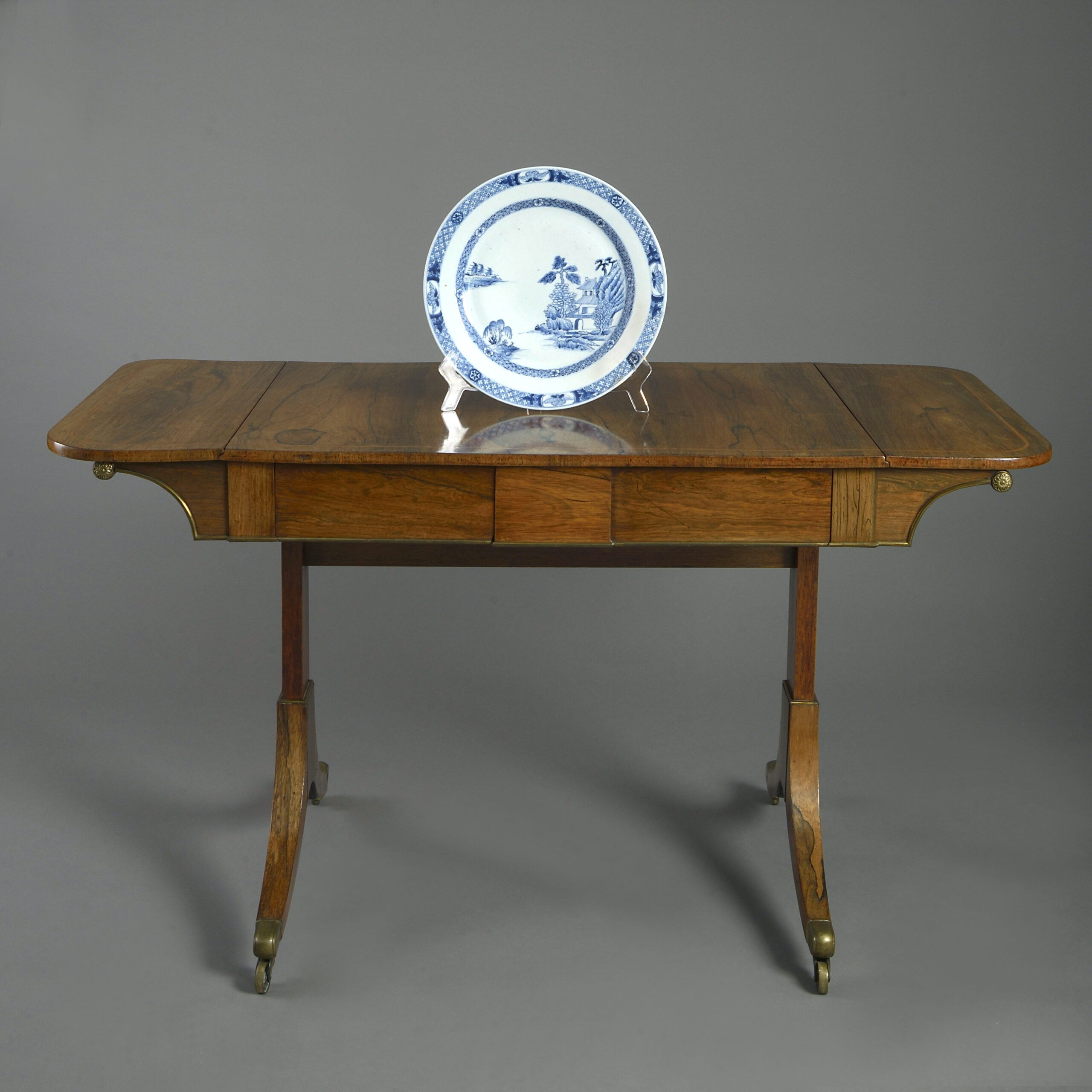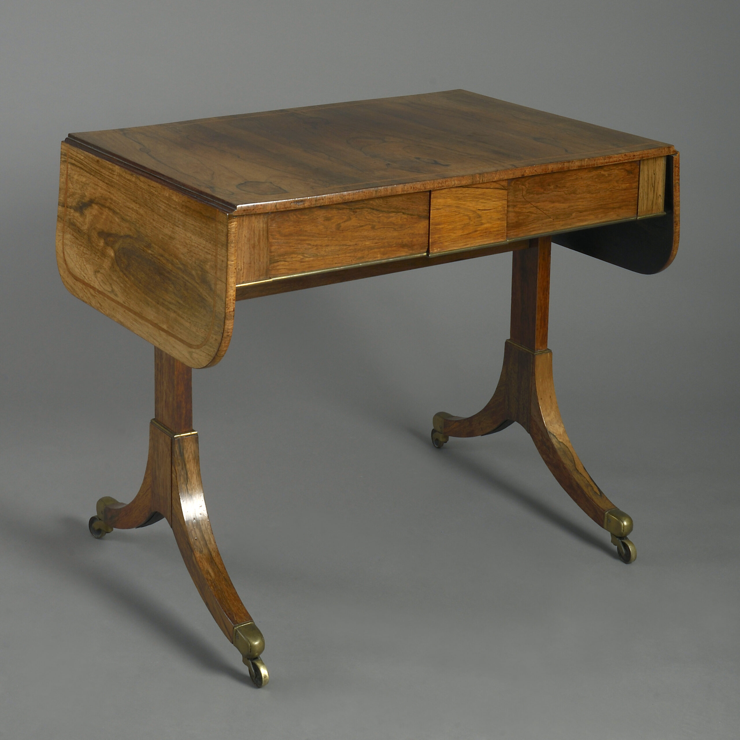 A late eighteenth century George III Period rosewood sofa table, the inlaid top with folding ends set upon a frieze with two drawers and brass mounted folding scrolling brackets, all raised upon end supports with splayed legs terminating in the original brass castors.