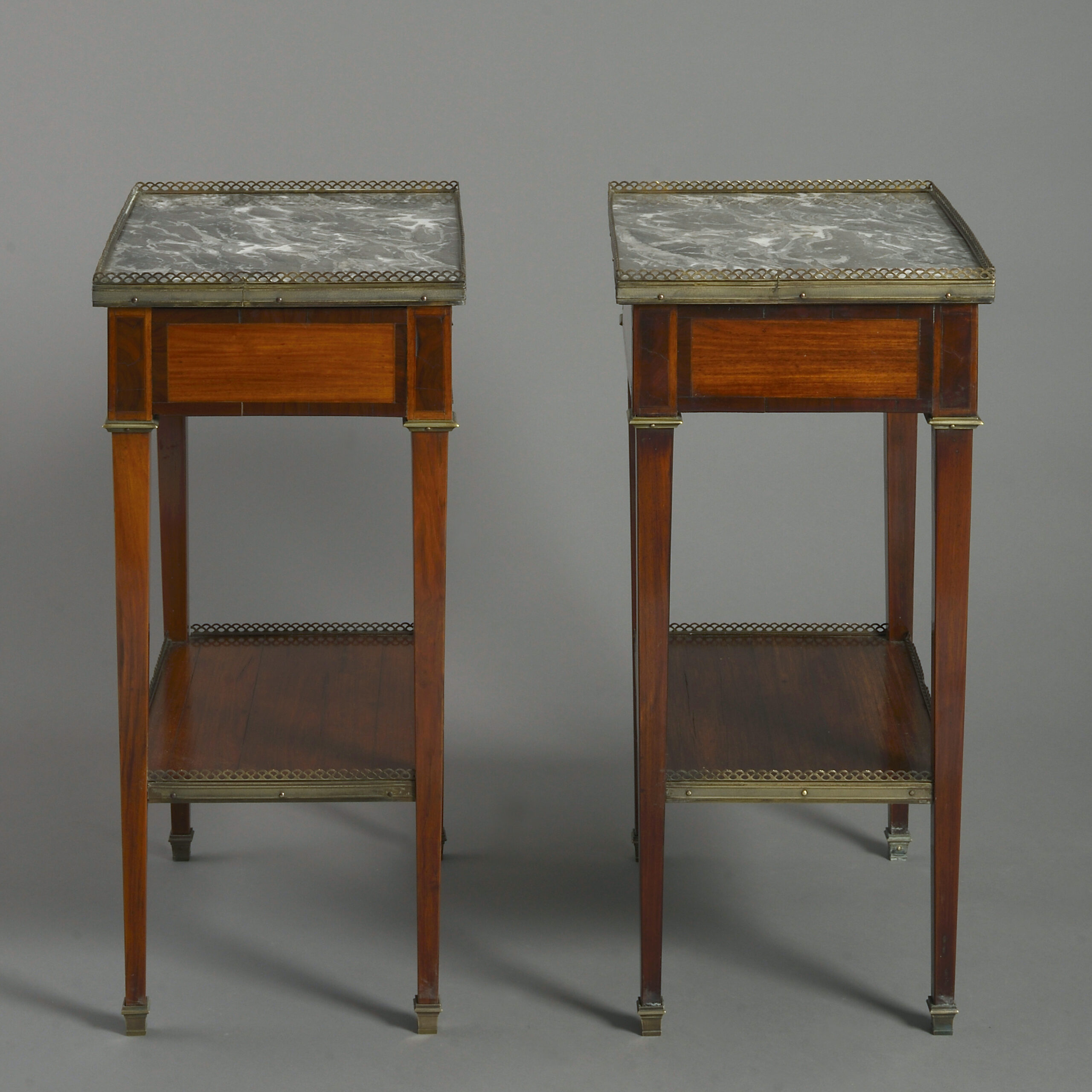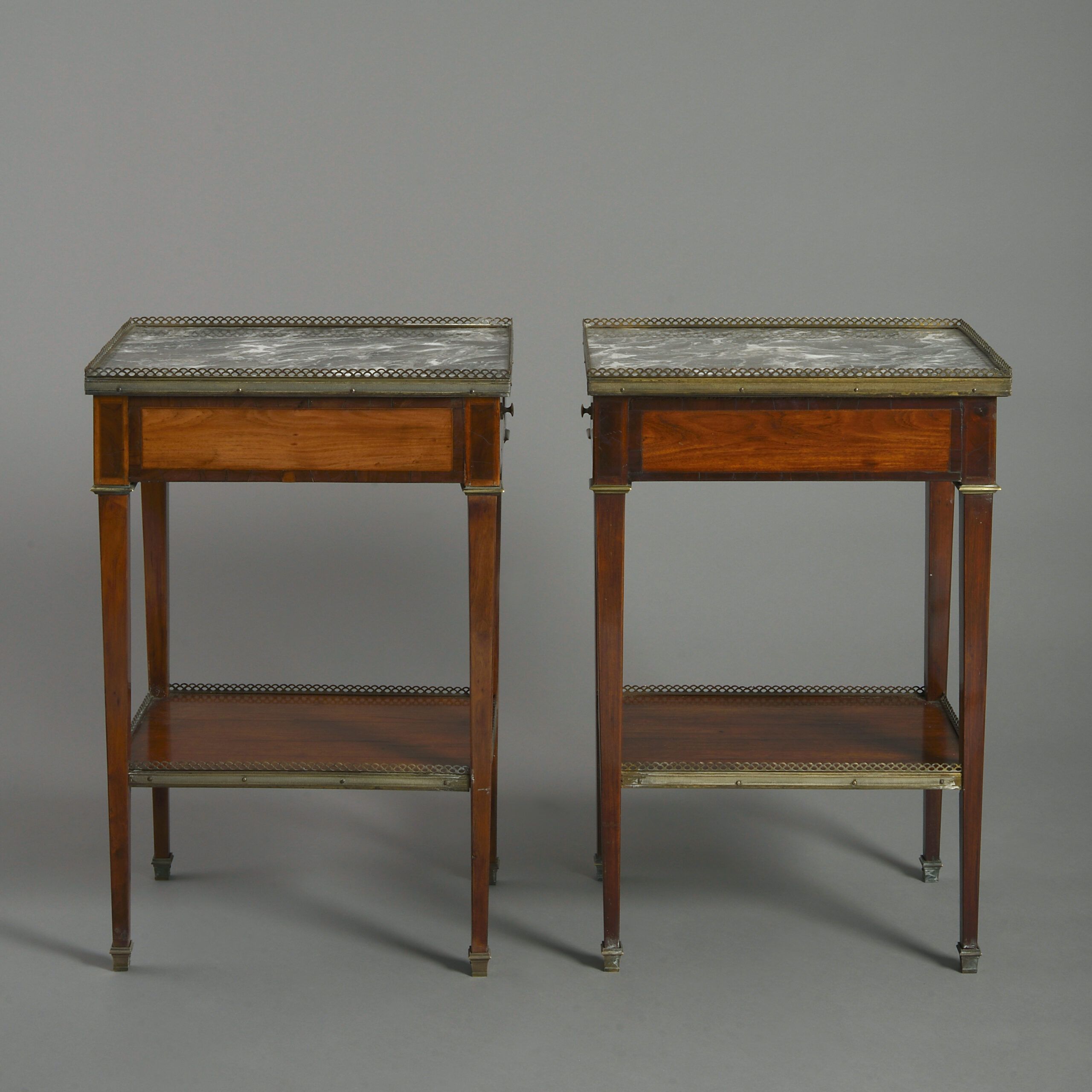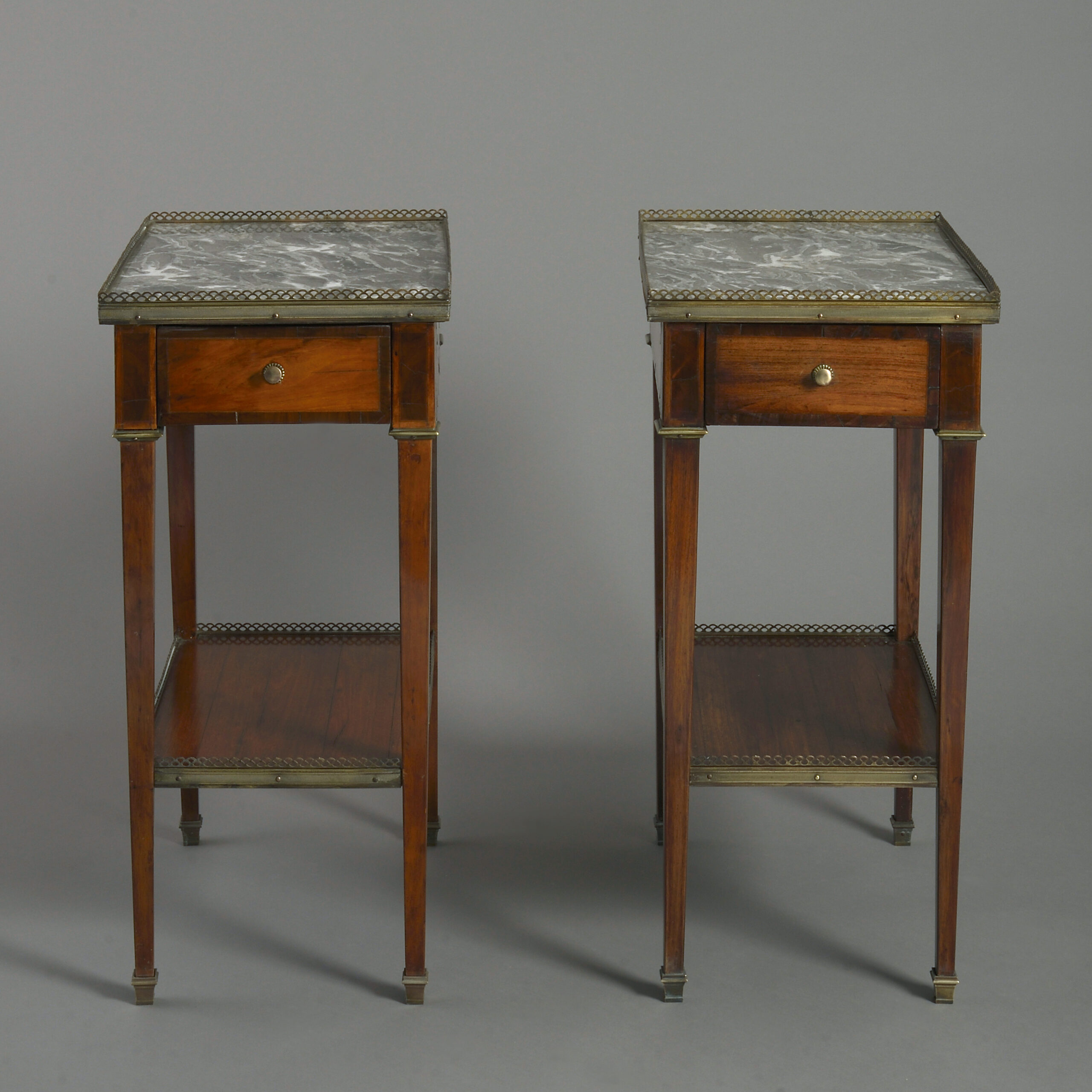 A pair of fine late nineteenth century mahogany and satinwood veneered bedside tables or night stands, each having a pierced brass gallery and marble top above a single drawer, all raised on square tapering legs with a lower galleried shelf and terminating in brass sabots.