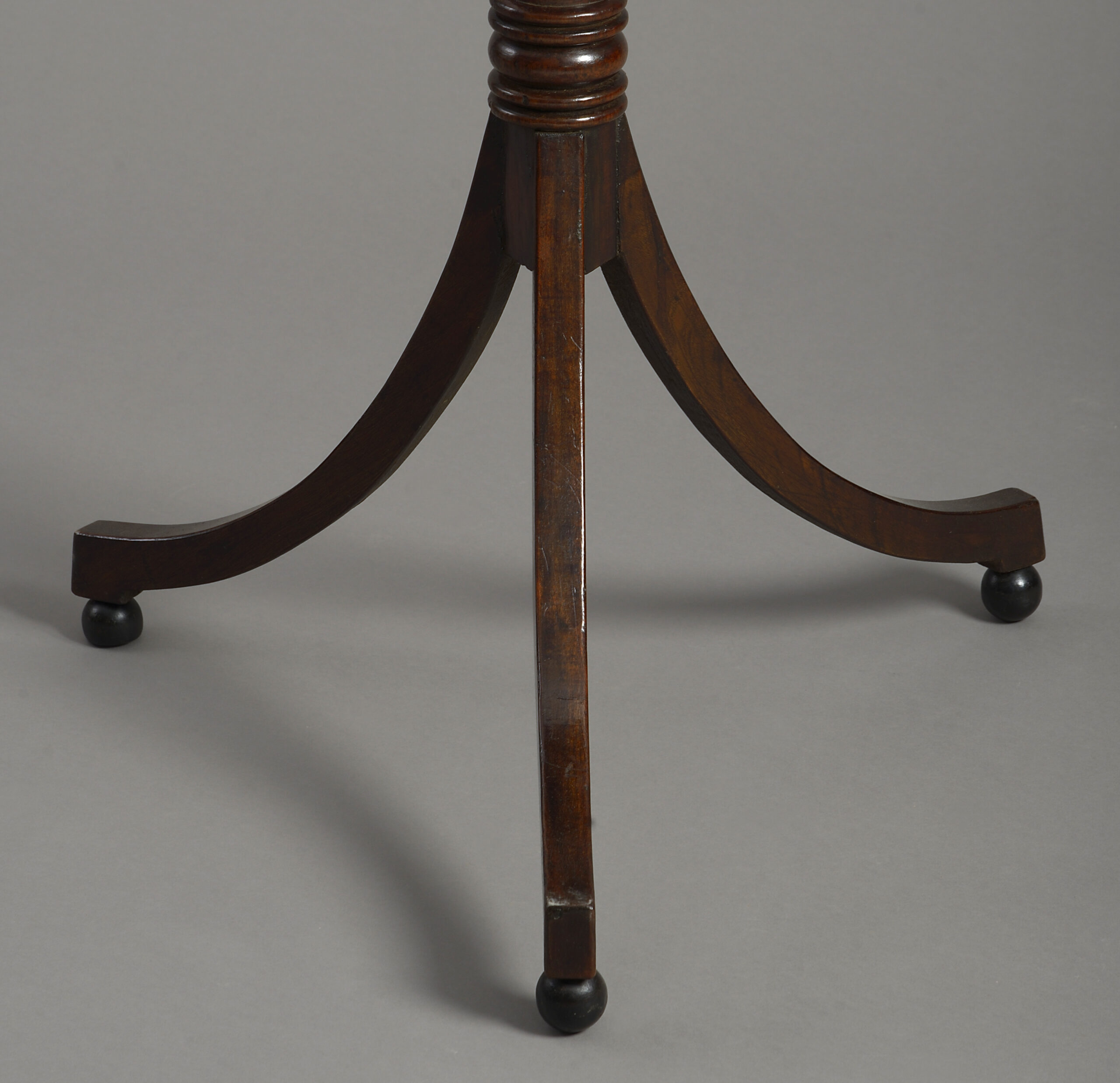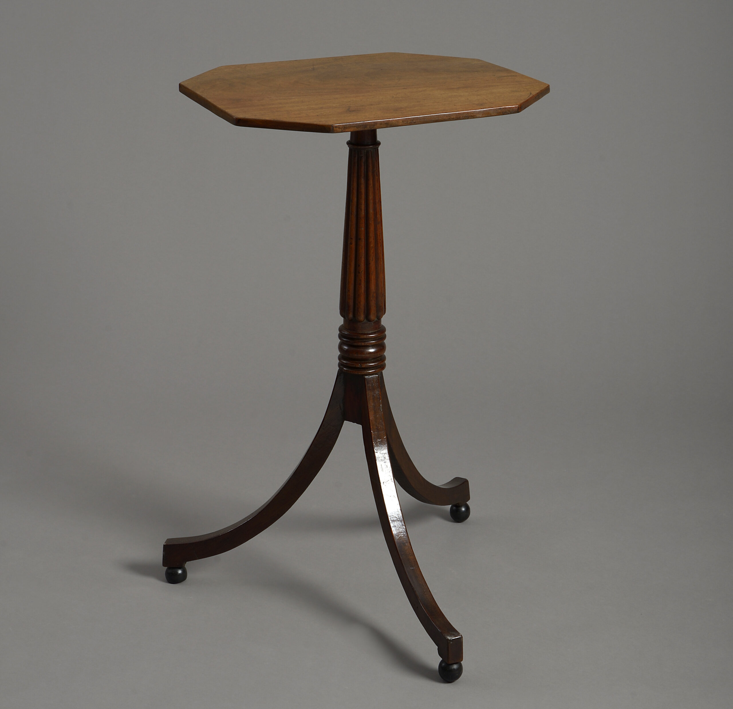 A pair of nineteenth century mahogany end tables in the Regency manner, the elongated octagonal mahogany tops set upon Gillows style reeded stems and raised upon splayed triform legs with ebonised ball feet.