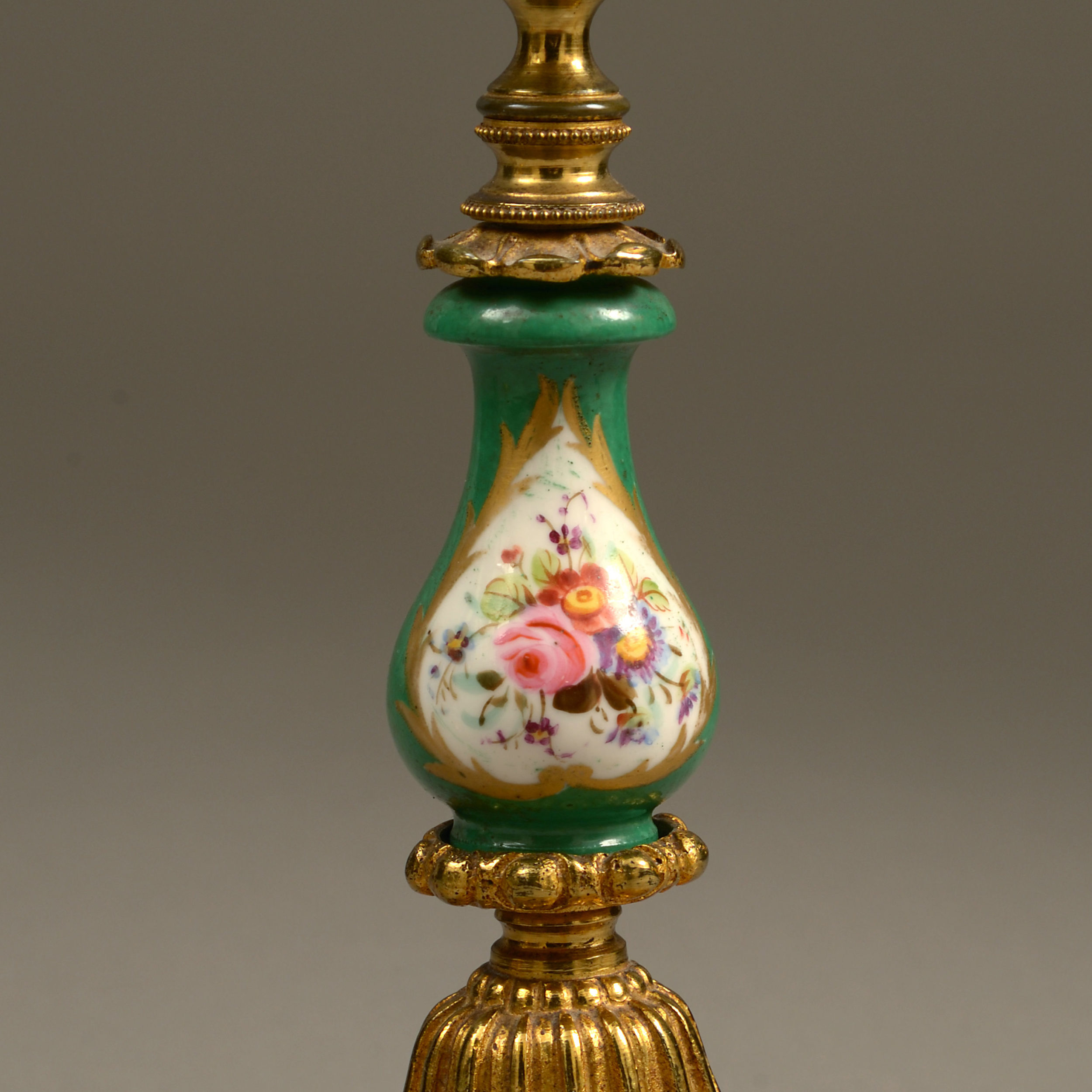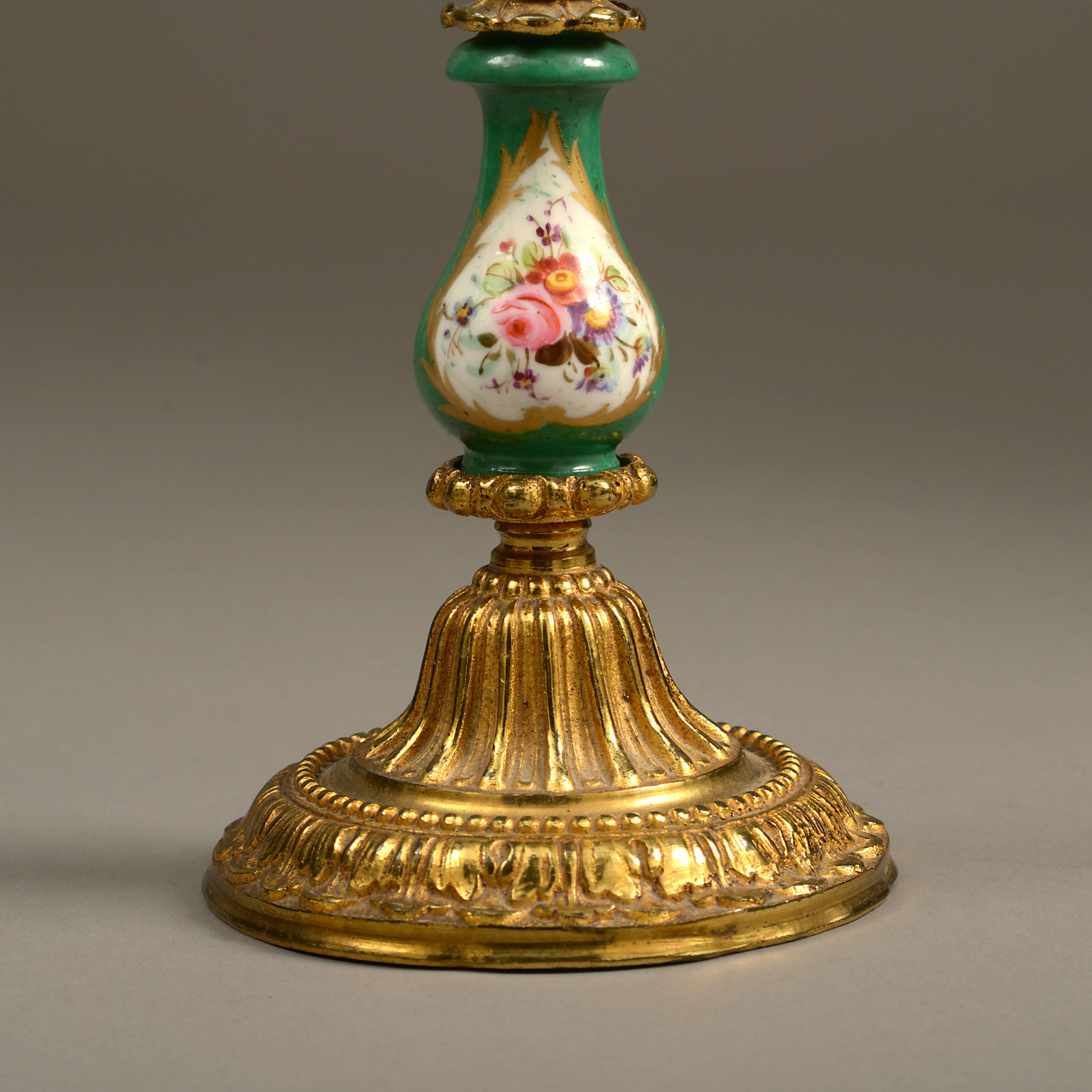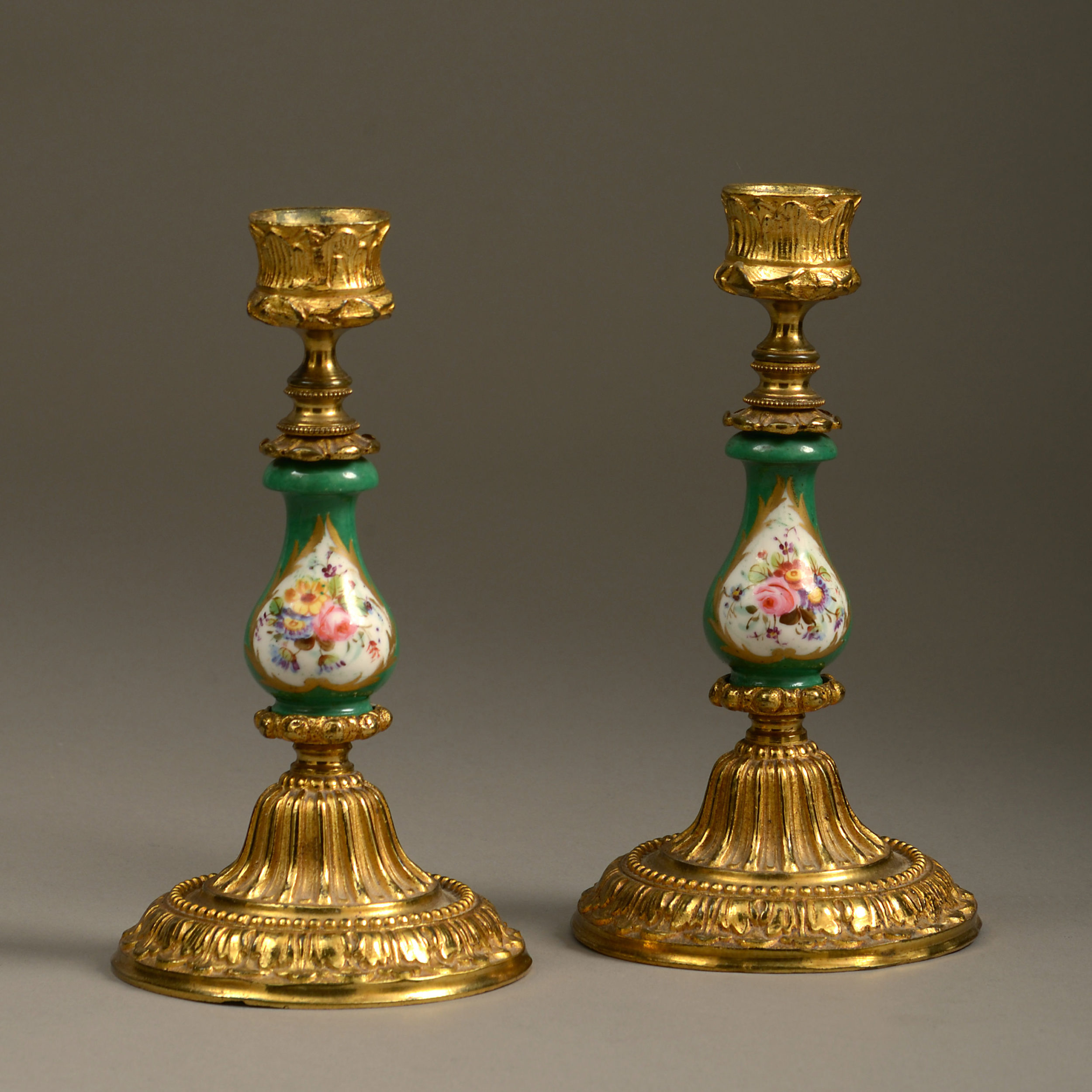 A mid-19th century pair of candlesticks, having ormolu socles and bases in the Louis XVI manner, the stems of Sevres porcelain having floral cartouches on a green ground in the rococo taste.