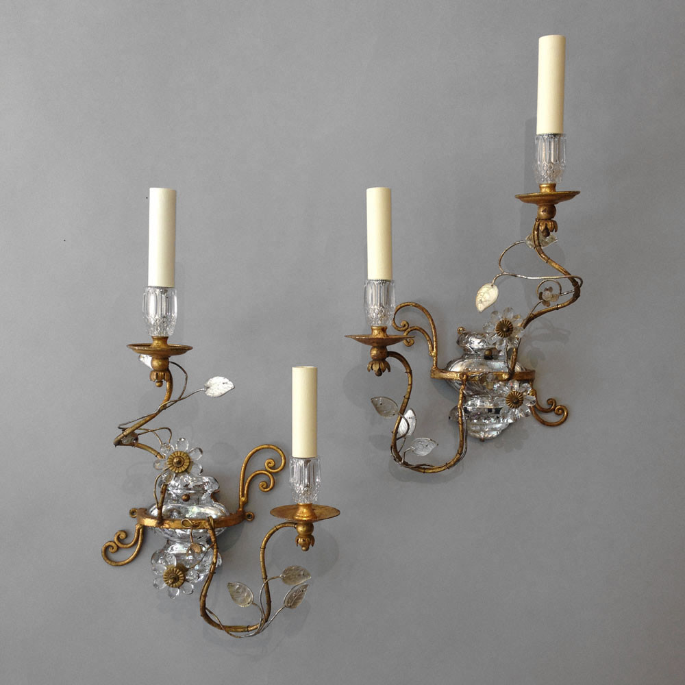A charming mid-century pair of wall lights attributed to Maison Baguès of Paris, the mirrored glass backs of vase form, with scrolling gilt metal candle arms having mirrored glass foliate and floral decoration throughout.