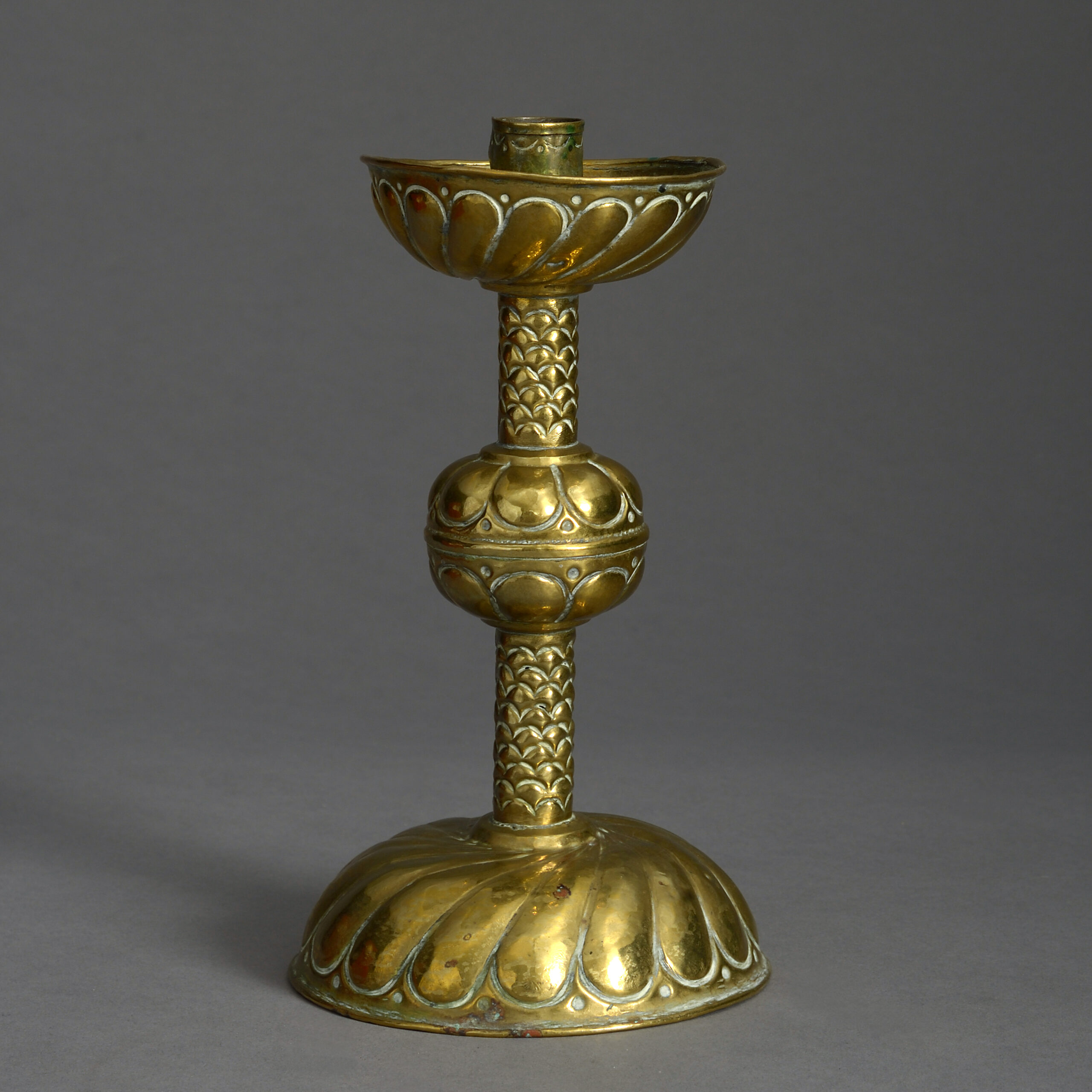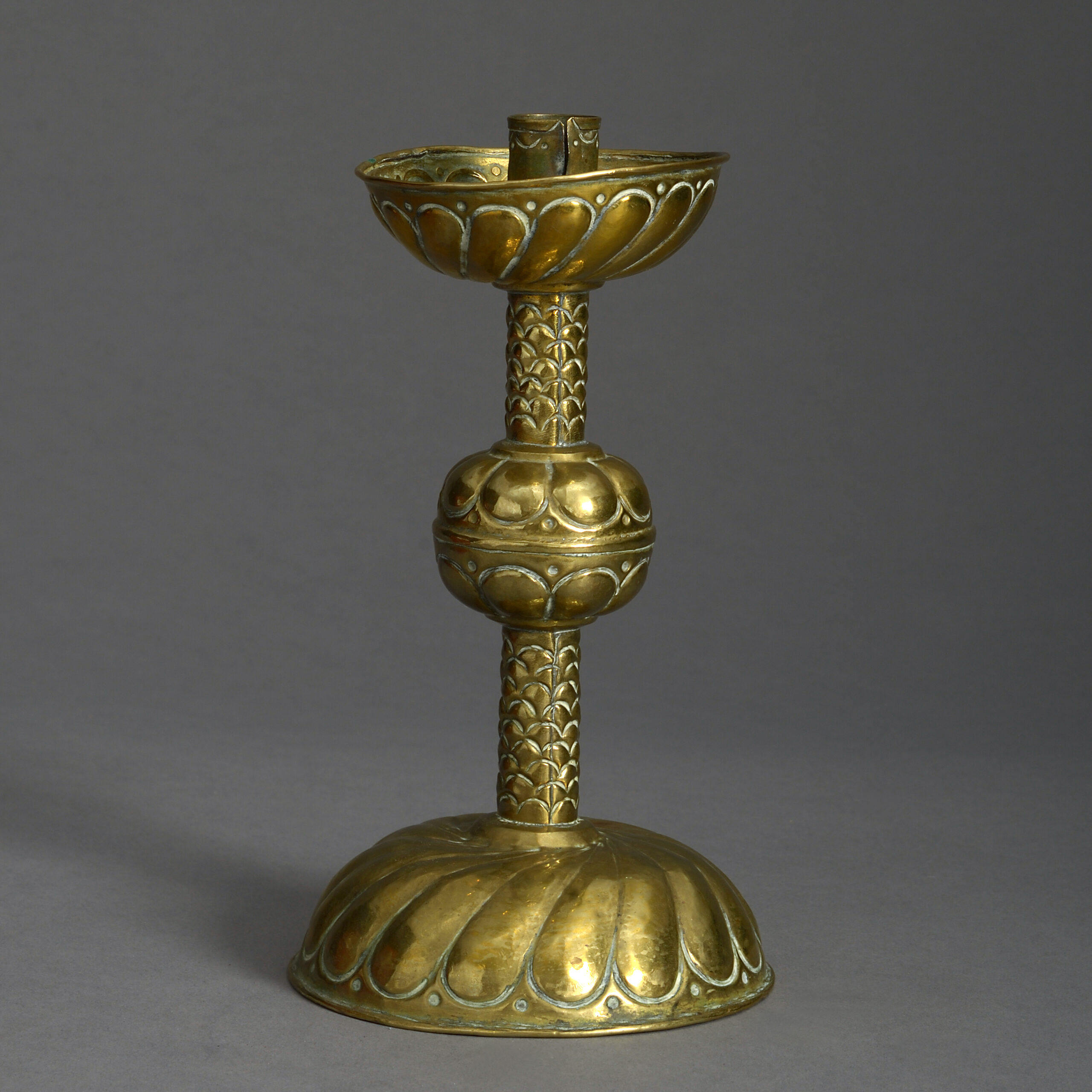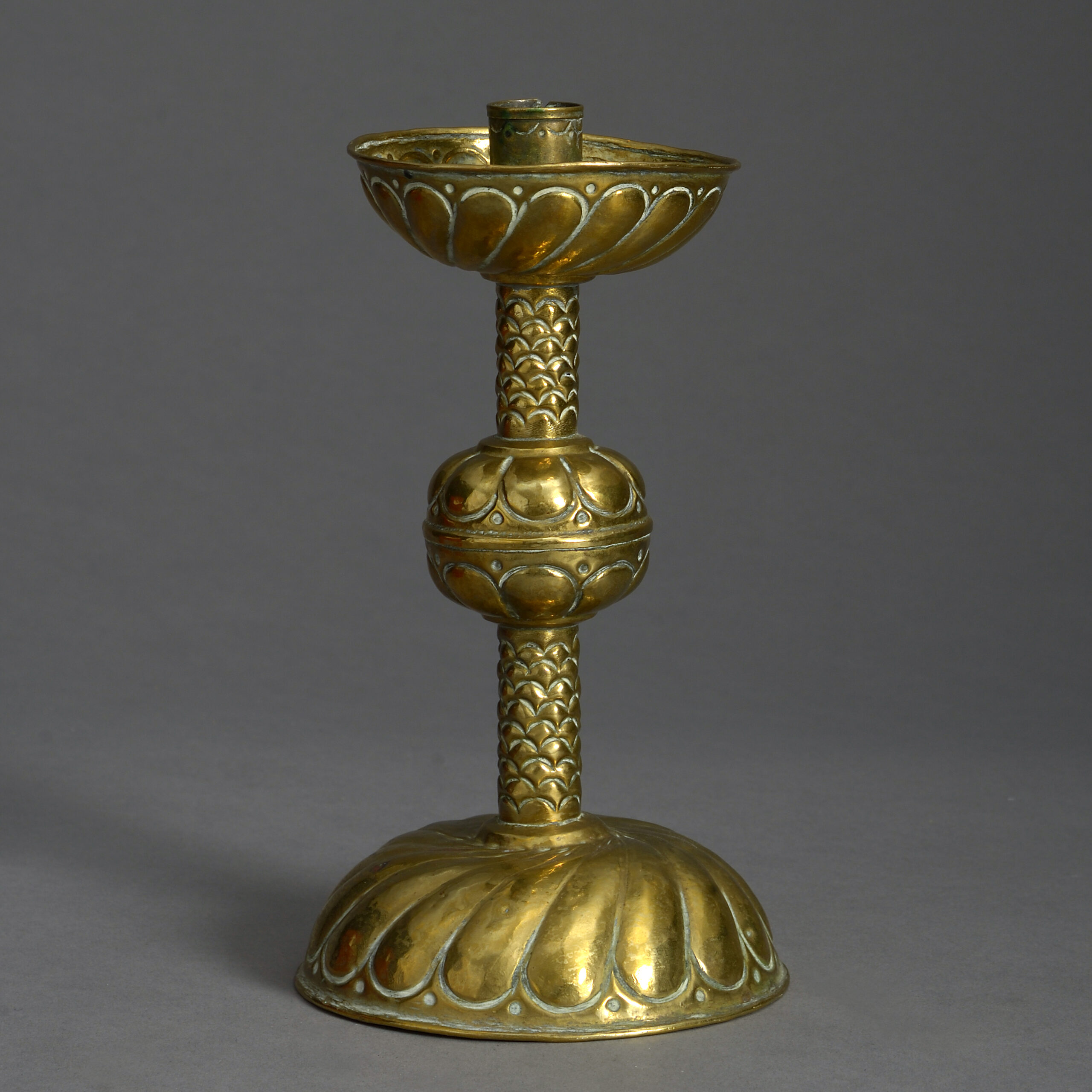 A late seventeenth century brass candlestick, the dished top above a stem with fish scale decoration, set upon a gadrooned base.