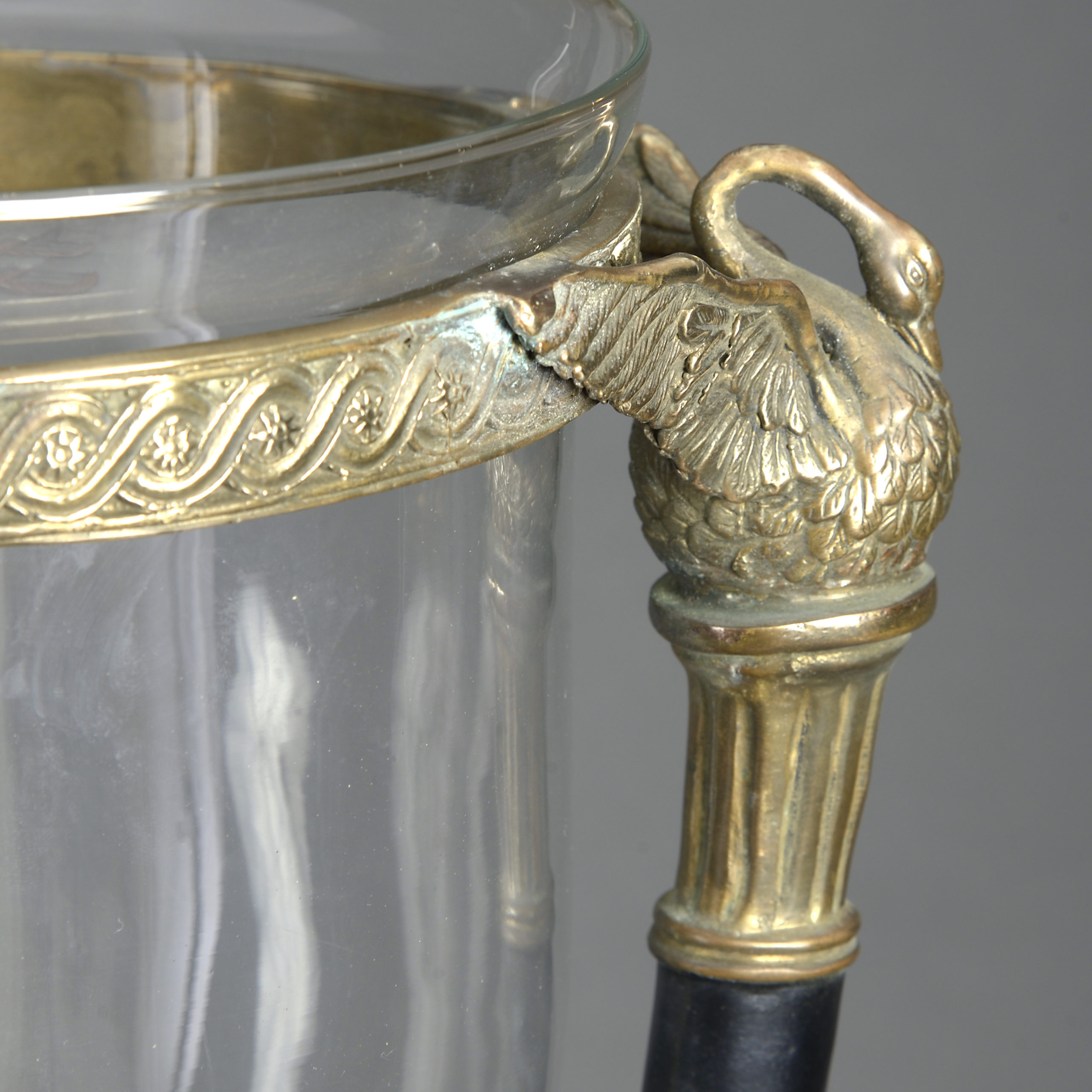 A late nineteenth century storm lantern modelled in the form of a Classical athénienne, the hand-blown glass bowl containing a brass candle socle, held from a brass ring with guilloche motif, supported by three finely cast and chased brass swans, upon brass and bronze monopodia, standing on a concave grey marble plinth.