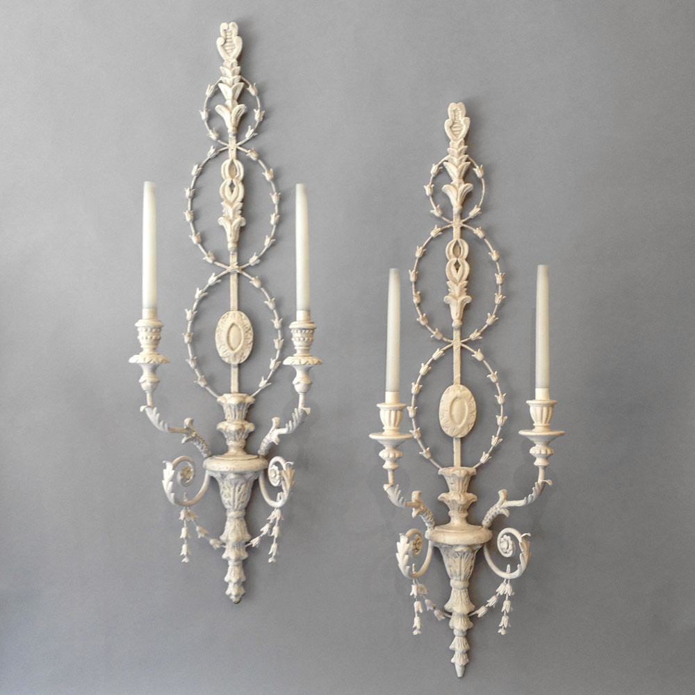 A pair of large scale carved and painted wall lights in the Adam taste, the back of each carved with intertwined husks above a bracket with two scrolling candle arms, one having beaded socles, the other with gadrooned socles.