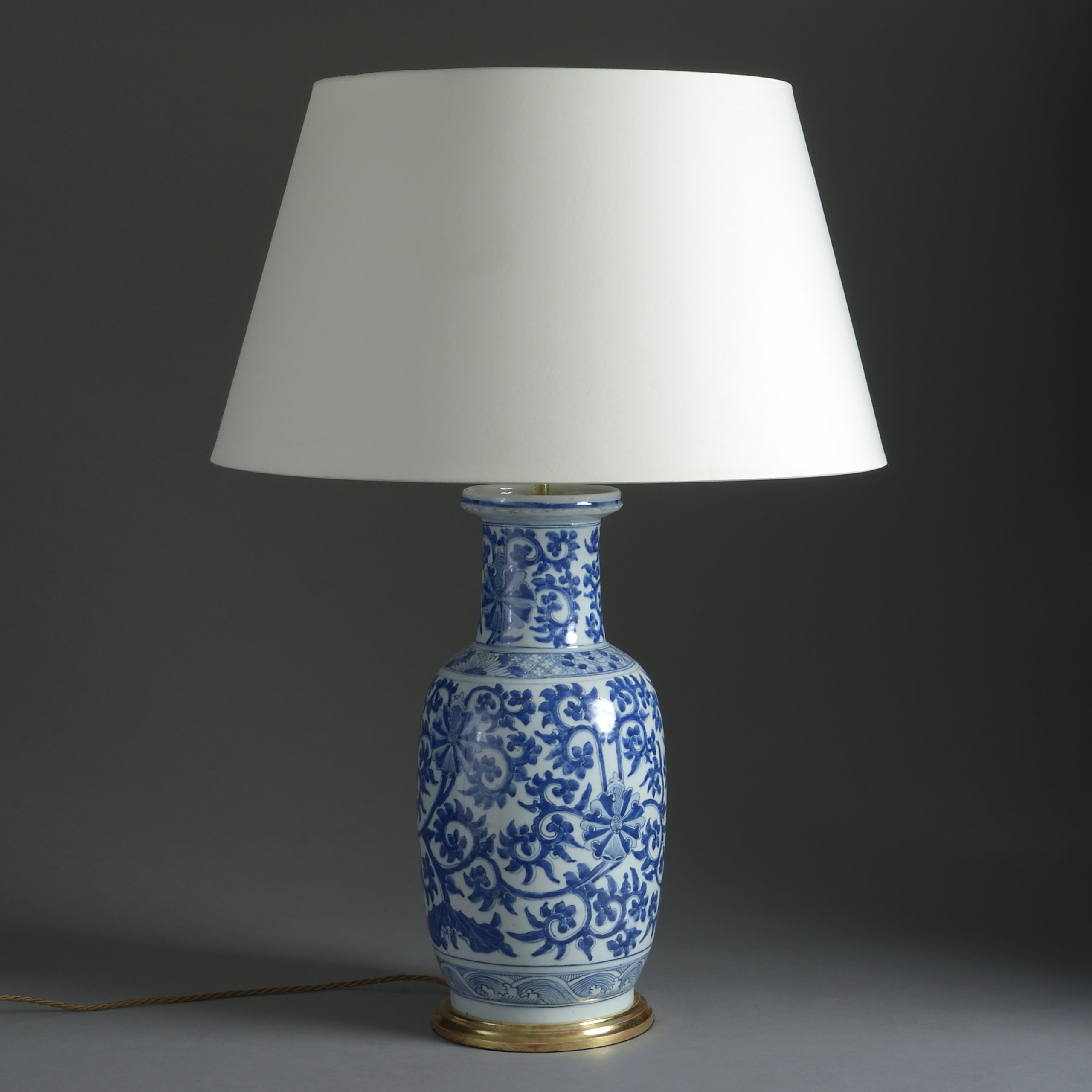 A mid-eighteenth century porcelain vase of good scale, the neck and body decorated with scrolling foliage in blue glazes upon a white ground. Now mounted upon a turned giltwood base as a lamp.